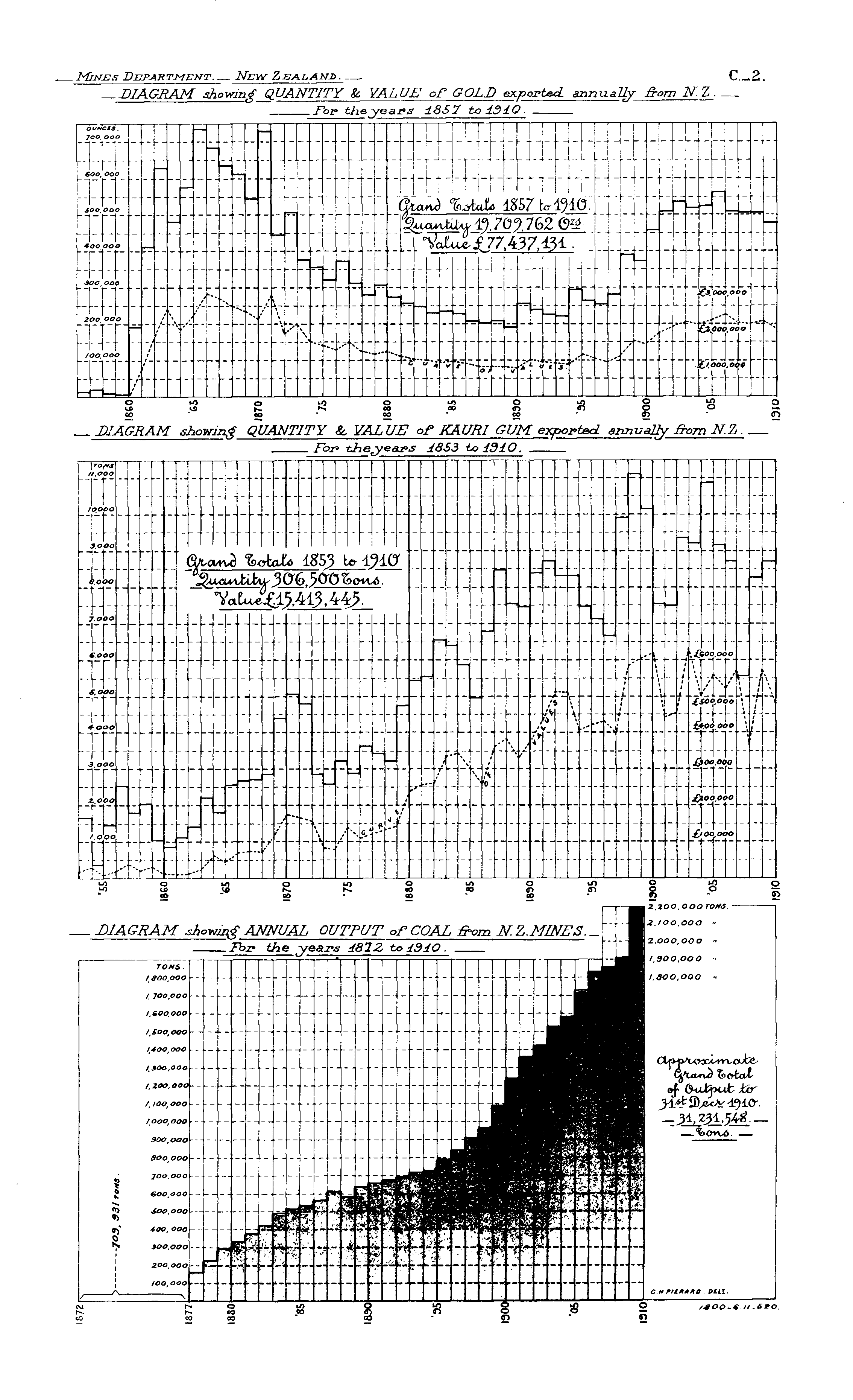Mines Department. New Zealand. DIAGRAM showing QUANTITY & VALUE of GOLD exported annually from N.Z. For the years 1857 to 1910.