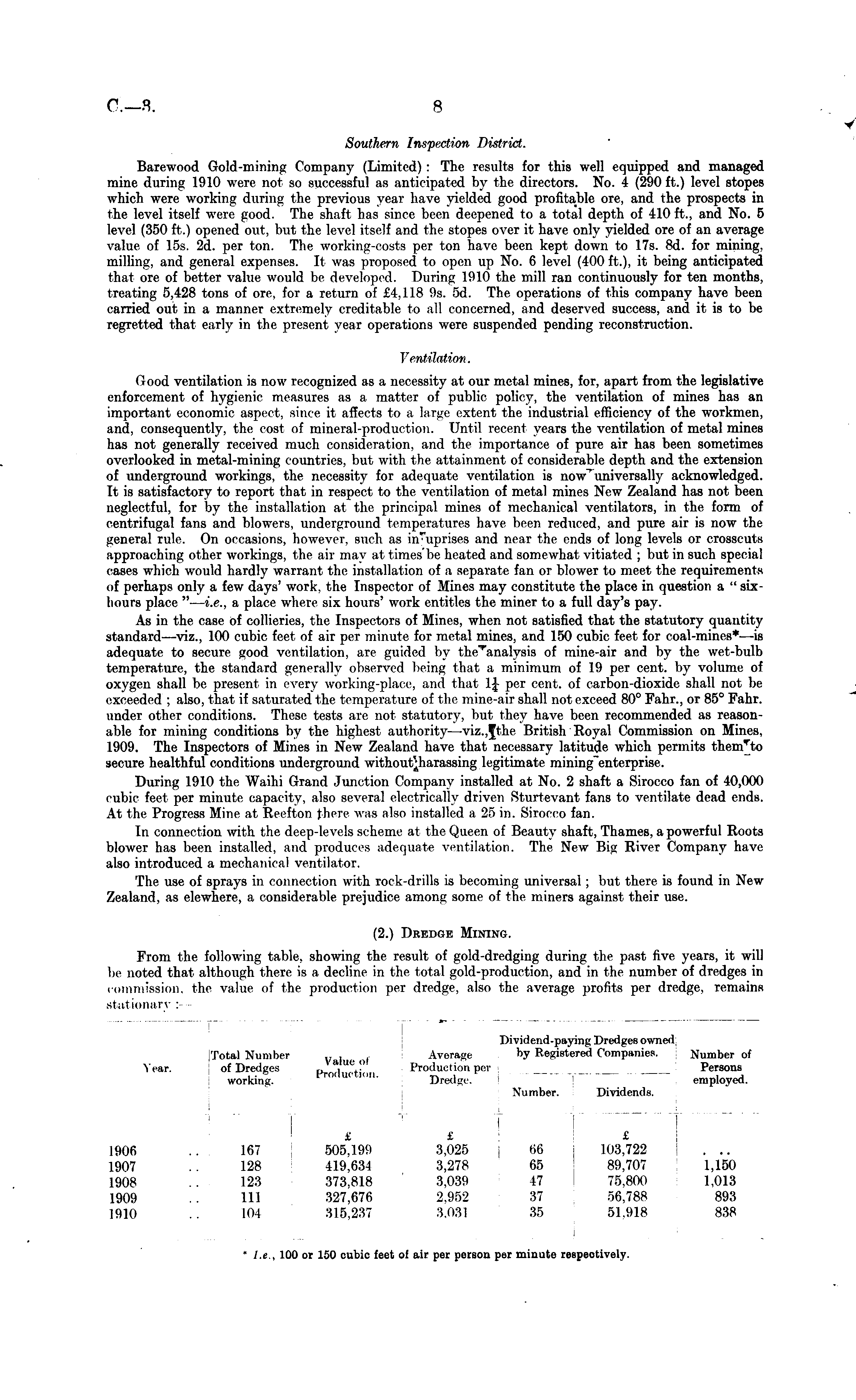 Southern Inspection District. Barewood Gold-mining Company (Limited) : The results for this well equipped and managed mine during 1910 were not so successful as anticipated by the directors. No. 4 (290 ft.) level stopes which were working during the previous year have yielded good profitable ore, and the prospects in the level itself were good. The shaft has since been deepened to a total depth of 410 ft., and No. 5 level (350 ft.) opened out, but the level itself and the stopes over it have only yielded ore of an average value of 15s. 2d. per ton. The working-costs per ton have been kept down to 17s. Bd. for mining, milling, and general expenses. It was proposed to open up No. 6 level (400 ft.), it being anticipated that ore of better value, would be developed. During 1910 the mill ran continuously for ten months, treating 5,428 tons of ore, for a return of £4,118 9s. sd. The operations of this company have been carried out in a manner extremely creditable to all concerned, and deserved success, and it is to be regretted that early in the present year operations were suspended pending reconstruction. Ventilation. flood ventilation is now recognized as a necessity at our metal mines, for, apart from the legislative enforcement of hygienic measures as a matter of public policy, the ventilation of mines has an important economic aspect, since it affects to a large extent the industrial efficiency of the workmen, and, consequently, the cost of mineral-production. Until recent years the ventilation of metal mines has not generally received much consideration, and the importance of pure air has been sometimes overlooked in metal-mining countries, but with the attainment of considerable depth and the extension of underground workings, the necessity for adequate ventilation is no universally acknowledged. It is satisfactory to report that in respect to the ventilation of metal mines New Zealand has not been neglectful, for by the installation at the principal mines of mechanical ventilators, in the form of centrifugal fans and blowers, underground temperatures have been reduced, and pure air is now the general rule. On occasions, however, such as inoiprises and near the ends of long levels or crosscuts approaching other workings, the air may at times'be heated and somewhat vitiated ; but in such special cases which would hardly warrant the installation of a separate fan or blower to meet the requirements of perhaps only a few days' work, the Inspector of Mines may constitute the place in question a " sixhours place " — i.e.. a place where six hours' work entitles the miner to a full day's pay. As in the case of collieries, the Inspectors of Mines, when not satisfied that the statutory quantity standard—-viz., 100 cubic feet of air per minute for metal mines, and 150 cubic feet for coal-mines* —is adequate to secure good ventilation, are guided by the T analysis of mine-air and by the wet-bulb temperature, the standard generally observed being that a minimum of 19 per cent, by volume of oxygen shall be present in every working-place, and that 1J per cent, of carbon-dioxide shall not be exceeded ; also, that if saturated the temperature of the mine-air shall not exceed 80° Fahr., or 85° Fahr. nnder other conditions. These tests are not statutory, but they have been recommended as reasonable for mining conditions by the highest authority— British Royal Commission on Mines, 1909. The Inspectors of Mines in New Zealand have that necessary latitude which permits them'to secure healthful conditions underground withoutjharassing legitimate miningenterprise. During 1910 the Waihi Grand Junction Company installed at No. 2 shaft a Sirocco fan of 40,000 cubic feet per minute capacity, also several electrically driven Sturtevant fans to ventilate dead ends. At the Progress Mine at Reefton (ihere was also installed a 25 in. Sirocco fan. In connection with the deep-levels scheme at the Queen of Beauty shaft, Thames, a powerful Roots blower has been installed, and produces adequate ventilation. The New Big River Company have also introduced a mechanical ventilator. The use of sprays in connection with rock-drills is becoming universal; but there is found in New Zealand, as elewhere, a considerable prejudice among some of the miners against their use. (2.) Dredge Mining. From the following table, showing the result of gold-dredging during the past five years, it will be noted that although there is a decline in the total gold-production, and in the number of dredges in commission, the value of the production per dredge, also the average profits per dredge, remains stationary :