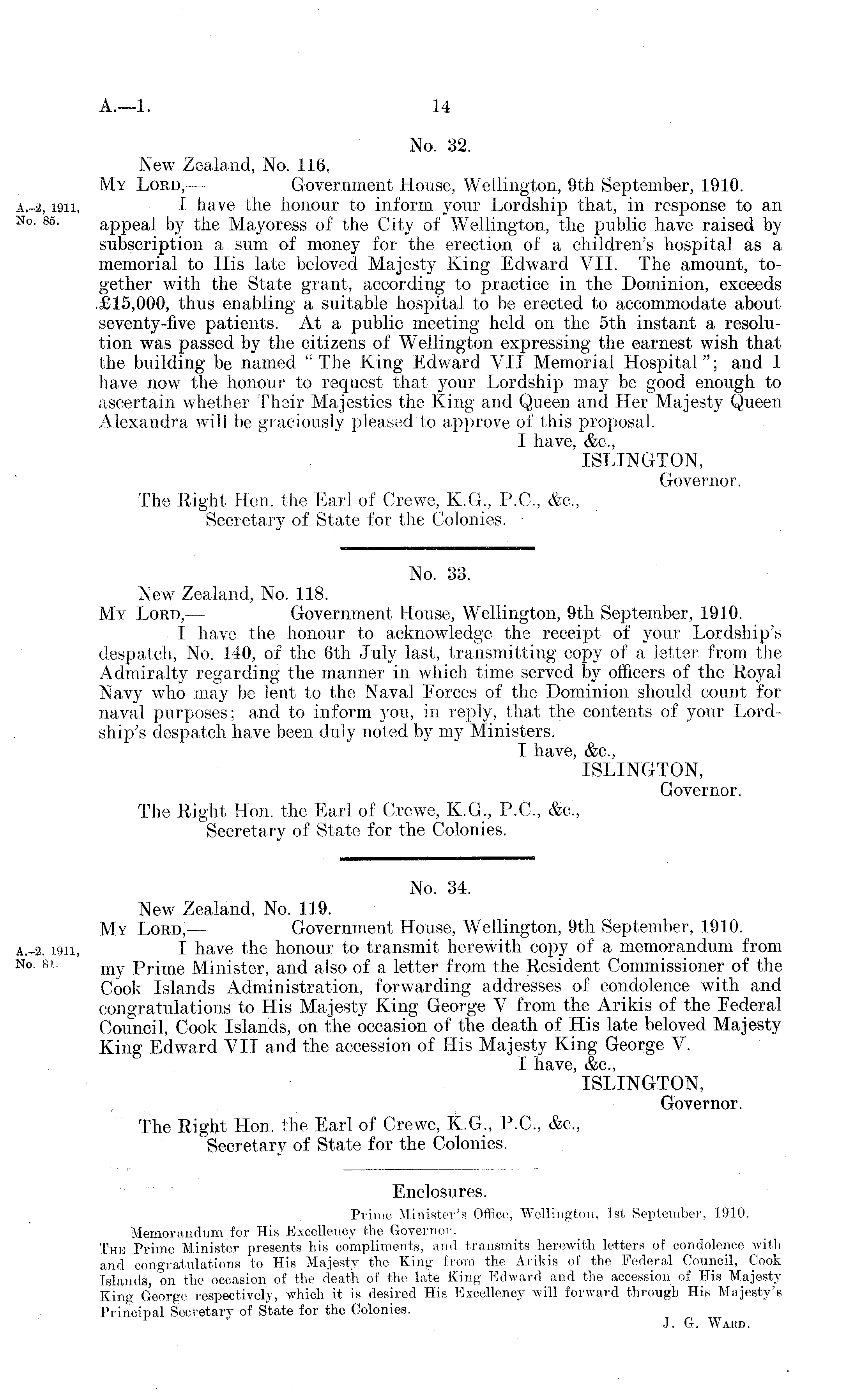 New Zealand, No. 116. My Lord, — Government House, Wellington, 9th September, 1910. I nave the honour to inform your Lordship that, in response to an appeal by the Mayoress of the City of Wellington, the public have raised by subscription a sum of money for the erection of a children's hospital as a memorial to His late beloved Majesty King Edward VII. The amount, together with the State grant, according to practice in the Dominion, exceeds .£15,000, thus enabling a suitable hospital to be erected to accommodate about seventy-five patients. At a public meeting held on the sth instant a resolution was passed by the citizens of Wellington expressing the earnest wish that the building be named "The King Edward VII Memorial Hospital"; and I have now the honour to request that your Lordship may be good enough to ascertain whether Their Majesties the King and Queen and Her Majesty Queen Alexandra will be graciously pleased to approve of this proposal. I have, &c, ISLINGTON, Governor. The Right Hon. the Earl of Crewe, K.G., P.C., &c, Secretary of State for the Colonies.