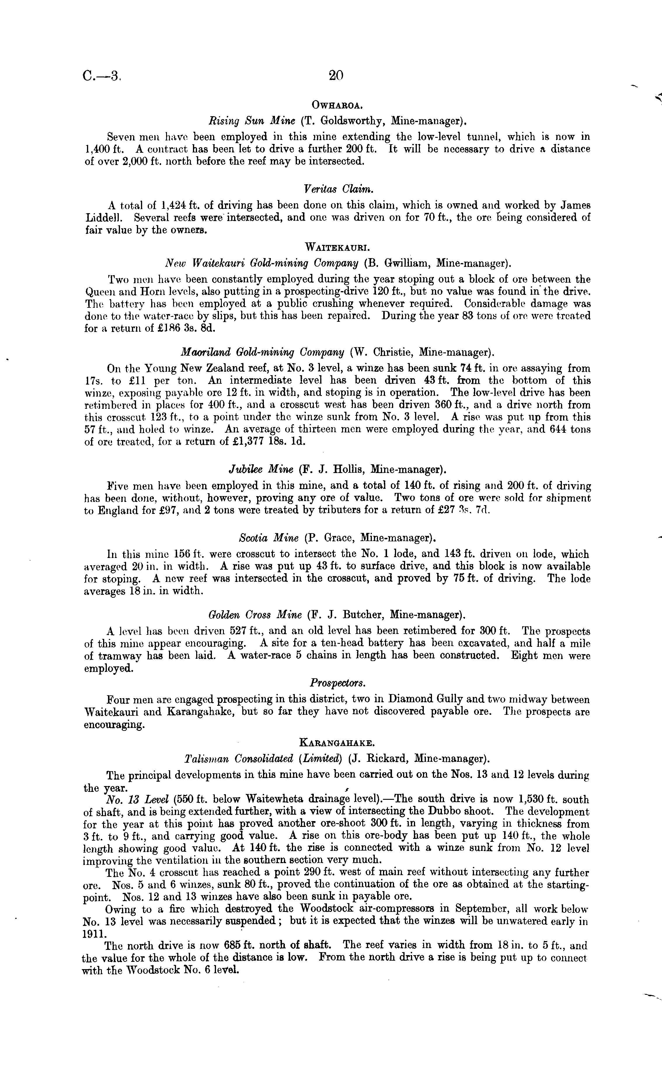 OWHAROA. Rising Sun Mine (T. Goldsworthy, Mine-manager). .Seven men have been employed in this mine extending the low-level tunnel, which is now in 1,400 ft. A contract has been let to drive a further 200 ft. It will be necessary to drive a distance of over 2,000 ft. north before the reef may be intersected. Veritas Claim. A total of 1,424 ft. of driving has been done on this claim, which is owned and worked by James Liddell. Several reefs were intersected, and one was driven on for 70 ft., the ore being considered of fair value by the owners. Waitekauri. New Waitekauri Gold-mining Company (B. Gwilliam, Mine-manager). Two men have been constantly employed during the year stoping out a block of ore between the Queen and Horn levels, also putting in a prospecting-drive 120 ft., but no value was found in the drive. The battery has been employed at a public crushing whenever required. Considerable damage was done to the water-race by slips, but this has been repaired. During the year 83 tons of ore were treated for a return of £186 3s. Bd. Maoriland Gold-mining Company (W. Christie, Mine-manager). On the Young New Zealand reef, at No. 3 level, a winze has been sunk 74 ft. in ore assaying from 17s. to £11 per ton. An intermediate level has been driven 43ft. from the bottom of this winze, exposing payable ore 12 ft. in width, and stoping is in operation. The low-level drive has been retimbered in places for 400 ft., and a crosscut west has been driven 360 ft., and a drive north from this crosscut 123 ft., to a point under the winze sunk from No. 3 level. A rise was put up from this 57 ft., and holed to winze. An average of thirteen men were employed during the year, and 644 tons of ore treated, for a return of £1,377 18s. Id. Jubilee Mine (F. J. Hollis, Mine-manager). Five men have been employed in this mine, and a total of 140 ft. of rising and 200 ft. of driving has been done, without, however, proving any ore of value. Two tons of ore were sold for shipment to England for £97, and 2 tons were treated by tributers for a return of £27 Bs. 7d. Scotia Mine (P. Grace, Mine-manager). In this mine 156 ft. were crosscut to intersect the No. 1 lode, and 143 ft. driven on lode, which averaged 20 in. in width. A rise was put up 43 ft. to surface drive, and this block is now available for stoping. A new reef was intersected in the crosscut, and proved by 75 ft. of driving. The lode averages 18 in. in width. Golden Cross Mine (¥. J. Butcher, Mine-manager). A level lias been driven 527 ft., and an old level has been retimbered for 300 ft. The prospects of this mine appeal , encouraging. A site for a ten-head battery has been excavated, and half a mile of tramway has been laid. A water-race 5 chains in length has been constructed. Eight men were employed. Prospectors. Four men are engaged prospecting in this district, two in Diamond Gully and two midway between Waitekauri and Karangahake, but so far they have not discovered payable ore. The prospects are encouraging. Karangahake. Talisman Consolidated (Limited) (J. Rickard, Mine-manager). The principal developments in this mine have been carried out on the Nos. 13 and 12 levels during the year. No. 13 Level (550 ft. below Waitewheta drainage level). —The south drive is now 1,530 ft. south of shaft, and is being extended further, with a view of intersecting the Dubbo shoot. The development for the year at this point has proved another ore-shoot 300 ft. in length, varying in thickness from 3 ft. to 9 ft., and carrying good value. A rise on this ore-body has been put up 140 ft., the whole length showing good value. At 140 ft. the rise is connected with a winze sunk from No. 12 level improving the ventilation in the southern section very much. The No. 4 crosscut has reached a point 290 ft. west of main reef without intersecting any further ore. Nos. 5 and 6 winzes, sunk 80 ft., proved the continuation of the ore as obtained at the startingpoint. Nos. 12 and 13 winzes have also been sunk in payable ore. Owing to a fire which destroyed the Woodstock air-compressors in September, all work below No. 13 level was necessarily suspended ; but it is expected that the winzes will be unwatered early in 1911. The north drive is now 685 ft. north of shaft. The reef varies in width from 18 in. to 5 ft., and the value for the whole of the distance is low. From the north drive a rise is being put up to connect with the Woodstock No. 6 level.