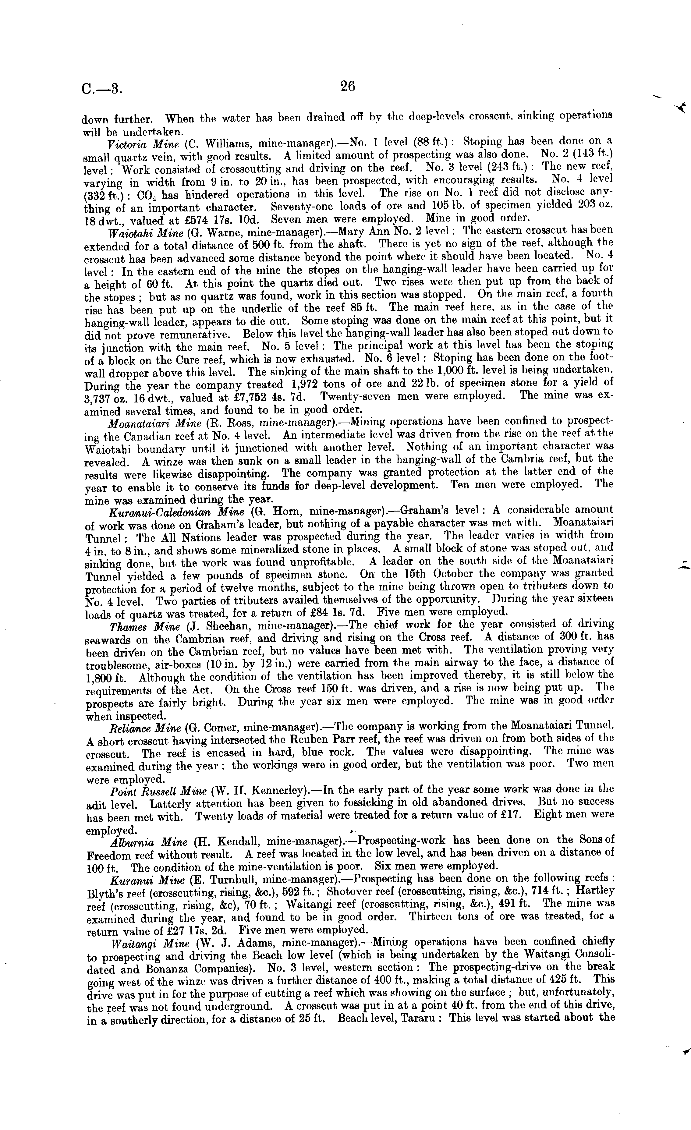 down further. When the water has been drained off by the deep-levels crosscut, sinking operations will be undertaken. Victoria Mine (C. Williams, mine-manager).—No. 1 level (88 ft.) : Stoping has been done on a small quartz vein, with good results. A limited amount of prospecting was also done. No. 2 (143 ft.) level: Work consisted of crosscutting and driving on the reef. No. 8 level (243 ft.) : The new reef, varying in width from 9 in. to 20 in., has been prospected, with encouraging results. No. 1 level (332 ft.) : CO., has hindered operations in this level. The rise on No. 1 reef did not disclose anything of an important character. Seventy-one loads of ore and 105 11). of specimen yielded 203 oz. 18dwt., valued at £574 17s. 10d. Seven men were employed. Mine in good order. Waiotahi Mine (G. Warne, mine-manager).—Mary Ann No. 2 level : The eastern crosscut has been extended for a total distance of 500 ft. from the shaft. There is yet no sign of the reef, although the crosscut has been advanced Borne distance beyond the point where it should have been located. No. t level : In the eastern end of the mine the stopes on the hanging-wall leader have been carried up for a height of 60 ft. At this point the quartz died out. Two rises were then put up from the back of the stopes ; but as no quartz was found, work in this section was stopped. On the main reef, a four! b rise has been put up on the underlie of the reef 85 ft. The main reef here, as in the case of the hanging-wall leader, appears to die out. Some stoping was done on the main reef at this point, but it did not prove remunerative. Below this level the hanging-wall leader has also been stoped out down to its junction with the main reef. No. 5 level: The principal work at this level has been the stoping of a block on the Cure reef, which is now exhausted. No. 6 level : Stoping has been done on the footwall dropper above this level. The sinking of the main shaft to the 1,000 ft. level is being undertaken. During the year the company treated 1,972 tons of ore and 22 lb. of specimen stone for a yield of 3,737 oz. 16dwt., valued at £7,752 4s. 7d. Twenty-seven men were employed. The mine was examined several times, and found to be in good order. Moanataiari Mine (R. Ross, mine-manager).—Mining operations have been confined to prospecting the Canadian reef at No. 4 level. An intermediate level was driven from the rise on the reef at the Waiotahi boundary until it junctioned with another level. Nothing of an important character was revealed. A winze was then sunk on a small leader in the hanging-wall of the Cambria reef, but the results were likewise disappointing. The company was granted protection at the latter end of the year to enable it to conserve its funds for deep-level development. Ten men were employed. The mine was examined during the year. Kuranui-Caledonian Mine (G. Horn, mine-manager).—Graham's level : A considerable amount of work was done on Graham's leader, but nothing of a payable character was met with. Moanataiari Tunnel : The All Nations leader was prospected during the year. The leader varies in width from 4 in. to 8 in., and shows some mineralized stone in places. A small block of stone was stoped out. and sinking done, but the work was found unprofitable. A leader on the south side of the Moanataiari Tunnel yielded a few pounds of specimen stone. On the 15th October the company was granted protection for a period of twelve months, subject to the mine being thrown open to tributers down to No. 4 level. Two parties of tributers availed themselves of the opportunity. During the year sixteen loads of quartz was treated, for a return of £84 Is. 7d. Five men were employed. Thames Mine (J. Sheehan, mine-manager).—The chief work for the year consisted of driving seawards on the Cambrian reef, and driving and rising on the Cross reef. A distance of 300 ft. has been driven on the Cambrian reef, but no values have been met with. The ventilation proving very troublesome, air-boxes (10 in. by 12 in.) were carried from the main airway to the face, a distance of 1,800 ft. Although the condition of the ventilation has been improved thereby, it is still below the requirements of the Act. On the Cross reef 150 ft. was driven, and a rise is now being put up. The prospects are fairly bright. During the year six men were employed. The mine was in good order when inspected. Reliance Mine (G. Comer, mine-manager). —The company is working from the Moanataiari runnel. A short crosscut having intersected the Reuben Parr reef, the reef was driven on from both sides of the crosscut. The reef is encased in hard, blue rock. The values were disappointing. The mine was examined during the year : the workings were in good order, but the ventilation was poor. Two men were employed. Point Russell Mine (W. H. Kennerley). —In the early part of the year some work was done in the adit level. Latterly attention has been given to fossicking in old abandoned drives. But no success has been met with. Twenty loads of material were treated for a return value of £17. Eight men were employed. Alburnia Mine (H. Kendall, mine-manager). —Prospecting-work has been done on the Sons of Freedom reef without result. A reef was located in the low level, and has been driven on a distance of 100 ft. The condition of the mine-ventilation is poor. Six men were employed. Kuranui Mine (E. Tumbull, mine-manager).—Prospecting has been done on the following reefs : Blyth's reef (crosscutting, rising, &c), 592 ft.; Shotover reef (crosscutting, rising, &c), 714 ft. ; Hartley reef (crosscutting, rising, &c), 70 ft. ; Waitangi reef (crosscutting, rising, &c), 491 ft. The mine was examined during the year, and found to be in good order. Thirteen tons of ore was treated, for a return value of £27 17s. 2d. Five men were employed. Waitangi Mine (W. J. Adams, mine-manager). —Mining operations have been confined chiefly to prospecting and driving the Beach low leve