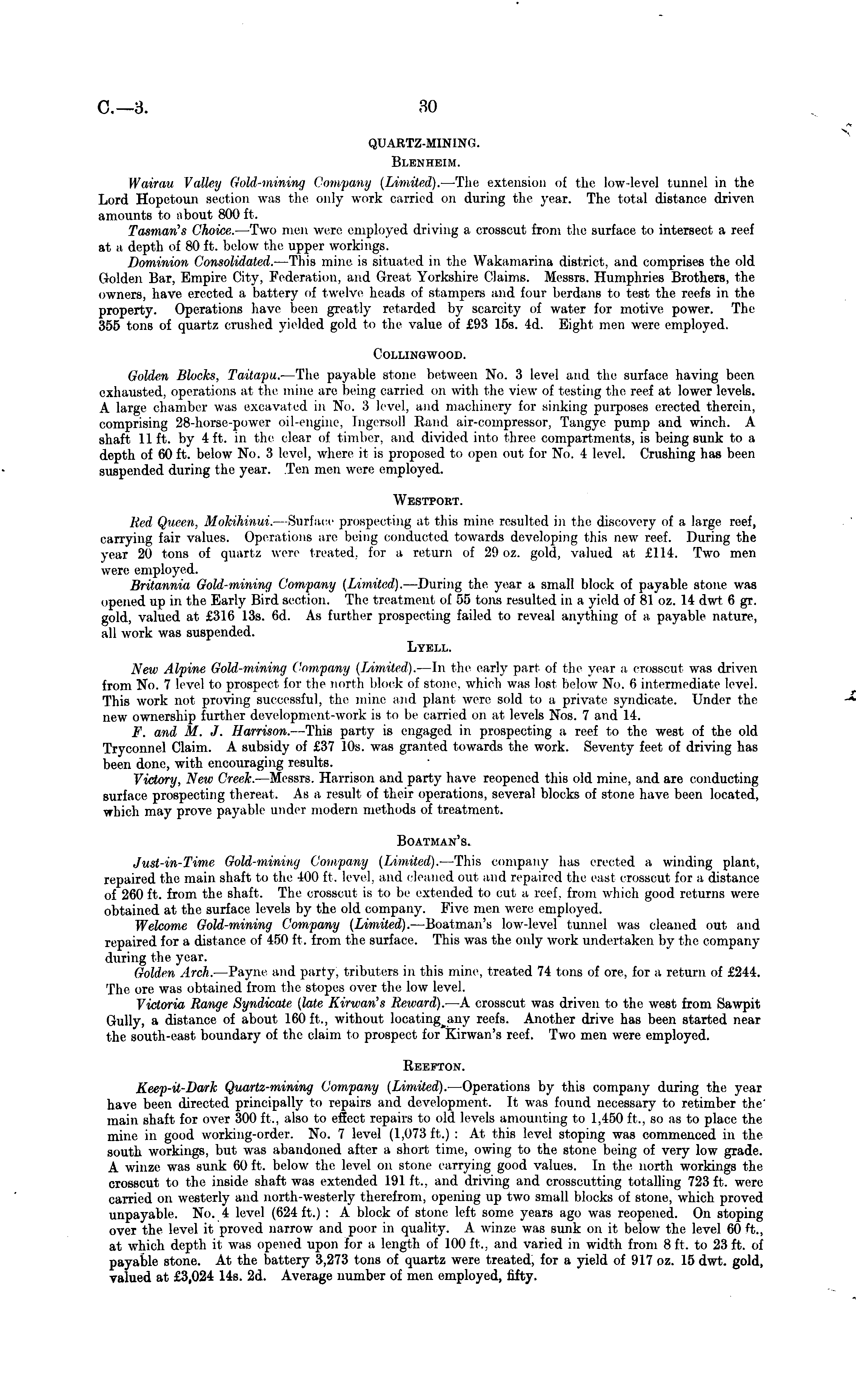 QUARTZ-MINING. Blenheim. Wairau Valley Gold-mining Company (Limited). —The extension of the low-level tunnel in the Lord Hopetoun section was the only work carried on during the year. The total distance driven amounts to about 800 Et. Tasman's Choice.—Two men were employed driving a crosscut from the surface to intersect a reef at a depth of 80 ft. below the upper workings. Dominion Consolidated. —This mine is situated in the Wakamaiina district, and comprises the old Golden Bar, Empire City, Federation, and Great Yorkshire Claims. Messrs. Humphries Brothers, the owners, have erected a battery of twelve heads of stampers and four berdans to test the reefs in the property. Operations have been greatly retarded by scarcity of water for motive power. The 355 tons of quartz crushed yielded gold to the value of £93 15s. 4d. Eight men were employed. COLLINGWOOD. Golden Blocks, Taitapu. —The payable stone between No. 3 level and the surface having been exhausted, operations at the mine are being carried on with the view of besting the reef at lower levels. A large chamber was excavated in No, -i level, and machinery for sinking purposes erected therein, comprising 28-horse-power oil-engine, [ngersoll Rand air-compressor, Tangye pump and winch. A shaft lift, by 4 ft. in the clear of timber, mid divided into three compartments, is being sunk to a depth of 60 ft. below No. 3 level, where it is proposed to open out for No. 4 level. Crushing has been suspended during the year. Ten men wn-i' employed. Westport. I,'ril Queen, Mokihinui.- Surface prospecting at this mine resulted in the discovery of a large reef, carrying fair values. Operations are being conducted towards developing this new reef. During the year 20 tons of quartz were treated, for a return of 20 oz. gold, valued at £114. Two men were employed. Uritannia Gold-mining Company (Limited). —During the year a small block of payable stone was opened up in the .Early Bird section. The treatment of 55 tons resulted in a yield of 81 oz. 14 dwt 6 gr. gold, valued at £316 13s. 6d. As further prospecting failed to reveal anything of a payable nature, all work was suspended. Lyell. New Alpine Gold-mining Company (Limited). —In the early pari of the year a crosscut was driven from No. 7 level to prospect Eot the north block of stone, which was lost below No. 6 intermediate level. This work not proving successful, the mine mid plant were sold to a private syndicate. Under the new ownership further development-work is to be carried on at levels Nos. 7 and 14. F. and M. J. Harrison. —This party is engaged in prospecting a reef to the west of the old Tryconnel Claim. A subsidy of £37 JOs. was granted towards the work. Seventy feet of driving has been done, with encouraging results. Victory, New Creek. —Messrs. Harrison and party have reopened this old mine, and are conducting surface prospecting thereat. As ;i result of their operations, several blocks of stone have been located, which may prove payable under modern methods of treatment. Boatman's. Just-in-Time Gold-mining Company (Limited). —This company has erected a winding plant, repaired the main shaft to the 100 ft. level, and cleaned oul and repaired the east crosscut for a distance of 260 ft. from the shaft. The crosscut is to be extended to cut. a, reef, from which good returns were obtained at the surface levels by the, old company. Five men were employed. Welcome Gold-mining Company (Limited). — Boatman's low-level tunnel was cleaned out and repaired for a distance of 450 ft. from the surface. This was the only work undertaken by the company during the year. Golden Arch. — Payne and party, tributers in this mine, treated 71 tons of ore. for a. return of £244. The ore was obtained from the stopes over the low level. Victoria Range Syndicate (late Kirwan's Reward). —A crosscut was driven to the west from Sawpit Gully, a distance of about 160 ft.. without locating any reefs. Another drive has been started near the south-east boundary of the claim to prospect for Kirwan's reef. Two men were employed. Reefton. Keep-it-Dark Quartz-mining Company (Limited). —Operations by this company during the year have been directed principally to repairs and development. It was found necessary to retimber the' main shaft for over 300 ft., also to effect repairs to old levels amounting to 1,450 ft., so as to place the mine in good working-order. No. 7 level (1,073 ft.) :At this level stoping was commenced in the south workings, but was abandoned after a short time, owing to the stone being of very low grade. A winze was sunk 60 ft. below the level on stone carrying good values. In the north workings the crosscut to the inside shaft was extended 191 ft., and driving and crosscutting totalling 723 ft. were carried on westerly and north-westerly therefrom, opening up two small blocks of stone, which proved unpayable. No. 4 level (624 ft.) : A block of stone left some years ago was reopened. On stoping over the level it proved narrow and poor in quality. A winze was sunk on it below the level 60 ft., at which depth it. was opened upon lor a length of 100 ft., and varied in width from Bft. to 23ft. of payable stone. At the battery 3,273 tons of quartz were treated, for a yield of 917 oz. 15 dwt. gold, valued at £3,024 14s. 2d. Average number of men employed, nfty.