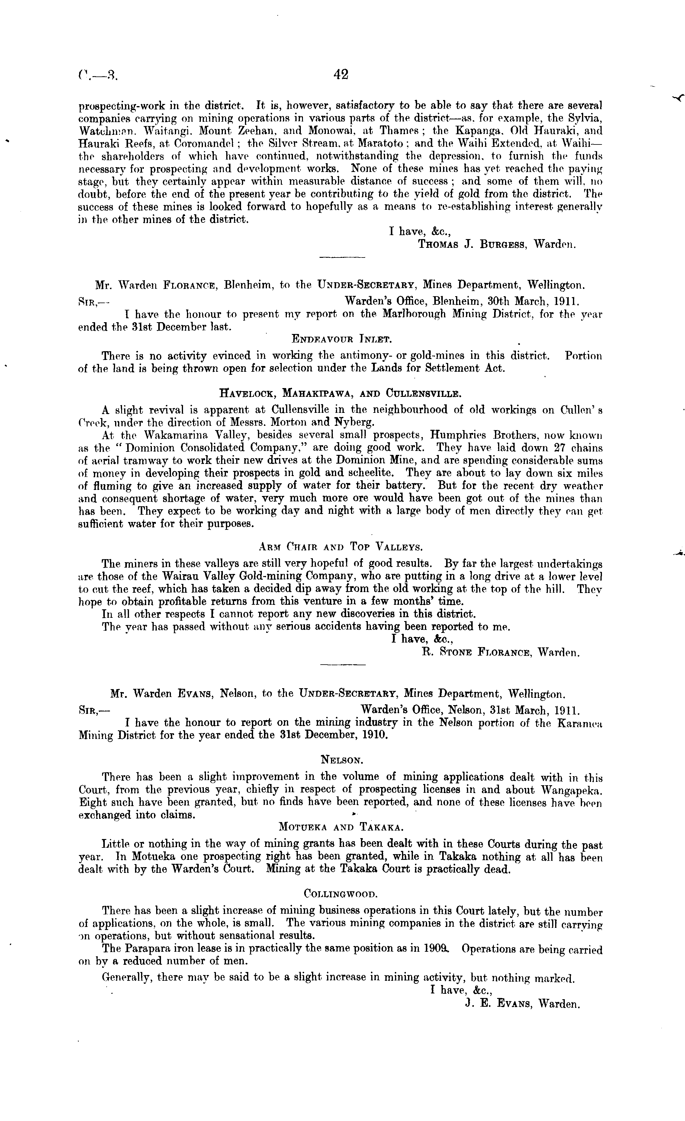 prospecting-work in the district. It is, however, satisfactory to be able to say thai there are several companies carrying cm mining operations in various parts of the district— as, for example, the Sylvia, Watchman, Waitangi, .Mount Zeehan, and Monowai, at Thames : the Kapanga, Old Hauraki, and Hauraki Reefs, at Coromandel : the Silver Stream, at Maratoto; and the Waihi Extended, a 1 Waihi the shareholders of which have continued, notwithstanding the depression, to furnish the funds necessary for prospecting :md development works. None of these mines has vet reached the paying stage, but they certainly appear within measurable distance of success: and some of them will, no doubt, before the end of the present year be contributing to the yield of gold from the district. The success of these mines is looked forward to hopefully as a means to re-establishing interest generally in the other mines of the district. I have, &c, Thomas J. Burgess, Warden. Mr. Warden Flobanob, Blenheim, to the Under-Secretary. Mines Department. Wellington. Sir,— Warden's Office, Blenheim. 30th March, 1911. I have the honour to present my report on the Marlborough Mining District, for the year ended the 31st December last. Endeavour Inlet. There is no activity evinced in working the antimony-or gold-mines in this district. Portion of the land is being thrown open for selection under the Lands for Settlement Act. Havelock, Mahakipawa, and Cullensville. A slight revival is apparent at Cullensville in the neighbourhood of old workings on Oullen' a Creek, under the direction of Messrs. Morton and Nyberg. At the Wakamarina Valley, besides several small prospects, Humphries Brothers, now known as the " Dominion Consolidated Company," are doing good work. They have laid down 27 chains of aerial tramway to work their new drives at the Dominion Mine, and are spending considerable <ni'is of money in developing their prospects in gold and scheeEte. They arc about to lay down six miles of fluming to give an increased supply of water for their batten. But for the recent dry weather and consequent shortage of water, very much more ore would have been got out of the mines than has been. They expect to be working day and night with a large body of men directly they can gel sufficient water for their purposes. Arm Ctmir and Top Valleys. The miners in these valleys are still very hopeful of good results. By far the largest undertakings are those of the Wairau Valley Gold-mining Company, who are putting in a long drive at a lower level to cut the reef, which has taken a decided dip away from the old working at the top of the hill. They hope to obtain profitable returns from this venture in a few months' time. In all other respects I cannot report any new discoveries in this district. The year has passed without any serious accidents having been reported to me. I have, &c. R. Stone Fi.orance. Warden. Mr. Warden Evans, Nelson, to the Under-Seoretary, Mines Department, Wellington. Sir,— Warden's Office, Nelson, 31st March, 1911. 1 have the honour to report on the mining industry in the Nelson portion of the Karamea Mining District for the year ended the 31st December, 1910. Nelson. There has been a slight improvement in the volume of mining applications dealt with in this Court, from the previous year, chiefly in respect of prospecting licenses in and about Wangapeka. Eight such have been granted, but no finds have been reported, and none of these licenses have been exchanged into claims. MOTUEKA AND TaKAKA. Little or nothing in the way of mining grants has been dealt with in these Courts during the past year. In Motueka one prospecting right has been granted, while in Takaka nothing a 1 ill has been dealt with by the Warden's Court. Mining at the Takaka Court is practically dead. COLLTNGWOOn. There has been a slight increase of mining business operations in this Court lately, but the number of applications, on the whole, is small. The various mining companies in the district are still oarrying )ii operations, but without sensational results. The Parapara iron lease is in practically the same position as in 190 ft. Operations are being carried on by a reduced number of men. Generally, there may be said to be a slight increase in mining activity, but nothing marked. I have, &c, 3. E. Evans, Warden.