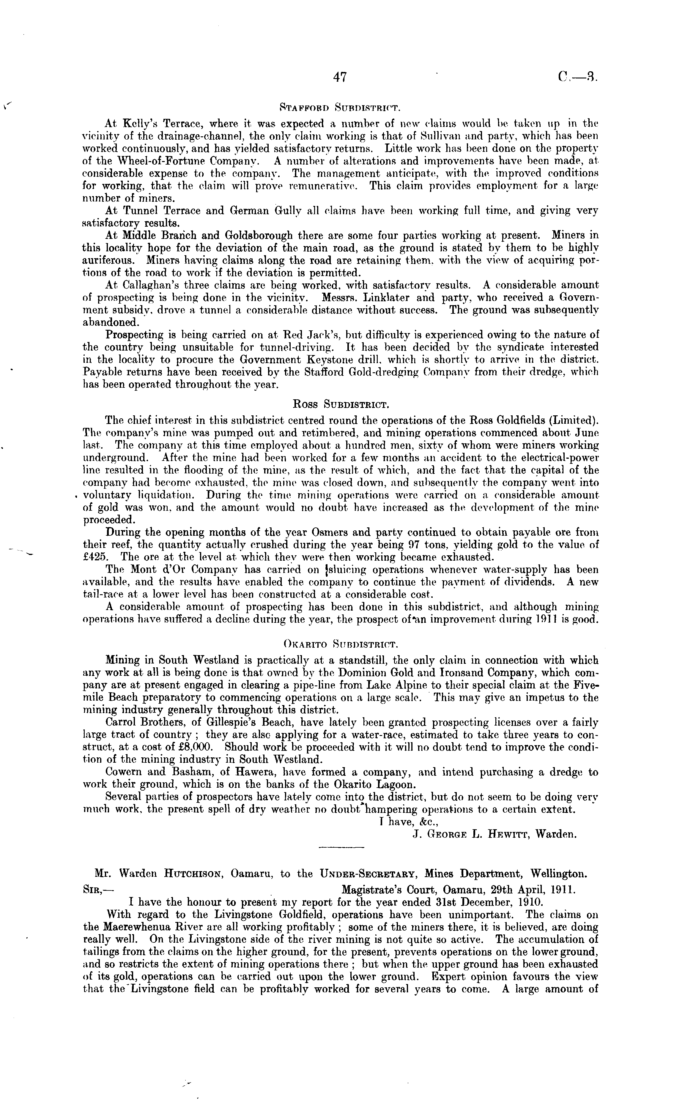 Stafford Sctbdistrict At Kelly's Terrace, where H was expected a number of new claims would be taken up m the vicinity of the drainage channel, the only claim working is thai ol Sullivan and party, which has been worked continuously,and has yielded satisfactory returns. Little work lias been done on the property of the Wneel-of-Fortune Company. A number of alterations and improvements have been made, at considerable expense to the company. The management anticipate, with the improved conditions for working, that the claim will prove remunerative. This claim provides employment For a large number of miners. At Tunnel Terrace and German Gully all claims have been working full time, and giving very satisfactory results. At Middle Branch and Goldsborough there are some four parties working at present. Miners in this locality hope for the deviation of the main road, as the ground is stated l>v them to lie highly auriferous. Miners having claims along the road are retaining them, with the view of acquiring portions of the road to work if the deviation is permitted. At Callaghan's three claims are being worked, with satisfactory results. A considerable amount of prospecting is being done in the vicinity. Messrs. Linklater and party, who received a Government subsidy, drove a tunnel a considerable distance without success. The ground was subsequently abandoned. Prospecting is being carried on at Red .lack's, hut difficulty is experienced owing to the nature ol the country being unsuitable for tunnel-driving. It has been decided by the syndicate interested in the locality to procure the Government Keystone drill, which is shortly to arrive in the district. Payable returns have been received by the Stafford Gold-dredging Company from their dredge, which has been operated throughout the year. ROSS SUBMSTRIOT. The chief interest in this sulidist rid centred round t i perations of I lie Uoss (ioldfields (Limited). The company's mine was pumped out and retimbered, and mining operations commenced about June last. The company at this time employed about a hundred men. sixty of whom were miners working underground. After tin , mine had 1 n worked for a few months an accident to the electrical-power line resulted in the flooding of the mine, as the result of which, and the fact thai the capital of the company had become exhausted, the mine was closed down, and subsequently the company went into voluntary liquidation. During the time mining operations were carried on a considerable amount of gold was won. and tin , amount would no doubt have increased as the development of the mine proceeded. During the opening months of the year Osmers and party continued to obtain payable ore from their reef, the quantity actually crushed during the year being '.)" tons, yielding gold to tin' value of £425. The ore at the level a 1 which they were then working became exhausted. The Mont dOr Company has carried on [sluicing operations whenever water-supply has been available, and the results have enabled Ihe company to continue the payment of dividends. A new tail-race at a lower level has been constructed at a Considerable cost. A considerable amount of prospecting has been done in this subdist rict. and although mining operations have suffered a decline during the year, the prospect of*an improvement during 1011 is good. Okarito Subdistriot. Mining in South Westland is practically at a standstill, the only claim in connection with which any work at all is being done is that owned by the Dominion Gold and Ironsand Company, which company are at present engaged in clearing a pipe-line from Lake Alpine to their special claim at the Fivemile Beach preparatory to commencing operations on a large scale. This may give an impetus to the mining industry generally throughout this district. Carrol Brothers, of Gillespie's Beach, have lately been granted prospecting licenses over a fairly large tract of country ; they are also applying for a water-race, estimated to take three years to construct, at a cost of £8,000. Should work be proceeded with it will no doubt tend to improve the condition of the mining industry in South Westland. Cowern and Basham, of Hawera. have formed a company, and intend purchasing a dredge to work their ground, which is on the banks of the Okarito Lagoon. Several parties of prospectors have lately come into the district, but do not seem to be doing very much work, the present spell of dry weather no doubt hampering operations to a certain extent. I have, &c, •I. George L. Hewitt, Warden. Mr. Warden Hutchison, Oamaru, to the Uxder-Secretary, Mines Department, Wellington. Sir, — Magistrate's Court. Oamaru, 29th April, I'.tl I. I have the honour to present my report lor the year ended 31st December. 1910. With regard to the Livingstone Goldfield, operations have been unimportant. The claims on the Maerewhenua River are all working profitably ; some of the miners there, it is believed, are doing really well. On the Livingstone side of the river mining is not quite so active. The accumulation of tailings from the claims on the higher ground, for the present, prevents operations on the lower ground, and so restricts the extent of mining operations there : but when t he upper ground has been exhausted of its gold, operations can be carried nut upon the lower ground. Kxpetl opinion favours the view that the Livingstone field can be profitably worked for several years to come. A large amount of
