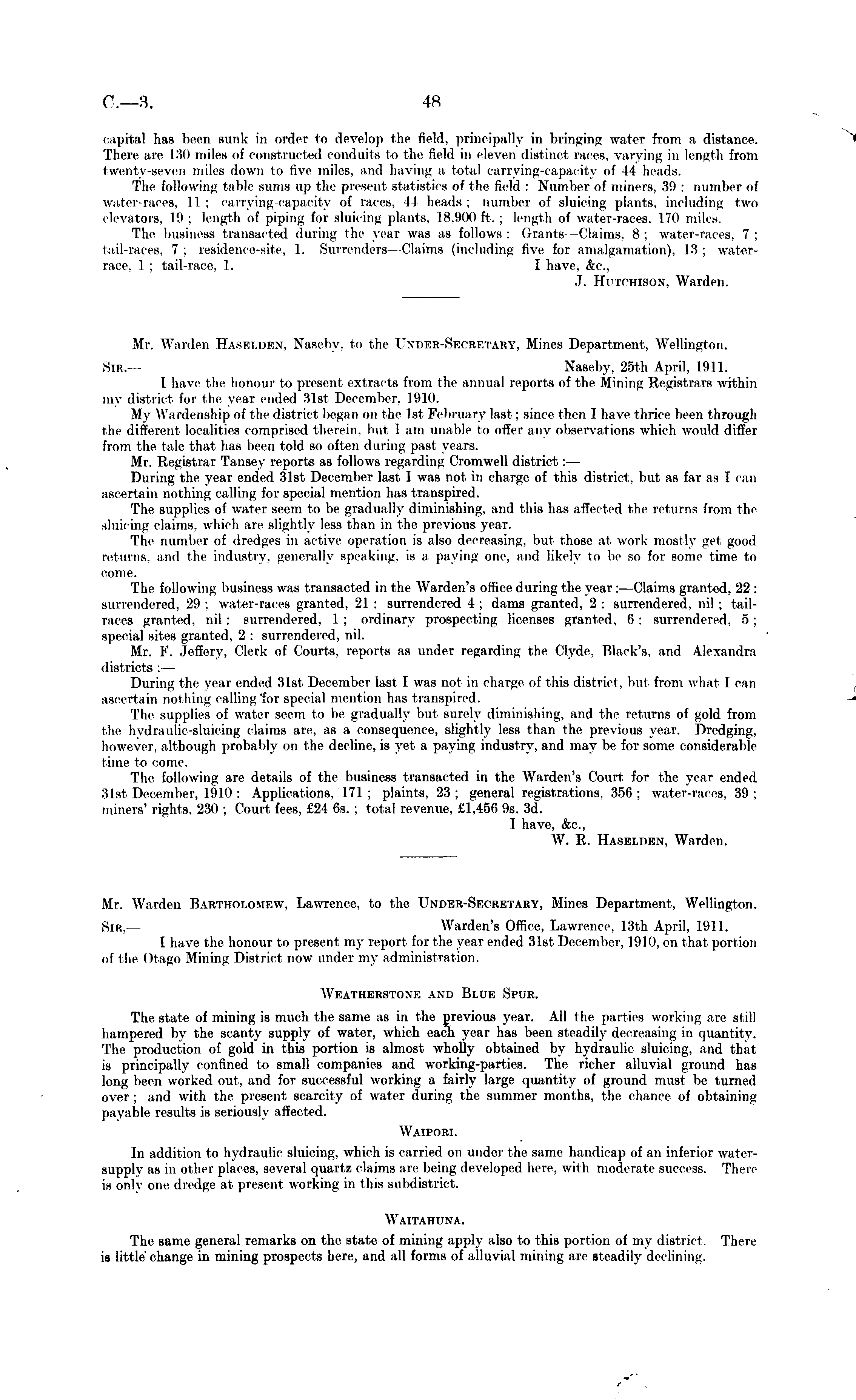 capital lias been sunk in order to develop the field, principally in bringing water from a distance. There are 130 miles of constructed conduits to the field in eleven distinct races, varying in length from twenty-seven miles down to five miles, and Laving a total carrying-capacity of U heads. The following table sums up the present stai ist ica of i he Held : Number of miners, 39 ; number ol water-races, 11 ; carrying-capacity of races. II heads: number of sluicing plants, including two elevators, 19 ; length of piping for sluicing plants, 18,900 ft. ; length of water-races, 170 miles. The business transacted during the year was as follows: Grants Claims. 8; water races, 7: tail laces. 7: residence-site, I. Surrenders Claims (including five tor amalgamation), L 3; waterrace, 1 ; tail-race. I. 1 have, &<■.. J. HtJTCHISON, Warden. Mi. Warden Haselden, Naseby, to the Under-Secretary, .Mines Department. Wellington. Sir, Naseby, 25th April. 101 I. I have the honour to present extracts from the annual reports of the (lining Registrars within my district for the year ended 31 si December, 1910. My Wardenship of the district began on the Ist February last: since then I have thrice been through the different localities comprised therein, lint 1 am unable to offer any observations which would differ from the tale that has been told so often during past years. Ali-. Registrar Tansey reports as follows regarding Cromwell district:— During the year ended 31st December last I was not in charge of this district, but as far as I can ascertain nothing calling for special mention has transpired. The supplies of water seem to lie gradually diminishing, and this has affected the returns from the sluicing claims, which are elightly less than in the previous year. The number of dredges in active operation is also decreasing, but those at work mostly get good returns, and the industry, generally speaking, is a paying one. and likely to lie so for some time to come. The following liusiness was transacted in the Warden's office during the year : —Claims granted, 22 : surrendered, 29: water races granted, 21 : surrendered I ; dams granted, 2: surrendered, nil; tailraces granted, nil: surrendered. I: ordinary prospecting licenses granted, <i : surrendered. 5; special sites granted, 2 : surrendered, nil. Mr. V. Jeffery, Clerk of Courts, reports as under regarding the Clyde. Black's, and Alexandra districts :— During the year ended .'list December last I was not in charge of this district, but from what 1 can ascertain nothing calling for special mention has transpired. The supplies of water seem to lie gradually but surely diminishing, and the returns of gold from the hydraulic-sluicing claims are. as a consequence, slightly less than the previous year. Dredging, however, although probably on the decline, is yet a paying industry, and may lie for some considerable time to come. The following are details of the liusiness transacted in the Warden's Court for the year ended :ilst December, 1910: Applications, 171 ; plaints. 2:5: general registrations. 356; water-races, 30: miners' rights. 230 ; Court fees, £24 6s. ; total revenue. £1,456 9s. 3d. I have, &c, W. R. Haseldkn, Warden. Mr. Warden Bartholomew, Lawrence, to the IJndbr-Secretary, Mines Department, Wellington. Sir,— Warden's Office, Lawrence Kith April, 1911. I have the honour to present my report for the year ended 31st December, 1910, on that poll ion of the Otago Mining District now under my administration. Weatherstoxe axd Blue Spur. The state of mining is much the same as in the previous year. All the parties working are still hampered l>\ the scanty supply of water, which each war has lieen steadily decreasing in <|iiantit v. The production of gold in this portion is almost wholly obtained by hydraulic sluicing, and that is principally confined to small companies and working-parties. The richer alluvial ground has Long been worked out. and for successful working a fairly large quantity of ground must lie turned over; and with the present scarcity of water during the summer months, the chance of obtaining payable results is seriously affected. W.UPORI. In addition to hydraulic sluicing, which is carried on under the same handicap of an inferior watersupply as in other places, several quartz claims are being developed here, with moderate success. There is only one dredge at present working in this sulidistrict. Waitahixa. The same general remarks on the state of mining apply also to this portion of my district. There is little change in mining prospects here, and all forms of alluvial mining are steadily declining.