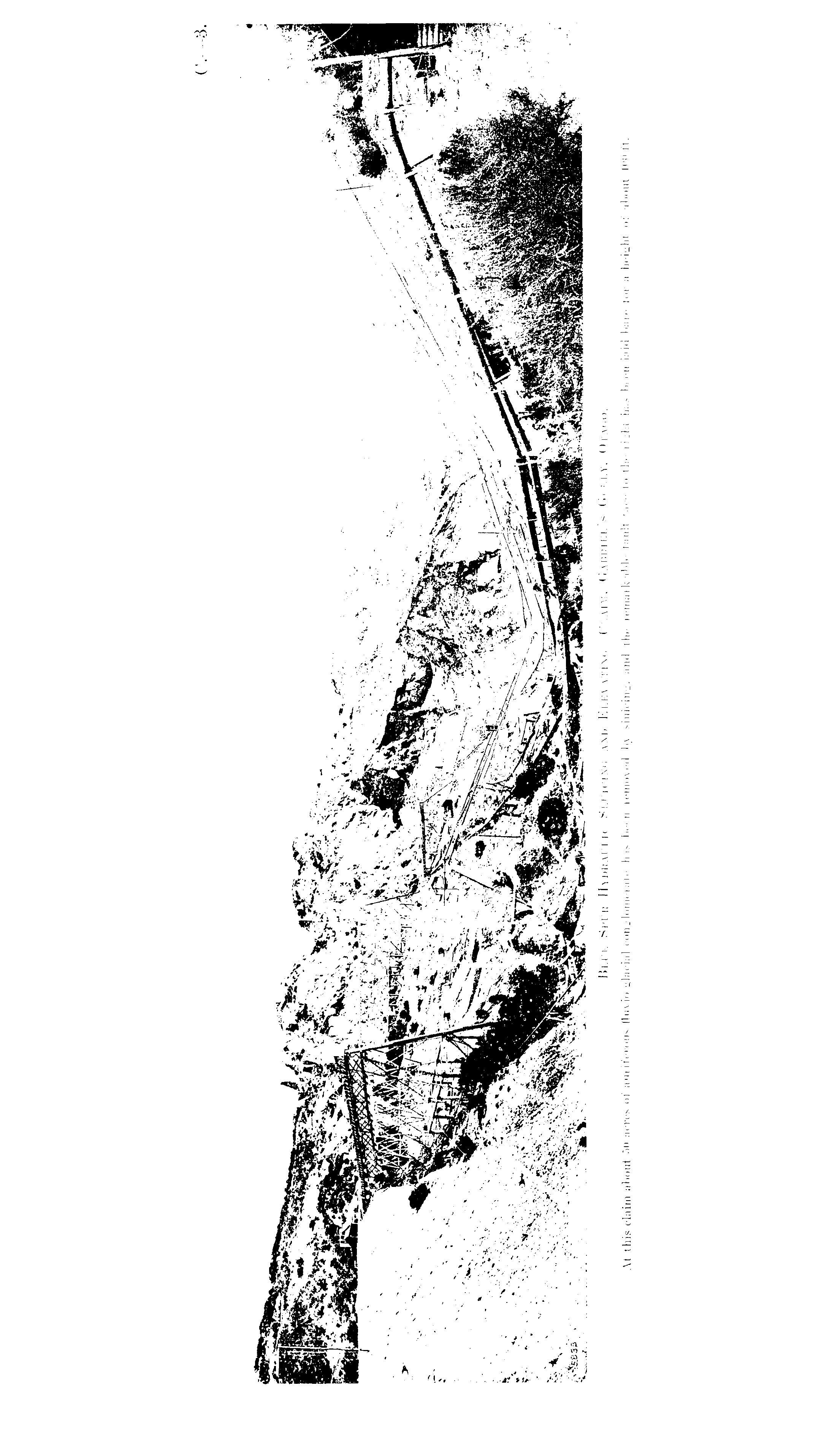 Blue Spur Hydraulic Sluicing and Elevating Claim, Gabriel's Gully, Otago. At this claim about 50 acres of auriferous fluvio-glacial conglomerate has been removed by sluicing, and the remarkable fault- face to the right has been laid bare for a height of about 400 ft.