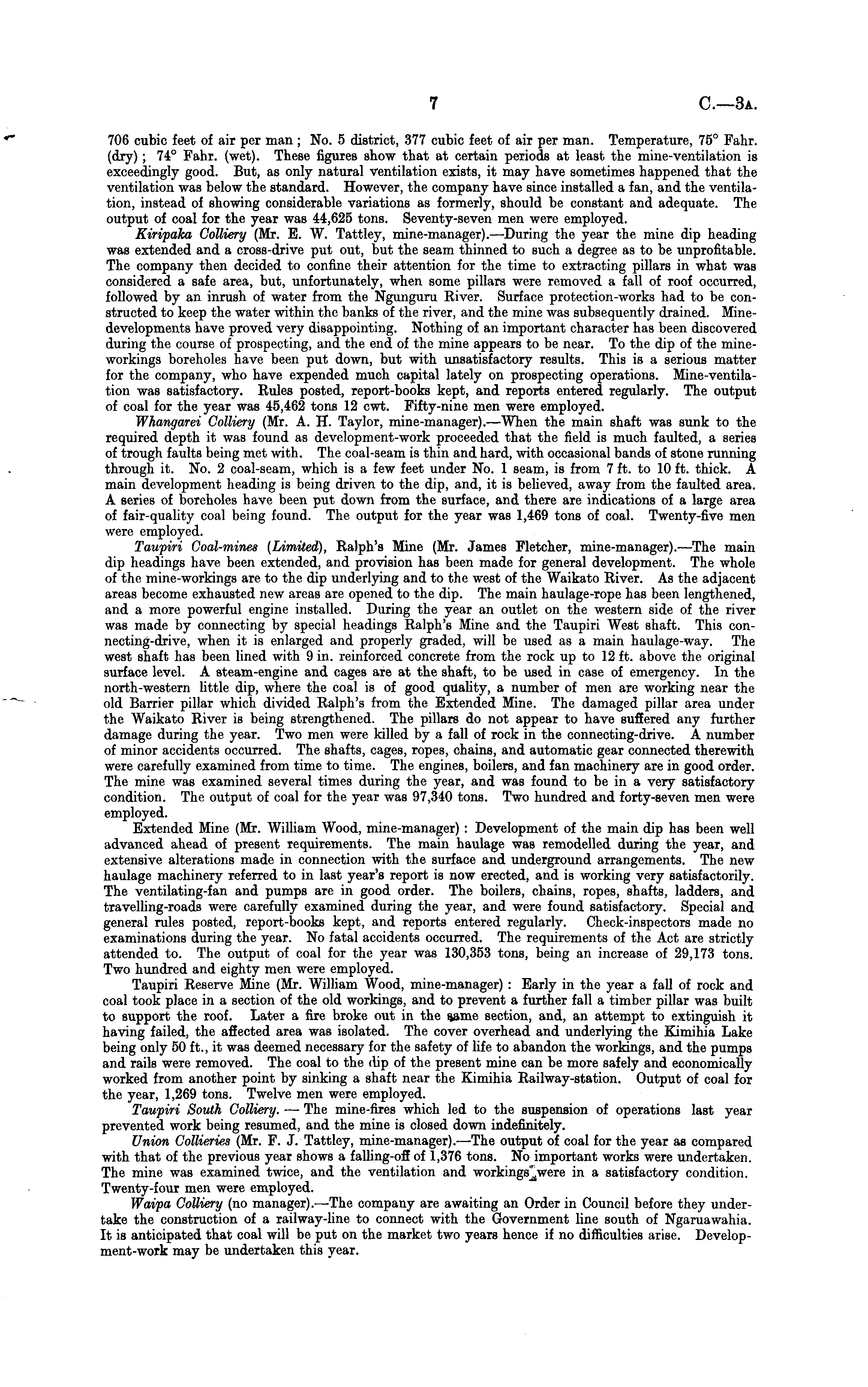 706 cubic feet of air per man ; No. 5 district, 377 cubic feet of air per man. Temperature, 75° Fahr. (dry) ; 74° Fahr. (wet). These figures show that at certain periods at least the mine-ventilation is exceedingly good. But, as only natural ventilation exists, it may have sometimes happened that the ventilation was below the standard. However, the company have since installed a fan, and the ventilation, instead of showing considerable variations as formerly, should be constant and adequate. The output of coal for the year was 44,625 tons. Seventy-seven men were employed. Kiripaka Colliery (Mr. E. W. Tattley, mine-manager).—During the year the mine dip heading was extended and a cross-drive put out, but the seam thinned to such a degree as to be unprofitable. The company then decided to confine their attention for the time to extracting pillars in what was considered a safe area, but, unfortunately, when some pillars were removed a fall of roof occurred, followed by an inrush of water from the Ngunguru River. Surface protection-works had to be constructed to keep the water within the banks of the river, and the mine was subsequently drained. Minedevelopments have proved very disappointing. Nothing of an important character has been discovered during the course of prospecting, and the end of the mine appears to be near. To the dip of the mineworkings boreholes have been put down, but with unsatisfactory results. This is a serious matter for the company, who have expended much capital lately on prospecting operations. Mine-ventila-tion was satisfactory. Rules posted, report-books kept, and reports entered regularly. The output of coal for the year was 45,462 tons 12 cwt. Fifty-nine men were employed. Whangarei Colliery (Mr. A. H. Taylor, mine-manager).—When the main shaft was sunk to the required depth it was found as development-work proceeded that the field is much faulted, a series of trough faults being met with. The coal-seam is thin and hard, with occasional bands of stone running through it. No. 2 coal-seam, which is a few feet under No. 1 seam, is from 7 ft. to 10 ft. thick. A main development heading is being driven to the dip, and, it is believed, away from the faulted area. A series of boreholes have been put down from the surface, and there are indications of a large area of fair-quality coal being found. The output for the year was 1,469 tons of coal. Twenty-five men were employed. Taupiri Coal-mines (Limited), Ralph's Mine (Mr. James Fletcher, mine-manager).—The main dip headings have been extended, and provision has been made for general development. The whole of the mine-workings are to the dip underlying and to the west of the Waikato River. As the adjacent areas become exhausted new areas are opened to the dip. The main haulage-rope has been lengthened, and a more powerful engine installed. During the year an outlet on the western side of the river was made by connecting by special headings Ralph's Mine and the Taupiri West shaft. This con-necting-drive, when it is enlarged and properly graded, will be used as a main haulage-way. The west shaft has been lined with 9 in. reinforced concrete from the rock up to 12 ft. above the original surface level. A steam-engine and cages are at the shaft, to be used in case of emergency. In the north-western little dip, where the coal is of good quality, a number of men are working near the old Barrier pillar which divided Ralph's from the Extended Mine. The damaged pillar area under the Waikato River is being strengthened. The pillars do not appear to have suffered any further damage during the year. Two men were killed by a fall of rock in the connecting-drive. A number of minor accidents occurred. The shafts, cages, ropes, chains, and automatic gear connected therewith were carefully examined from time to time. The engines, boilers, and fan machinery are in good order. The mine was examined several times during the year, and was found to be in a very satisfactory condition. The output of coal for the year was 97,340 tons. Two hundred and forty-seven men were employed. Extended Mine (Mr. William Wood, mine-manager) : Development of the main dip has been well advanced ahead of present requirements. The main haulage was remodelled during the year, and extensive alterations made in connection with the surface and underground arrangements. The new haulage machinery referred to in last year's report is now erected, and is working very satisfactorily. The ventilating-fan and pumps are in good order. The boilers, chains, ropes, shafts, ladders, and travelling-roads were carefully examined during the year, and were found satisfactory. Special and general rules posted, report-books kept, and reports entered regularly. Check-inspectors made no examinations during the year. No fatal accidents occurred. The requirements of the Act are strictly attended to. The output of coal for the year was 130,353 tons, being an increase of 29,173 tons. Two hundred and eighty men were employed. Taupiri Reserve Mine (Mr. William Wood, mine-manager) : Early in the year a fall of rock and coal took place in a section of the old workings, and to prevent a further fall a timber pillar was built to support the roof. Later a fire broke out in the s>me section, and, an attempt to extinguish it having failed, the affected area was isolated. The cover overhead and underlying the Kimihia Lake being only 50 ft., it was deemed necessary for the safety of life to abandon the workings, and the pumps and rails were removed. The coal to the dip of the present mine can be more safely and economically worked from another point by sinking a shaft near the Kimihia Railway-station. Output of coal for the year, 1,269 tons. Twelve men were employed. Taupiri South Colliery. — The mine-fires which led to the suspension of operations last year prevented work being resumed, and the mine is closed down indefinitely. Union Collieries (Mr. F. J. Tattley, mine-manager).—The outpu