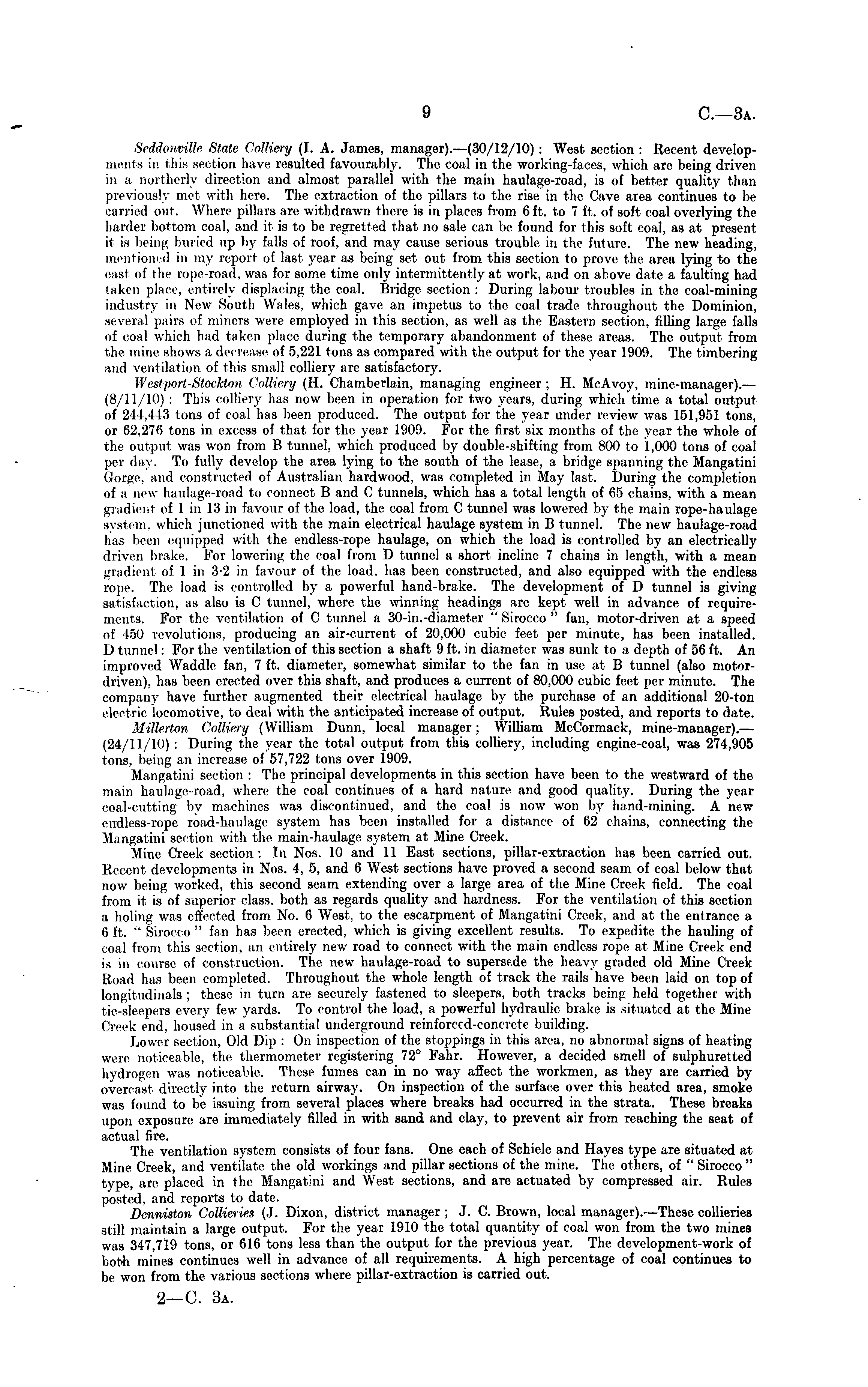 Seddonvitte State Colliery (I. A. James, manager).—(3o/12/10): West section : Recent developments in this section have resulted favourably. The coal in the working-faces, which are being driven in a northerly direction and almost parallel with the main haulage-road, is of better quality than previously met with here. The extraction of the pillars to the rise in the Cave area continues to be carried out. Where pillars are withdrawn there is in places from 6 ft. to 7 ft. of soft, coal overlying the harder bottom coal, and it is to be regretted that no sale can be found for this soft coal, as at present it is being buried up by falls of roof, and may cause serious trouble in the future. The new heading, mentioned in my report of last year as being set out from this section to prove the area lying to the easi of the rope-road, was for some time only intermittently at work, and on above date a faulting had taken place, entirely displacing the coal. Bridge section : During labour troubles in the coal-mining industry in New South Wales, which gave an impetus to the coal trade throughout the Dominion, several pairs of miners were employed in this section, as well as the Eastern section, rilling large falls of coal which had taken place during the temporary abandonment of these areas. The output from the mine shows a decrease of 5,221 tons as compared with the output for the year 1909. The timbering and ventilation of this small colliery are satisfactory. Westport-StockUm Colliery (H. Chamberlain, managing engineer; H. McAvoy, mine-manager).— (8/11/10) : This colliery has now been in operation for two years, during which time a total output of 214, \\\\ tons of coal bus been produced. The output for the year under review was 151,951 tons, or 62,276 tons in excess of that for the year 1909. For the first six months of the year the whole of the output was won from B tunnel, which produced by double-shifting from 800 to 1,000 tons of coal per day. To fully develop the area lying to the south of the lease, a bridge spanning the Mangatini Gorge, and constructed of Australian hardwood, was completed in May last. During the completion of a new haulage-road to connect B and C tunnels, which has a total length of 65 chains, with a mean g] ul nil (if 1 in 18 in favour of the load, the coal from C tunnel was lowered by the main rope-haulage system, which junctioned with the main electrical haulage system in B tunnel. The new haulage-road has been equipped with the endless-rope haulage, on which the load is controlled by an electrically driven brake. For lowering the coal from D tunnel a short incline 7 chains in length, with a mean gradient of 1 in 3-2 in favour of the load, has been constructed, and also equipped with the endless rope. The load is controlled by a powerful hand-brake. The development of D tunnel is giving satisfaction, as also is C tunnel, where the winning headings are kept well in advance of requirements. For the ventilation of C tunnel a 30-in.-diameter " Sirocco " fan, motor-driven at a speed of 150 revolutions, producing an air-current of 20,000 cubic feet per minute, has been installed. D tunnel: For the ventilation of this section a shaft 9 ft. in diameter was sunk to a depth of 56 ft. An improved Waddle fan, 7 ft. diameter, somewhat similar to the fan in use at B tunnel (also motordriven), has been erected over this shaft, and produces a current of 80,000 cubic feet per minute. The company have further augmented their electrical haulage by the purchase of an additional 20-ton electric locomotive, to deal with the anticipated increase of output. Rules posted, and reports to date. Millerton Colliery (William Dunn, local manager; William McCormack, mine-manager).— (24/11/10) : During the year the total output from this colliery, including engine-coal, was 274,905 tons, being an increase of 57,722 tons over 1909. Mangatini section : The principal developments in this section have been to the westward of the main haulage-road, where the coal continues of a hard nature and good quality. During the year coal-cutting by machines was discontinued, and the coal is now won by hand-mining. A new endless-rope road-haulage system has been installed for a distance of 62 chains, connecting the Mangatini section with the main-haulage system at Mine Creek. Mine Creek section: In Nos. 10 and 11 East sections, pillar-extraction has been carried out. Recent developments in Nos. 4, 5, and 6 West sections have proved a second seam of coal below that now being worked, this second seam extending over a large area of the Mine Creek field. The coal from it is of superior class, both as regards quality and hardness. For the ventilation of this section a holing was effected from No. 6 West, to the escarpment of Mangatini Creek, and at the entrance a 6 ft. " Sirocco " fan has been erected, which is giving excellent results. To expedite the hauling of coal from this section, an entirely new road to connect with the main endless rope at Mine Creek end is in course of construction. The new haulage-road to supersede the heavy graded old Mine Creek Road lias been completed. Throughout the whole length of track the rails have been laid on top of longitudinals ; these in turn are securely fastened to sleepers, both tracks being held together with tie-sleepers every few yards. To control the load, a powerful hydraulic brake is situated at the Mine Creek end. housed in a substantial underground reinforccd-concrete building. Lower section, Old Dip : On inspection of the stoppings in this area, no abnormal signs of heating were noticeable, the thermometer registering 72° Fahr. However, a decided smell of sulphuretted hydrogen was noticeable. These fumes can in no way affect the workmen, as they are carried by overcast directly into the return airway. On inspection of the surface over this heated area, smoke was found to be issuing from several places where breaks had occurred in the strata. These breaks upon exposur