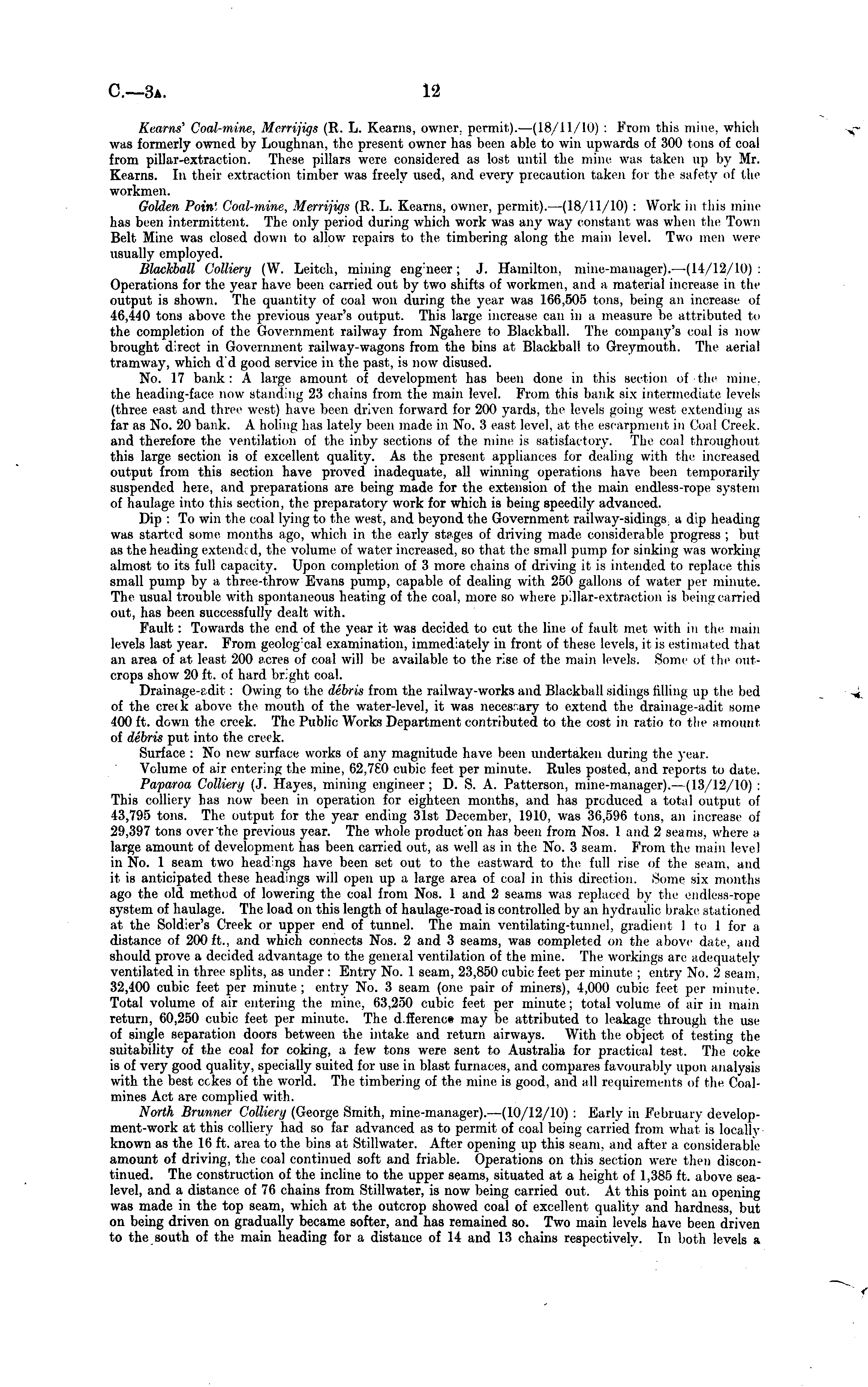Kearns , Coal-mine, Merrijigs (R. L. Kearns, owner, permit).— (lB/11/10) : From this mine, which was formerly owned by Loughnan, the present owner has been able to win upwards of 300 tons of coal from pillar-extraction. These pillars were considered as lost until the mine was taken up by Mr. Kearns. In their extraction timber was freely used, and every precaution taken fov the safety of the workmen. Golden Pom', Coal-mine, Merrijigs (R. L. Kearns, owner, permit). — (18/11/10) : Work in this mine has been intermittent. The only period during which work was any way constant was when the Town Belt Mine was closed down to allow repairs to the timbering along the main level. Two men weir usually employed. Blackball Colliery (W. Leitch, mining eng : neer; J. Hamilton, mine-manager). — (14/12/10): Operations for the year have been carried out by two shifts of workmen, and a material increase in the output is shown. The quantity of coal won during the year was 166,505 tons, being an increase oi 46,440 tons above the previous year's output. This large increase can in a measure be attributed to the completion of the Government railway from Ngahere to Blackball. The company's coal is now brought direct in Government railway-wagons from the bins at Blackball to Greymouth. The aerial tramway, which d'd good service in the past, is now disused. No. 17 bank: A large amount of development has been done in this section of the mine. the heading-face now standing 23 chains from the main level. From this bank six intermediate levels (three east and three west) have been driven forward for 200 yards, the levels going west extending as far as No. 20 bank. A holing has lately been made in No. 3 east level, at the escarpment in Coal Creek, and therefore the ventilation of the inby sections of the mine is satisfactory. The coal throughout this large section is of excellent quality. As the present appliances for dealing with the increased output from this section have proved inadequate, all winning operations have been temporarily suspended here, and preparations arc being made for the extension of the main endless-rope system of haulage into this section, the preparatory work for which is being speedily advanced. Dip : To win the coal lying to the west, and beyond the Government railway-sidings a dip heading was started some months ago, which in the early stages of driving made considerable progress ; but as the heading extended, the volume of water increased, so that the small pump for sinking was working almost to its full capacity. Upon completion of 3 more chains of driving it is intended to replace this small pump by a three-throw Evans pump, capable of dealing with 250 gallons of water per minute. The usual trouble with spontaneous heating of the coal, more so where pillar-extraction is being carried out, has been successfully dealt with. Fault: Towards the end of the year it was decided to cut the line of fault met with in the main levels last year. From geologxal examination, immediately in front of these levels, it is estimated that an area of at least 200 acres of coal will be available to the r;se of the main levels. Some of the outcrops show 20 ft. of hard bright coal. Drainage-K.dit : Owing to the debris from the railway-works and Blackball sidings tilling up the bed of the creek above the mouth of the water-level, it was necesr.ary to extend the drainage-adit some 400 ft. down the creek. The Public Works Department contributed to the cost in ratio to the amount of debris put into the creek. Surface : No new surface works of any magnitude have been undertaken during the year. Volume of air entering the mine, 62,7£0 cubic feet per minute. Rules posted, and reports to date. Paparoa Colliery (J. Hayes, mining engineer; D. S. A. Patterson, mine-manager). —(13/12/10) : This colliery has now been in operation for eighteen months, and has produced a total output of 43,795 tons. The output for the year ending 31st December, 1910, was 36,596 tons, an increase of 29,397 tons over the previous year. The whole product'on has been from Nos. 1 and 2 seams, where a large amount of development has been carried out, as well as in the No. 3 seam. From the main level in No. 1 seam two headings have been set out to the eastward to the full rise of the seam, and it is anticipated these headings will open up a large area of coal in this direction. Some, six months ago the old method of lowering the coal from Nos. 1 and 2 seams was replaced by the endless-rope system of haulage. The load on this length of haulage-road is controlled by an hydraulic brake stationed at the Soldier's Creek or upper end of tunnel. The main ventilating-tunnel, gradient I to 1 for a distance of 200 ft., and which connects Nos. 2 and 3 seams, was completed on the above date, and should prove a decided advantage to the general ventilation of the mine. The workings are adequately ventilated in three splits, as under: Entry No. 1 seam, 23,850 cubic feet per minute : entry No. 2 seam, 32,400 cubic feet per minute ; entry No. 3 seam (one pair of miners), 4,000 cubic led per minute. Total volume of air entering the mine, 63,250 cubic feet per minute; total volume of air in main return, 60,250 cubic feet per minute. The difference may be attributed to leakage through the use of single separation doors between the intake and return airways. With the object of testing the suitability of the coal for coking, a few tons were sent to Australia for practical test. The coke is of very good quality, specially suited for use in blast furnaces, and compares favourably upon analysis with the best cckes of the world. The timbering of the mine is good, and all requirements of the Coal mines Act are complied with. North Brunner Colliery (George Smith, mine-manager).—(lo/12/10) : Early in February develop-ment-work at this colliery had so far advanced as to permit of coal being carried from what is locally known as the 16 ft. area to the bins at Stillwater.