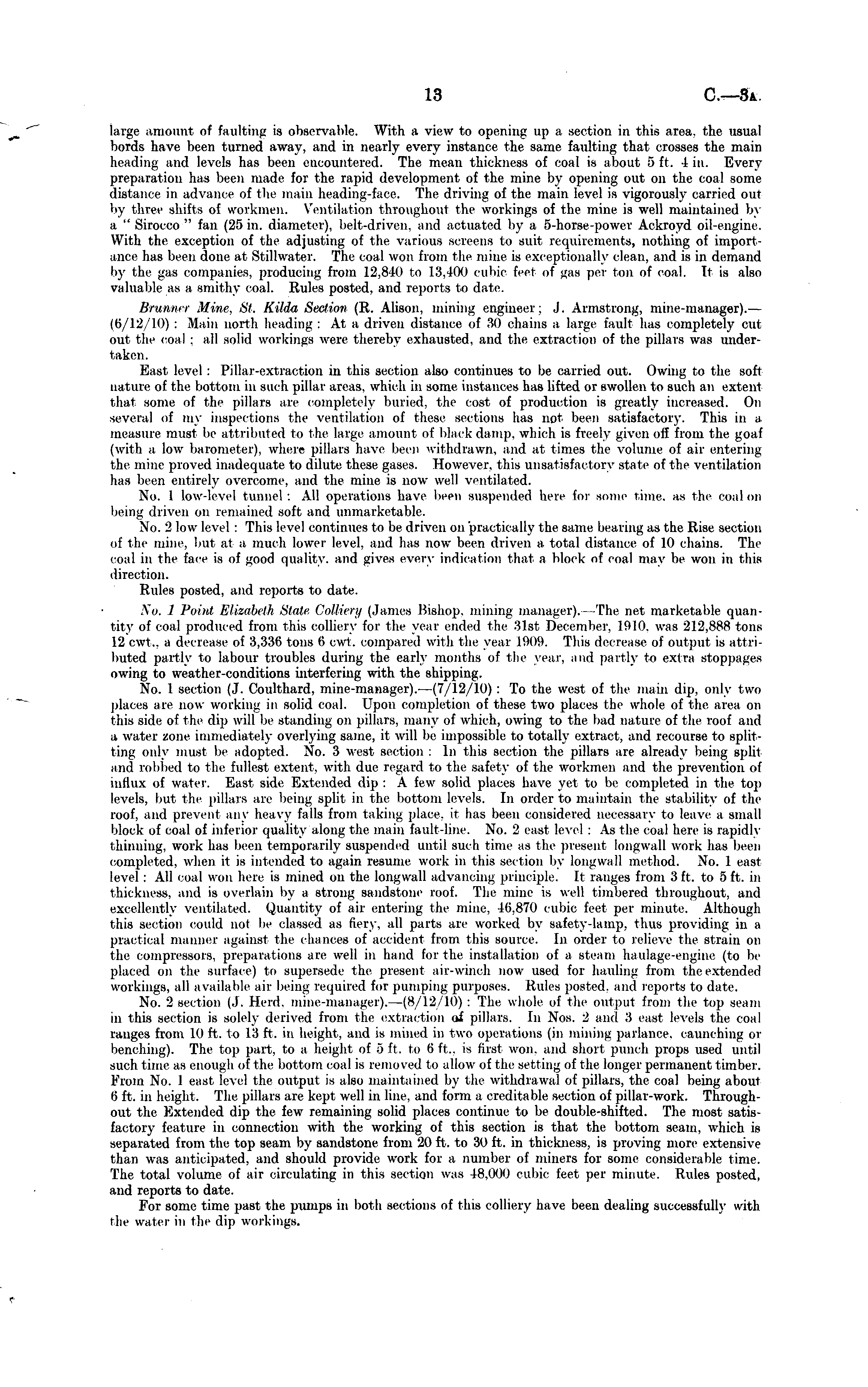 large amount of faulting is observable. With a view to opening up a section in this area, the usual bords have been turned away, and in nearly every instance the same faulting that crosses the main heading and levels has been encountered. The mean thickness of coal is about sft. -tin. Every preparation has been made for the rapid development of the mine by opening out on the coal some distance in advance of the main heading-face. The driving of the main level is vigorously carried out by three shifts of workmen. Ventilation throughout the workings of the mine is well maintained by a " Sirocco" fan (25 in. diameter), belt-driven, and actuated by a 5-horse-power Ackroyd oil-engine. With the exception of the adjusting of the various screens to suit requirements, nothing of importance has been done at Stillwater. The coal won from the mine is exceptionally clean, and is in demand by the gaa companies, producing from 12,840 to 13,4(M) cubic feet of gas per ton of coal. It is also valuable as a smithy coal. Rules posted, and reports to date. Bnmner Mine. St. Kilda Section (R. Alison, mining engineer; .J. Armstrong, mine-manager).— (6/12/10) : Main north heading : At a driven distance of 30 chains a large fault has completely cut out the coal : all solid workings were thereby exhausted, and the extraction of the pillars was undertaken. East level : Pillar-extraction ill this section also continues to be carried out. Owing to the soft nature of the bottom in such pillar areas, which in some instances has lifted or swollen to such an extent thai some of the pillars are completely buried, the cost of production is greatly increased. On several of my inspections the ventilation of these sections has not been satisfactory. This in a measure musi be attributed to the large amount of black damp, which is freely given oil from the goaf (with a low barometer), where pillars have been withdrawn, and at times the volume of air entering the mine proved inadequate to dilute these gases. However, this unsatisfactory state of the ventilation has been entirely overcome, and the mine is now well ventilated. No. 1 low-level tunnel : All operations have been suspended here for some time, as the coal on being driven on remained soft and unmarketable. No. 2 low level: This level continues to be driven on practically the same bearing as the Rise section of the mine, but at a much lower level, and has now been driven a total distance of 10 chains. The coal in the face is of good quality, and gives every indication that a block of coal may be won in this direction. Rules posted, and reports to date. No. I Point Elizabeth State Collier// (.lames Bishop, mining manager). The net marketable quantity of coal produced from this colliery for the year ended the 31st December. 1910, was 212,888 tons 12 cwt.. a decrease of 3,336 tons 6 cwt. compared with the year 1909. This decrease of output is attributed partly to labour troubles during the early months of the year, and partly to extra stoppages owing to weather-conditions interfering with the shipping. No. 1 section (J. Coulthard, mine-manager). —(7/12/10) : To the west of the main dip, only two places are nnu working in solid coal. Upon completion of these two places the whole of the area on this side of tin- dip will be standing on pillars, many of which, owing to the bad nature of the roof and a water zone immediately overlying same, it will be impossible to totally extract, and recourse to splitting only must lie adopted. No. 3 west section :In this section the pillars are already being split and robbed to the fullest extent, with due regard to the safety of the workmen and the prevention of influx of water. East side Extended dip : A few solid places have yet to be completed in the top levels, but the pillars are being split in the bottom levels. In order to maintain the stability of the roof, and prevent any heavy falls from taking place, it has been considered necessary to leave a small block of coal of inferior quality along the main fault-line. No. 2 east level :As the coal here is rapidly thinning, work has been temporarily suspended until such time as the present Longwall work has been completed, when it is intended to again resume work in this section by longwall method. No. 1 east level: All coal won here is mined on the longwall advancing principle. It ranges from 3 ft. to 5 ft. in thickness, and is overlain by a strong sandstone roof. The mine is well timbered throughout, and excellently ventilated. Quantity of air entering the mine, 46,870 cubic feet per minute. Although this section could not lie classed ;is fiery, all parts are worked by safety-lamp, thus providing in a practical manner against the chances of accident from this source. In order to relieve the strain on the compressors, preparations are well in hand for the installation of a steam haulage-engine (to hr placed on the surface) to supersede the present air-winch now used for hauling from the extended workings, all available air being required for pumping purposes. Rules posted, ami reports to date. No. 2 section (.1. Herd, mine-manager).—(B/12 Id) : The whole of the output from the top seam in this section is solely derived from the extraction of pillars. In Nos. 2 and :i east levels the coal ranges from 10 ft. to 13 ft. in height, and is mined in two operations (in mining parlance, caunching or benching). The top part, to a height of 5 ft. to (i ft., is first won, and short punch props used until such time as enough of tin , bottom coal is removed to allow of the setting of the longer permanent timber. From No. 1 east level the output is also maintained by the withdrawal of pillars, the coal being about 6 ft. in height. The pillars are kept well in line, and form a creditable section of pillar-work. Throughout the Extended dip the few remaining solid places continue to be double-shifted. The most satisfactory feature in connection with the working of this section is that the bottom seam