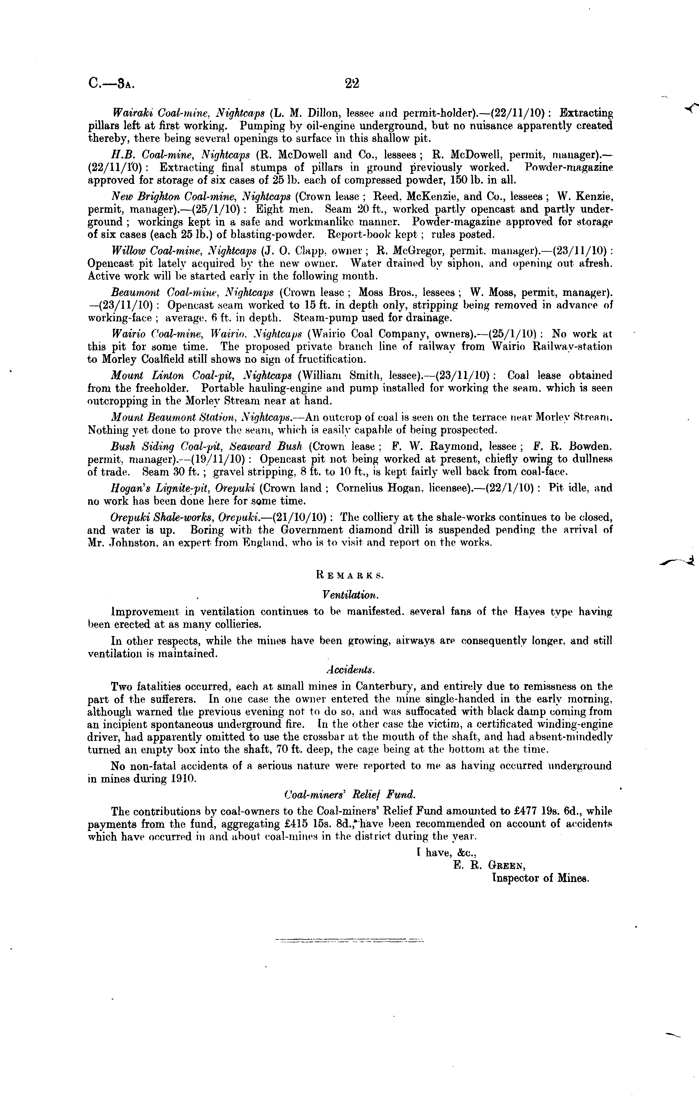 Wairaki Coal-mine, Nightcaps (L. M. Dillon, lessee and permit-holder). —(22/11/10): Extracting pillars left at first working. Pumping by oil-engine underground, but no nuisance apparently created thereby, there being several openings to surface in this shallow pit. II.B. Coal-mine, Nightcaps (R. McDowell and Co., lessees; R. McDowell, permit, manager).— (22/H/l'O): Extracting final stumps of pillars in ground previously worked. Powder-magazine approved for storage of six cases of 25 lb. each of compressed powder, 150 lb. in all. New Brighton Coal-mine, Nightcaps (Crown lease : Reed. McKenzie, and Co., lessees ; W. Kenzie, permit, manager). —(25/1/10): Bight men. Seam 20 ft., worked partly opencast and partly underground ; workings kept in a safe and workmanlike manner. Powder-magazine approved for storage of six cases (each 25 lb.) of blasting-powder, Report-book kept : rules posted. Willow Coal-mine, Nightcaps (J. <). Clapp, owner; R. McGregor, permit, manager). —(23/11/10) : Opencast pit lately acquired by the new- owner. Water drained by siphon, and opening out afresh. Active work will be started early in the following month. Beaumont Coal-mine, Nightcaps (Crown lease: Moss Bros., lessees: W. Moss, permit, manager). —(23/11/10): Opencast, seam worked to 15 ft. in depth only, stripping being removed in advance of working-face ; average, fi ft. in depth. Steam-pump used for drainage. Wairio Coal-wine. Wairio, Nightcaps (Wairio Coal Company, owners). —(25/1/10) : No work at this pit for some time. The proposed private branch line of railway from Wairio Railway-station to Morley Coalfield still shows no sign of fructification. Mount Linlon Coal-pit. Nightcaps (William Smith, lessee). —(23/11/10): Coal lease obtained from the freeholder. Portable hauling-engine and pump installed Eot working the seam, which is seen outcropping in the Morley Stream near at hand. Mount Bean in 1 1 a i Station, Nightcaps. —An outcrop oi coal is seen on the terrace near Morley stream. Nothing yet done to prove the seam, which is easily capable of being prospected. Bush Siding Coal-pit, ISeawunl Bush (Crown lease : F. W. Raymond, lessee : F. H. Bowden. permit, manager). -(19/11/10) : Opencast pit not being worked at present, chiefly owing to dullness of trade. Seam 30 ft. ; gravel stripping. 8 ft. to l<> It., is kepj fairly well back from coal-face. llogaris Lignite-pit, Orepuki (Crown land ; Cornelius Hogan, licensee). —(22/1/10) : Pit idle, and no work has been done here l< 11 some time. Orepuki Shale-work*. Orepuki. —(21/10/10): The collier; at the shale-works continues to be dosed, and water is up. Boring with the Government diamond drill is suspended pending the arrival of Mr. Johnston, an expert from England, who is to visit and report on the works. H E M A R K s. Ventilation. improvement in ventilation continues to be manifested, several fans of the Haves type having been erected at as many collieries. In other respects, while the mines have been growing, airways are consequently longer, and still ventilation is maintained. Aoddents. Two fatalities occurred, each at small mines in Canterbury, and entirely due to remissness on thp part of the sufferers. In one case the owner entered the mine single-handed in the early morning, although warned the previous evening not to do so. and was suffocated with black damp coming from an incipient spontaneous underground fire. In the o1 her case the victim, a certificated winding-engine driver, had apparently omitted to use the ci i the mouth of the shaft, and had absent-mindedly turned an empty box into the shaft, 70 ft. deep, the cage being at the bottom ai the time. No non-fatal accidents of a serious nature were reported to me as having occurred underground in mines during 1910. Coal-miners' Relief Fund. The contributions by coal-owners to the Coal-miners' Relief Fund amounted to £477 19s. 6d., while payments from the fund, aggregating £415 15s. 8d.,'have been recommended on account of accidents which have occurred in and about coal-mines in the distrid dining the year. F have, &c. K. R. Green, Inspector of Mines.
