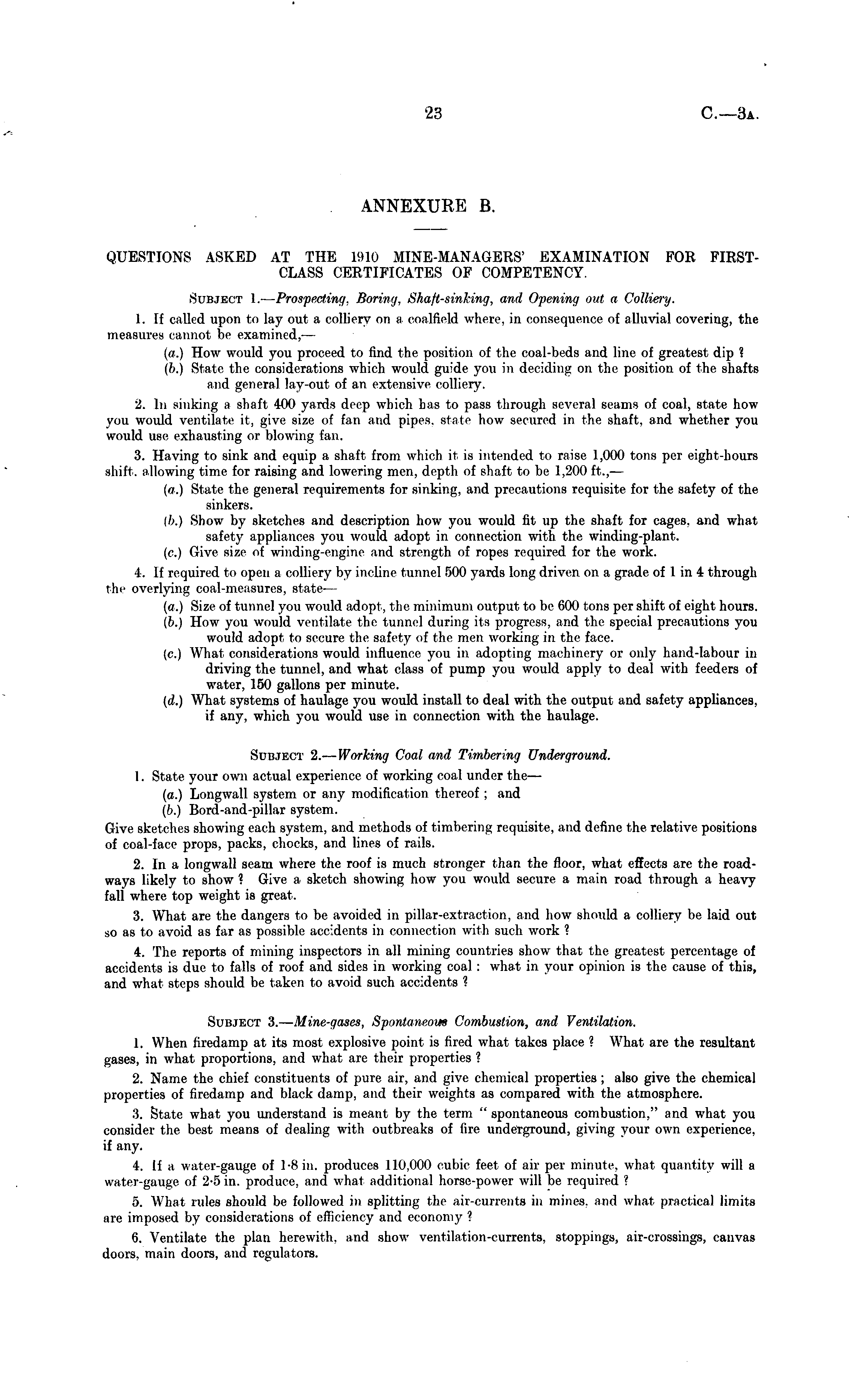 . ANNEXURE B. QUESTIONS ASKED AT THE 1910 MINE-MANAGERS' EXAMINATION FOR FIRSTCLASS CERTIFICATES OF COMPETENCY. Subject 1. — Prospecting, Boring, Shaft-sinking, and Opening out a Colliery. 1. If called upon to lay out a colliery on a coalfield where, in consequence of alluvial covering, the measures cannot be examined, — (a.) How would you proceed to find the position of the coal-beds and line of greatest dip ? (b.) State the considerations which would guide you in deciding on the position of the shafts and genera] lay-out of an extensive colliery. 2. In sinking a shaft 400 yards deep which has to pass through several seams of coal, state how you would ventilate it, give size of fan and pipes, state how secured in the shaft, and whether you would use exhausting or blowing fan. 3. Having to sink and equip a shaft from which it is intended to raise 1,000 tons per eight-hours shift, allowing time for raising and lowering men, depth of shaft to be 1,200 ft., — (a.) State the general requirements for sinking, and precautions requisite for the safety of the sinkers. (b.) Show by sketches and description how you would fit up the shaft for cages, and what safety appliances you would adopt in connection with the winding-plant, (c.) Give size of winding-engine and strength of ropes required for the work. 4. If required to open a colliery by incline tunnel 500 yards long driven on a grade of 1 in 4 through rhi' overlying coal-measures, state — (a.) Size of tunnel you would adopt, the minimum output to be 600 tons per shift of eight hours. (b.) How you would ventilate the tunnel during its progress, and the special precautions you would adopt to secure the safety of the men working in the face, (c.) What considerations would influence you in adopting machinery or only hand-labour in driving the tunnel, and what class of pump you would apply to deal with feeders of water, 150 gallons per minute. (d.) What systems of haulage you would install to deal with the output and safety appliances, if any, which you would use in connection with the haulage. Subject 2.— Working Coal and Timbering Underground. 1. State your own actual experience of working coal under the — (a.) Longwall system or any modification thereof ; and (6.) Bord-and-pillar system. Give sketches showing each system, and methods of timbering requisite, and define the relative positions of coal-face props, packs, chocks, and lines of rails. 2. In a longwall seam where the roof is much stronger than the floor, what effects are the roadways likely to show ? Give a sketch showing how you would secure a main road through a heavy fall where top weight is great. 3. What are the dangers to be avoided in pillar-extraction, and how should a colliery be laid out so as to avoid as far as possible accidents in connection with such work ? 4. The reports of mining inspectors in all mining countries show that the greatest percentage of accidents is due to falls of roof and sides in working coal: what in your opinion is the cause of this, and what steps should be taken to avoid such accidents ? Subject 3.— Mine-gases, Spontaneous Combustion, and Ventilation. 1. When firedamp at its most explosive point is fired what takes place ? What are the resultant gases, in what proportions, and what are their properties ? 2. Name the chief constituents of pure air, and give chemical properties ; also give the chemical properties of firedamp and black damp, and their weights as compared with the atmosphere. 3. State what you understand is meant by the term " spontaneous combustion," and what you consider the best means of dealing with outbreaks of fire underground, giving your own experience, if any. 4. li a water-gauge of 1-8 in. produces 110,000 cubic feet of air per minute, what quantity will a water-gauge of 2-5 in. produce, and what additional horse-power will be required ? 5. What rules should be followed in splitting the air-currents in mines, and what practical limits are imposed by considerations of efficiency and economy ? 6. Ventilate the plan herewith, and show ventilation-currents, stoppings, air-crossings, canvas doors, main doors, and regulators.