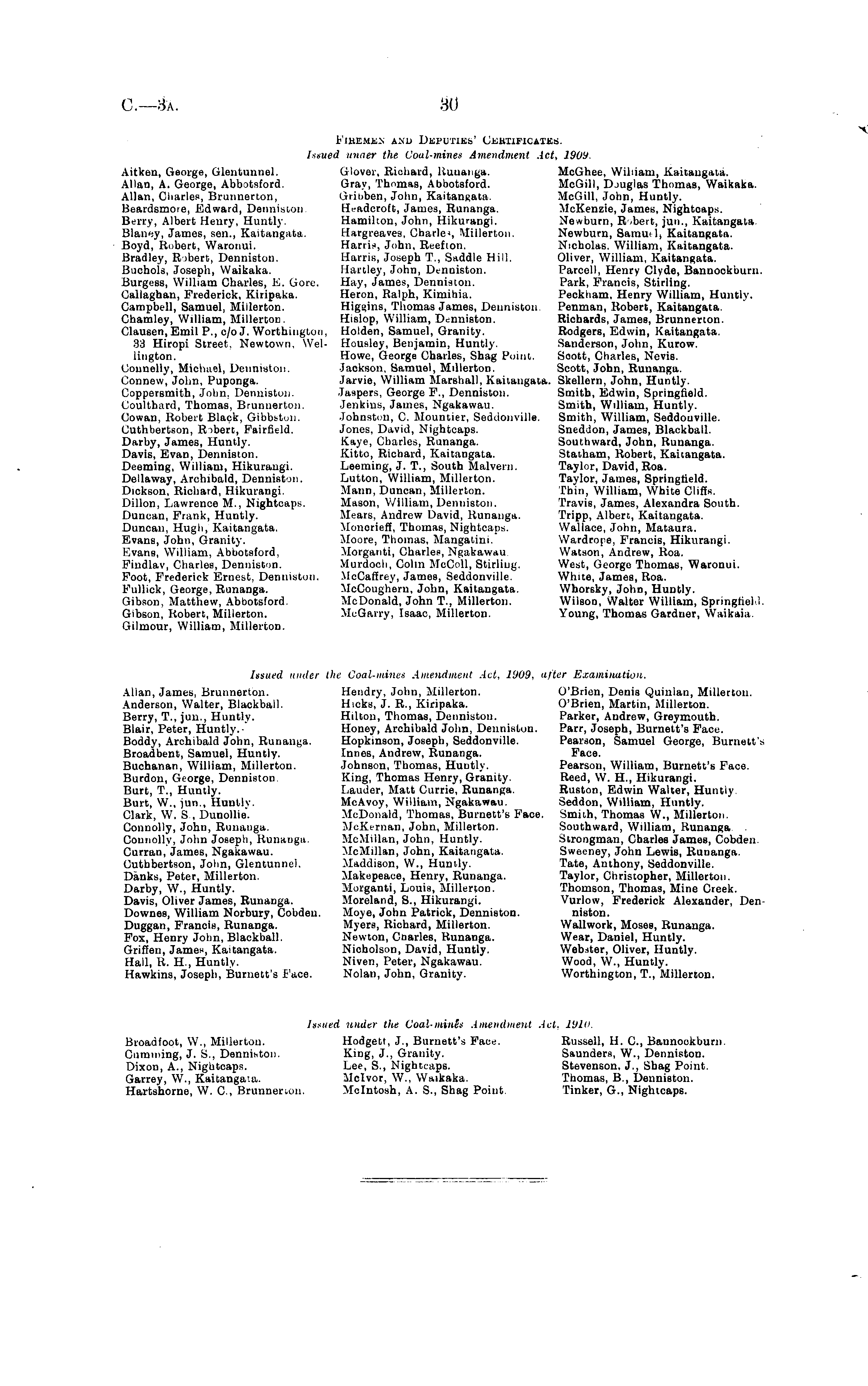 FiBE.MK> i.\u Deputies' Gebiificates. lowed imaer the Coal-mines Amendment Act, 1909. Aitkeu, George, Glentuunel. Glover, Richard, Huuanga. McGhee, Wiliiaru, Kaitangata. Allan, A. George, Abbatsford. Gray, Thomas, Abbotsford. McGill, Djuglas Thomas, Waikaka. Allan, Charles, Brunnerton, Gribben, John, Kaitangatu. MoGill, John, Huntly. Beardsmore, Edward, Dennlaton Headeroft, James, Runanga. McKenzie, James, Nightcaps. Berry, Albert Henry, Huntly. Hamilton, John, Hikurangi. Newburn, R .bert, jun., Kaitangata Blaney, James, sen., Kaitangata. lUrgreavea, Charles Millerton. Newburn, Sarautl, Kaitangatrt. Boyd, Robert, Waronui. Harris, John, Reefton. Nicholas. William, Kaitangata. Bradley, Robert, Dennistoii. Harris, Joseph T., Saddle Hill. Oliver, William, Kaitangata. Buchols, Joseph, Waikaka. Hartley, John, Denniston. Parcell, Henry Clyde, Bannockburn. Burgess, William Charles, B. Gore. Hay, James, Denniston. Park, Francis, Stirling. Callaghan, Frederick, Kiripaka. Heron, Ralph, Kimihiu. Peckham, Henry William, Huntly. Campbell, Samuel, Millerton. Hig°ins, Thomas James, Dennistoii Penman, Robert, Kaitangata. Chamley, William, Millerton. Hislop, William, Dcnnieton. Richards, James, Brunnerion. Clausen, Emil P., c/o J. Worthington, Holden, Samuel, Granity. Rodgers, Edwin, Kaitangata. 33 Hiropi Street. Newtown, Wei- Housley, Benjamin, Huntly. Sanderson, John, Kurow. lington. Howe, George Charles, Shag Point. Soott, Charles, Nevis. Connelly, Michael, Dennistoii. Jackson, Samuel, Millerton. Scott, John, Runanga. Connew, John, Puponga. larvie, William Marshal], Kaitangata. Skellern, John, Huntly. Coppersmith, John. Dennistoii. Jaspers, George F., Dennistoii. Smith, Edwin, Springfield. Coulthard, Thomas, Brumierton. Jenkins, James, Ngakawau. Smith, William, Huntly. Cowan, Robert Black, Gibbtton. Johnston, C. Mountier, Sedtlonville. Smith, William, Seddouville. Cuthbertson, Ribert, Fairfield. Jones, David, Nightcaps. Sneddon, James, Blackball. Darby, James, Huntly. Kaye, Charles, Runanga. Southward, John, Ruuanga. Davis, Evan, Dennistoii. Kitto, Richard, Kaitangata. Statham, Robert, Kaiiangata. Deeming, William, Hikurangi. Leeming, J. T., South Malvern. Taylor, David, Roa. Dellaway, Archibald, Deniiistm. Luttori, William, Milletton. Taylor, James, Springfield. Dickson, Richard, Hikurangi. Mann, Duncan, Millerton. Thin, William, White Cliffs. Dillon, Lawrence M., Nightcaps. Mason, William, Dennistoii. Travis, James, Alexandra South. Duncan, Frank, Huntly. Mears, Andrew David, Runanga. Tf'PP, Albert, Kaitangata. Duncan, Hugh, Kaitangata. Monorieff, Thomas, Nightcaps. Wallace, John, Mataura. Evans, John, Granity. Moore, Thomas, Mangatiui. Wardrobe, Francis, Hikurangi. Kvane, William, Abbotsford, Morganti, Charles, Ngakawau Watson, Andrew, Roa. Findlav, Charles, Denniston. Murdoch, Colin McColl, Stirling. West, George Thomas, Waronui. Foot, Frederick Ernest, Dennistoii. McCaffrey, James, Seddonville. White, James, Roa. Fullick, George, Runanga. McCougheru, John, Kaitangata. \Vhor6ky, John, Huntly. Gibson. Matthew, Abbotsford. McDonald, John T., Millerton. Wilson, Walter William, SpnngrioM. Gibson, Robert, Millerton. McGarry, Isaac, Millerton. Young, Thomas Gardner, Waikaia. Gilmour, William, Millerton. Issued under the Coal-mines Amendment Act, 1909, after Examination. Allan, James, Brunnerton. Hendry, John, Millerton. O'Brien, Denis Quiuian, Millerton. Anderson, Walter, Blackball. Hicks, J. R., Kiripaka. O'Brien, Martin, Millerton. Berry, T., jun., Huntly. Hilton, Thomas, Dennistoii. Parker, Andrew, Greymouth. Blair, Peter, Huntly.- Honey, Archibald John, Deunislun. Parr, Joseph, Burnett's Face. Boddy, Archibald John, Runanga. Hopkinson, Joseph, Seddonville. Pearson, Samuel George, Burnett's Broadbent, Samuel, Huntly. Innes, Andrew, Runanga. Face. Buchanan, William, Millerton. Johnson, Thomas, Huntly. Pearson, William, Burnett's Face. Burdon, George, Denniston King, Thomas Henry, Granity. Reed, W. H., Hikurangi. Burt, T., Huntly. Lauder, Matt Currie, Runanga. Ruston, Edwin Walter, Huntly. Burt, W., jun., Huntly. McAvoy, William, Ngakawau. Seddon, William, Huntly. Clark, W. S , Dunollie. McDonald, Thomas, Burnett's Face. Smith, Thomas W., Millerton. Connolly, John, Runanga. MoKernan, John, Millerton. Southward, William, Runanga Connolly, John Joseph, Runanga. McMillan, John. Huntly. Strongman, Charles James, Cobden Curran, James, Ngakawau. McMillan, John, Kaitangata. Sweeney, John Lewis, Ruuanga. Cuthbertson, John, Glentunnul. Maddison, W., Huntly. Tate, Anthony, Seddonville. Danks, Peter, Millerton. Makepeace, Henry, Runanga. Taylor, Christopher, Millerton. Darby, W., Huntly. Morganti, Louis, Millerton. Thomson, Thomas, Mine Creek. Davis, Oliver James, Runanga. Moreland, S., Hikurangi. Vurlow, Frederick Alexander, DenDownes, William Norbury, Cobden. Move, John Patrick, Denniston. niston. Duggan, Francis, Runanga. Myers, Richard, Millerton. Wallwork, Moses, Runanga. Fox, Henry John, Blackball. Newton, Caarles, Runanga. Wear, Daniel, Huntly. Griffen, James, Kaitangata. Nicholson, David, Huntly. Webster, Oliver, Huntly. Hall, R. H, Huntly. Niven, Peter, Ngakawau. Wood, W., Huntly. Hawkins, Joseph, Burnett's Face. Nolan, John, Granity. Worthington, T., Millerton. Ittutd undtr the Coul-mine.< Amendment Act, l'jLt' Broadfoot, W., Millerton. Hodgett, J., Burnett's Face. Russell, H. C, Baunookburn. Ciimining, J. S., Denniston. King, J., Granity. Saunders, W., Denniston. Dixon, A., Nightcaps. Lee, S., Nightcaps. Stevenson. J., Shag Point. Garrey, W., Kaitangaia. Mclvor, W., Waikaka,. Thomas, 8., Denniston. Hartshorne, W. C, Brunnerton. Molntosh, A. S., Shag Point Tinker, G., Nightcaps.