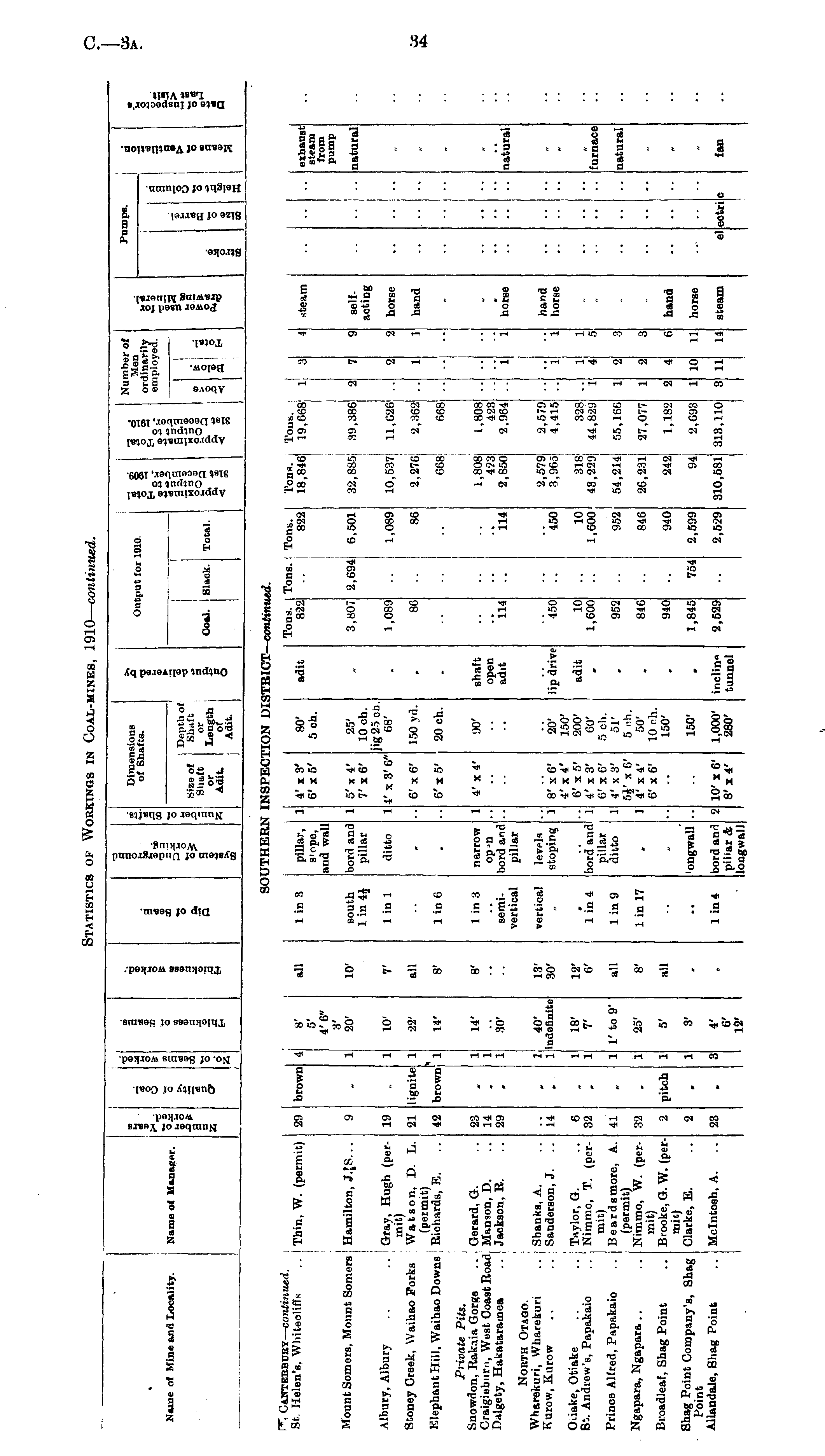 Maine of Mine and Locality. Name of Manncnr. V o OF 1 6 i o a a S 2 — 2 13 I. CD 50 a r. 00 1 I Depth of Size of Shaft Shaft or or Length Adit. of Adit. Dimensions of Shafts. s O 1 Output for 1910. "i Coal. I Slack. Total. ffi < 3 1 S III SOS Number of Men ordinarily employed. If Pumps. i a I i 3 i a ■3 g T. . SOUTHER1 INSPECl 'ION DISTRICTcontinu :u. "*■- Canterbury— continued. St. Helen's. Wliiteoliffs .. I Thin, W. (permit) 29 brown 8' 5' 4'6" 3' 20' •ill 1 in 3 pillar, S'ope, and wall 4' x 3' 6' x5' 80' adit 5 oh. Tons. I 822 Tons. Tons. 822 Tons, j Tons. 18,846 19,668 y *team exhaust steam from pump Mount Somors, Mount Somers Hamilton, J.JS... Albnry, Albury .. . . Gray, Hugh (permit) Stoney Creek, Waihao Forks Watson, D. L. (permit) Klepkant Hill, Waihao Downs ; Richards, E. 19 10' 10 , V south bord and 1 in i\ pillar 1 in 1 ditto o'x 4' V x6' V x 3' 6" 25' 10 ch. jig 25 oh. 68' 3,807 1,089 2,694| 6,501 1,089 32,885 39,386 10,537 11,C26| selfacting horse natural " ■21 lignite 22' all 6' x6' 150 yd. 80 86 2,276j 2,362 hand 42 brown 14' a' 1 in 6 6 -,V j 20 oh. 668 668 Private Pits. Snowdon, Rakaia Gorge .. Gerard, G. Craigiebnrn, West Coast Road Manson, D. D,ilgety, Hakatarainea .. Jaokson, R. 23 14 29 1 1 1 14' 8' 1 in 3 narrow op j n semi- bord and vertical pillar 4' x4' 'JO' shaft shaft open adit 1,808 1,808 423 423 2,850 2,964 '•I ■1 30' open adit 114 - i 114 1 1 • horse natural North Otago. Wharekuri, Wharekuri .. ; Shanks, A. Kurow, Kurow .. .. Sanderson, J. .. 1 1 40' indefinite 13' 80' vertical levpls stoping 8'x6' 4' x 4' 6' x5' 4' x3' 6' x 6' 4' x 3' 5J' x 6' 4' x4' 6'x6' 20' lip drivi 150' 200' adit 60' S ch. 51' 5 <;h. 50' 10 ch. 150' lip drive 450 ■ 450 2,579! 2,579 3,9651 4,415 hand horse U i *i 1 Oiiake, Otiake .. .. Taylor, G. St. Andrew's, Papakaio .. ' Niinmo, T. (permit) Prince Alfred, Papakaio .. j Beardsmore, A. (permit) Ngapara, Ngapara .. .. Nimmo, W. (permit) Bioadieaf, Shag Point .. Brooke, G.W. (permit) Shag Point Company's, Shag Clarke, E. Point Allandale, Shag Point .. Mclntosh, A. 6 32 41 39 1 1 18' 7' 1' to 9' 25' 12' 6' all 8' 1 in 4 bord and pillar 1 in 9 ditto 1 in 17 ] adit V 10 1,600 952 846 10 1,600 952 846 318 328 43,229| 44,82'J 54,214) 05,166 26,231 27,077 •i 1 4 31 1 5 ■^ furnace natural 2 pitch 5' all ■ ■ 940 940 242 1,182 4 ; 6 hand 2 3' m 'ongwall 150' 1,845 754 2,599 94 2,693 H 11 horse 23 4' 6' 12' 1 in 4 bord anH piMar & longwali 10' x 6' 8'x4' 1,000' incline 280' tunnel incline tunnel 2,529 2,529 310,581 313,1101 iii H steam el eotri c fan