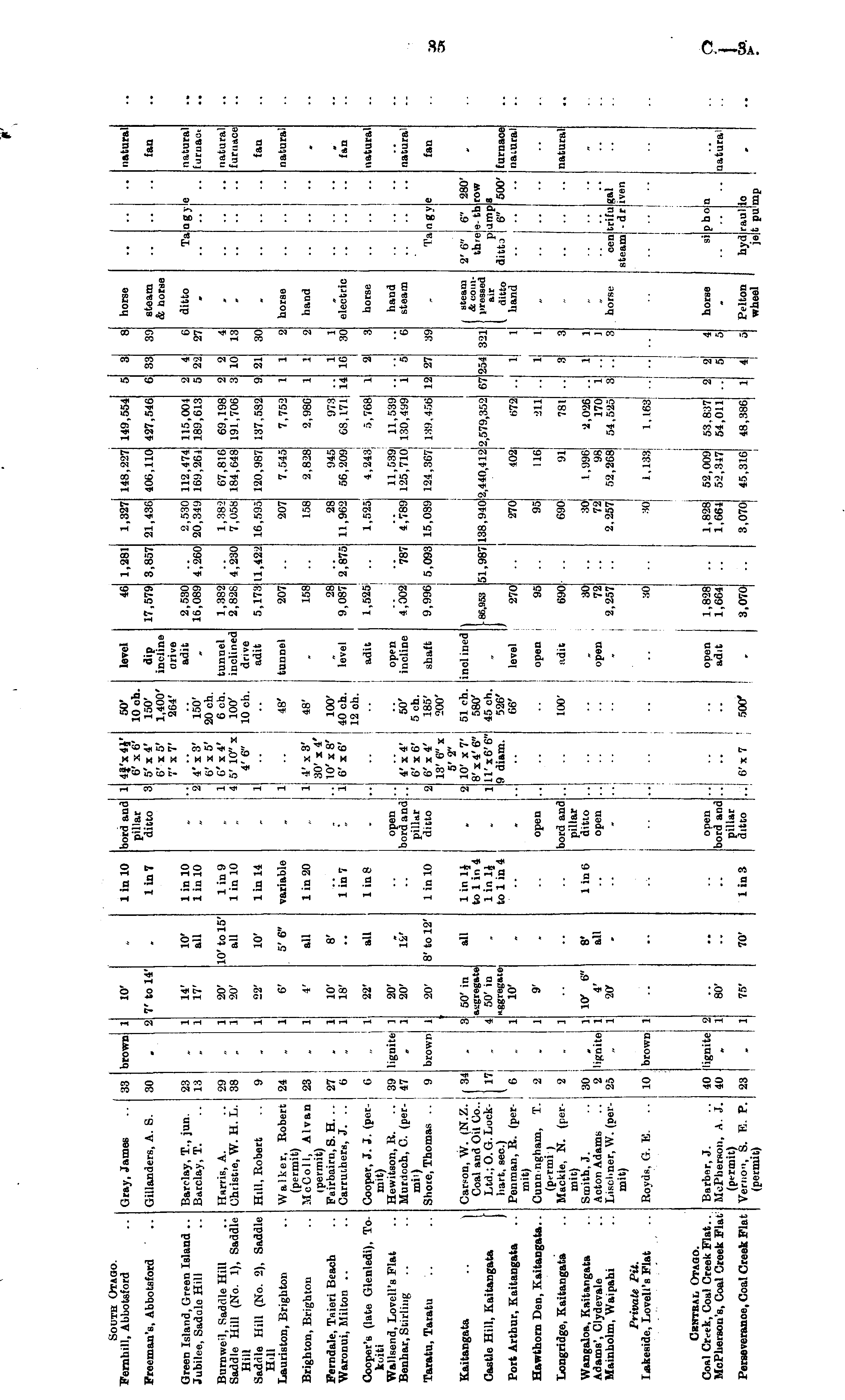 South Otago. Fernhill, Abbotsford Gray, James 33 brown 10' 1 in 10 bord and pillar ditto 4|'x4J' 6' X6' 5'x4' 6' x5' 7'x7' 50' 10 ch. 150' 1,400' 264' level 46 46 1,281 1,327 148,227 149,554 8] horse natural Freeman's, Abbotsford Gillanders, A. S. 30 V to 14' 1 in 7 dip 17,579 incline a rive adit 2,530 17,579 3,857 21,436 406,110 427,546 33 sal steam & iiorae fan Green Island, Green Island .. Jubilee, Sadalo Hill Barclay, T., jun. Barclay, T. 23 1 1 14' 17' 10' all 1 in 10 1 in 10 : 2 4' x3' 6' x5' C'x4' 5' 10" x 4' 6" 150' 20 ch. 6cb. 100' 10 ch. 2,530 16,089 4,260 2,530 20,349 112,474 169,261 115,004 189,613 ■2 5 4 •122 '27 ditto Ta Q gy Iβ natural 16,089 V Burnweil, Saddle Hill Saddle Hill (No. 1), Saddle Hill Sadole Hill (No. 2), Saddle Hill Lauriston, Brighton Hnrris, A. Christie, W. H. L. 2>.) 3S 1 1 20' 20' 10' to 15' all 1 in 9 1 in 10 1 tunnel 1,382 inclined 2,828 drive adit 5,173 1,382 2,828 4^230 1,382 7,058 67,816 184,648 69,198 191,706 ■> 3 2 10 1 13 natural furnace Hill, Robert 9 22' 10' Iinl4 5,173 11,422 16,595 120,987 137,582 21 3D fan Walker, Robert (permit) McColl, Alvan (permit) Fairbairu, S. H. .. Carrmhere, J. .. ■>i 6' 5'6" variable ■ • I 48' J tunnel 207 207 207 7,545 7,752 1 2 horse natural Brighton, Brighton ■23 4' all 1 in 20 4' x 3' 30' x 4' 10' x 8' 6' x6' 48' 158 158 158 2,828 2,986 1 d hand .. Perndale, Teieri Beach Waronui, Milton .. ■21 1 1 10' 18' 8' 1 in 7 I 100' 40 ch. 12 oh. 28 level 9,087 28 9,087 2] 875 28 11,962 945 56,209! 973 68,171 14 1 l(i 1 30 electric fan Cooper's (late Glenledi), Tokoiti Wallsend, Lovell's Flat Benhar, Stirling Cooper, J. J. (permit) Hewitson, K. Murdoch, 0. (permit) Shoie, Thomas .. V, " I 22 , all 1 in 8 adit 1,525 ] 1,525| 1,525 4,243j 5,768 I a horse natural ■" 3;i 47 lignite 1 20' 20' IV open j bord and pillar ditto 4' x4' 6' x6' 6'x 4' 13' 6" x 5' 2" • 10' x V 8'x4'6" U'x6'6" 9 diam. 50' 5ch. 185' 200' open incline 4,002| 4J002I 787 4^789 11,539 125,710 I 11,539 130,499 hand steam riatura' ' i r> 6 Taratu, Taratu 9 brown 20' 8' to 12' 1 in 10 shaft 9,996J 5,093 15,089 124,367 139, 453 12 27 39 Ta ngv |e fan Kaitangata .. 1 Castle Hill, Kaitangata Carson, W. (N.Z. Coal and Oil Co.. Ltd.jO.G.Luckliart, sec.) Penman, R. (permit) Cunn nghani, T. (p<rmi ) Mackie, N. (permit) Smith. J. Acton Adamb Lisclmer, W. (rjermit) 34 17 6 » 50' in aggregate 50' in aggregate 10' all 1 in 1 J to 1 in 4 linli to 1 in 4 . 51 ch. 580' 45 ch. 526' 66' inclined \ L 86,953 51,987 138,940 2,440,412 2,579,352 C7, 1254 ■121\ steam & compressed air ditto hand 2' 6" thre dittj 6' •;-th amp 6" 280' row 500' furnace natural Port Arthur, Kaitangata level 270 H 4O2| H72 1 •• Hawthorn Den, Kaitangata.. '2 9' open open ! 95 95 116 axi I Ijongridge, Kaitangata 2 bold and pillar ditto 100' adit 690 690i 91 781 3 3| natural VVangaloa, Kaitangata Adams', Clydevale Mainholm, Waipahi 30 2 25 m lignite] 1 1 1 10 , 6" 4' 20 , 8' all 1 in 6 open .. 30 open 72 , 2,257 30J 72 2,2571 1,996 98 52,268| •2,026 170 54,525' 3 1 1 8 horse cen steam •• trifu -dr gal iven - ..1 Private PU. I ,ake«ide, Lovell's Flat Royds. G. B. brown • - I - .. ! HO J 1,133 1.163 1(1 Crntbai. Otago. Coiil Creek, Coal Creek Flat.. McPheiBon's, Coal Creek Flat, Barber, J. MoPiierson, A. J. (permit) Ven.o... S. E. P. (permit) 1,828 1,661 3,070 horse 10 10 lignite 2 1 SO' open bord and pillar ditto open adit 1,828 1,664 52,009 52,347 53.837 54,011 2 ■2 5 r> all jn natura' .. Perseverance, Coal Creek Flat 23 76' 70 1 in 3 6'x 7 500* 3,070 45,316 48,386 Pelton wheel hyd raul t pu io mp P i|