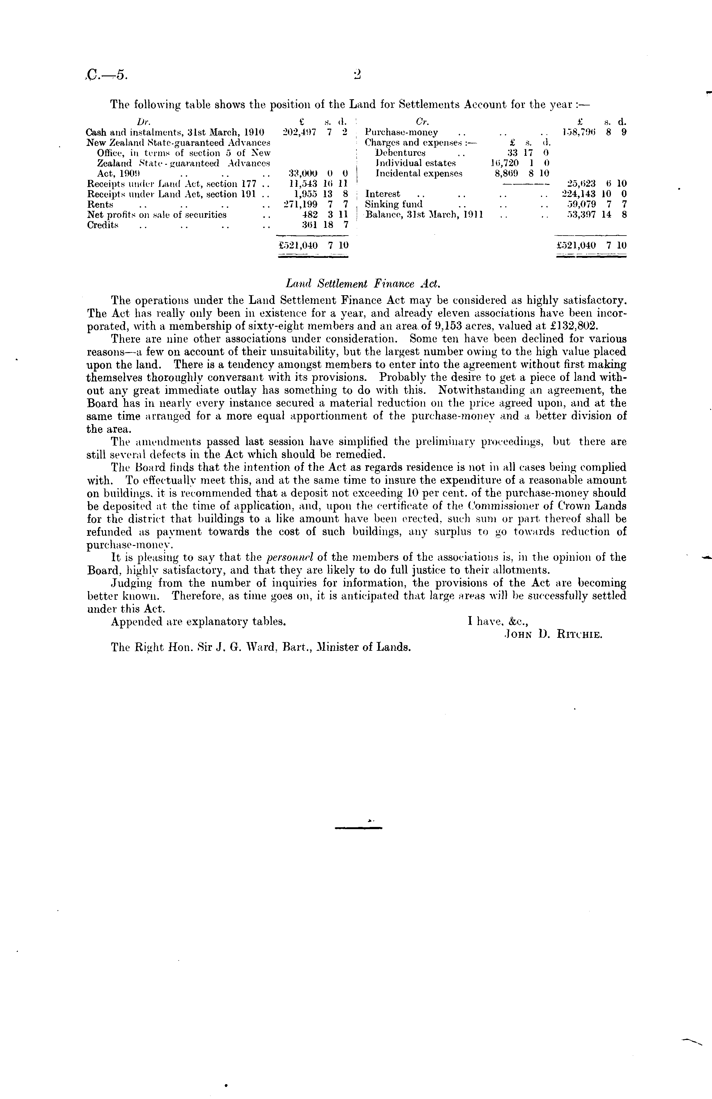 The following table shows the position of the Land for Settlements Account for the year : — Dr. y a. <l. Or. £ a. d. Cash and instalments, 31st March, 1910 202,407 7 2 Purchase-money .. .. .. 158,79 ii 8 9 New Zealand State-guaranteed Advances Charges and expenses:— £ s. d. Office, in terms of section 5 of New Debentures .. 33 17 0 Zealand State - guaranteed Advances Individual estates J<i,72O 1 0 Act, 1909 .. .. .. 33,000 o 0 Incidental expenses 8,8(59 8 10 Receipts under Land Ad. section 177 .. 11,543 lti 11 26,623 6 10 Receipts under Land Aot, section 191 .. 1,966 13 8 Interest .. .. .. .. 224,143 10 0 Rents .. .. .. .. 271,199 7 7 .Sinking fund .. .. .. 59,079 7 7 Net profits on sale of securities .. 482 311 Balance, 31st March, 1911 .. .. 53,397 14 8 Credits .. .. .. .. 361 18 7 £521,040 7 10 £521,040 7 10 Land Settlement Finance Act. The operations under the Lund Settlement Finance Act may be considered as highly satisfactory. The Act has really only been in existence for a year, and already eleven associations have been incorporated, with a membership of sixty-eight members and an area, of 9,153 acres, valued at £132,802. There are nine other associations under consideration. Some ten have been declined for various reasons —a few on account of their unsuitability, but the largest number owing to the high value placed upon the land. There is a tendency amongst members to enter into the agreement without first making themselves thoroughly conversant with its provisions. Probably the desire to get a piece of land without any great immediate outlay has something to do with this. Notwithstanding an agreement, the Board has in nearly every instance secured a material reduction on the price agreed upon, and at the same time arranged for a more equal apportionment of the purchase-money and a better division of the area. The amendments passed last session have simplified the preliminary proceedings, but there are still several defects in the Act which should be remedied. The Board finds that the intention of the Act as regards residence is not in all cases being complied with. To effectually meet this, and at the same time to insure the expenditure of a reasonable amount on buildings, it is recommended that a deposit not exceeding 10 per cent, of the purchase-money should be deposited at the time of application, and, upon the certificate of the Commissioner of Crown Lands for the district that buildings to a like amount have been erected, such sum or part thereof shall be refunded as paymeni towards the cost of such buildings, any surplus to go towards reduction of purchase-money. It is pleasing to say that the personnel of the members of the associations is, in the opinion of the Board, highly satisfactory, and that they are likely to do full justice to their allotments. Judging from the number of inquiries for information, tin , provisions of the Act are becoming better known. Therefore, as time goes on, it is anticipated that large areas will be successfully settled under this Act. Appended are explanatory tables. I have, &c, John D. Ritchie. The Right Hon. Sir J. G. Ward, Bart., Minister of Lands.