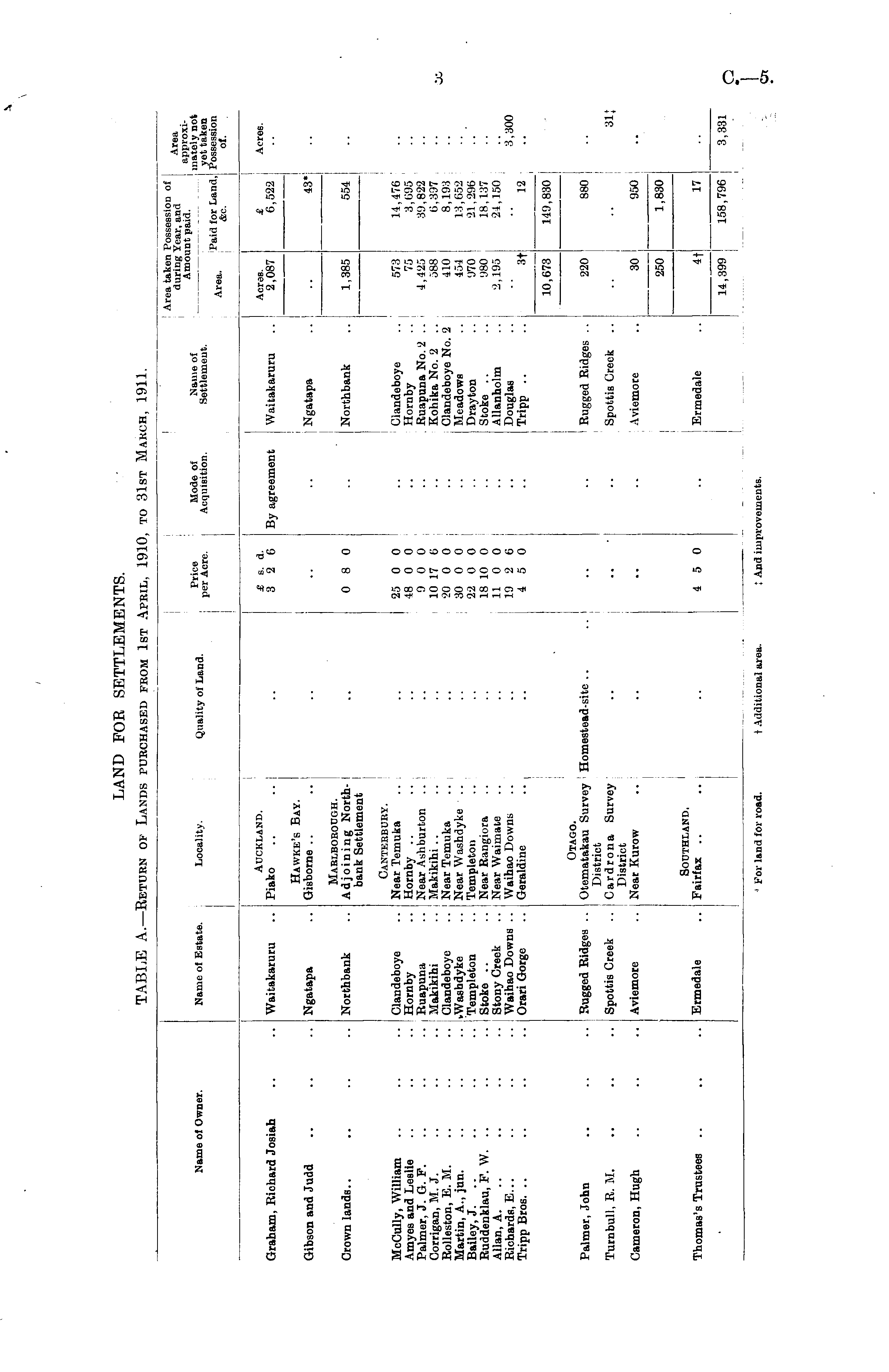 LAND FOR SETTLEMENTS. TABLE A.—Return of Lands purchased from 1st April, 1910, to 31st March, 1911.