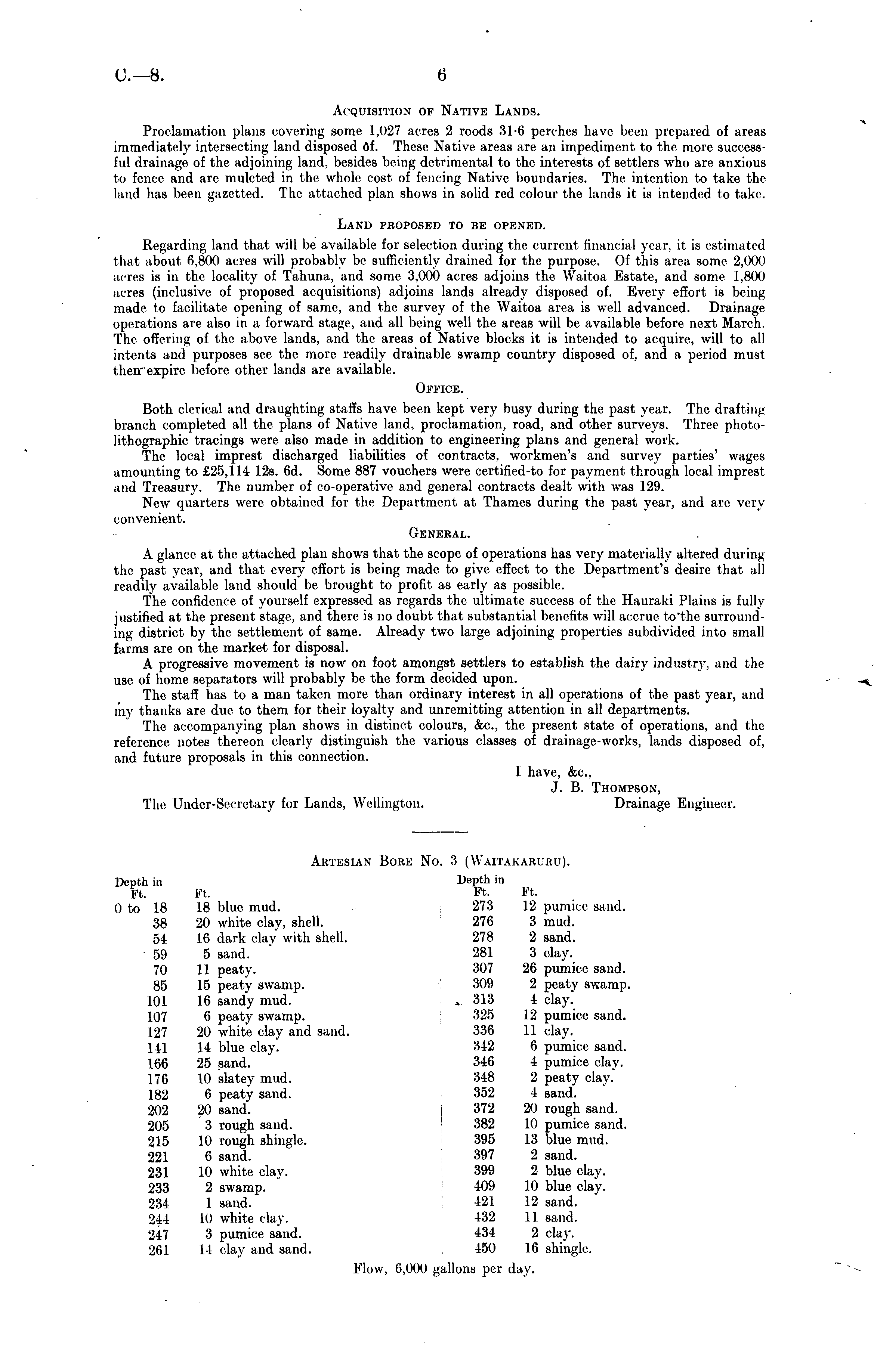 Proclamation plans covering some 1,027 acres 2 roods 31-6 perches have been prepared of areas immediately intersecting land disposed of. These Native areas are an impediment to the more successful drainage of the adjoining land, besides being detrimental to the interests of settlers who are anxious to fence and are mulcted in the whole cost of fencing Native boundaries. The intention to take the land has been gazetted. The attached plan shows in solid red colour the lands it is intended to take. Land proposed to be opened. Regarding land that will be available for selection during the current financial pear, it is estimated that about 6,8W acres will probably be sufficiently drained for the purpose. Of this area some 2.<H)<> acres is in the locality of Tahuna. and some 3,000 acres adjoins the Waitoa Estate, and some 1,800 acres (inclusive of proposed acquisitions) adjoins lands already disposed of. Every effort is being made to facilitate opening of same, and the survey of the Waitoa area is well advanced. Drainage operations are also in a forward stage, and all being well the areas will be available before next .March. The offering of the above lands, and the areas of Native blocks it is intended to acquire, will to all intents and purposes see the more readily drainable swam]) country disposed of, and a period must their expire before other lands are available. Office. Both clerical and draughting staffs have been kept very busy during the past year. The drafting branch completed all the plans of Native land, proclamation, road, and other surveys. Three photolithographic tracings were also made in addition to engineering plans and general work. The local imprest discharged liabilities of contracts, workmen's and survey parties' wages amounting to £25,114 12s. 6d. Some 887 vouchers were certified-to for payment through local imprest and Treasury. The number of co-operative and general contracts dealt with was 129. New quarters were obtained for the Department at Thames during the past year, and are very convenient. General. A glance at the attached plan shows that the scope of operations has very materially altered during the past year, and that every effort is being made to give effect to the Department's desire that all readily available land should be brought to profit as early as possible. The confidence of yourself expressed as regards the ultimate success of the Hauraki Plains is fully justified at the present stage, and there is no doubt that substantial benefits will accrue to "the surrounding district by the settlement of same. Already two large adjoining properties subdivided into small farms are on the market for disposal. A progressive movement is now on foot amongst settlers to establish the dairy industry, and the use of home separators will probably be the form decided upon. The staff has to a man taken more than ordinary interest in all operations of the past year, and my thanks are due to them for their loyalty and unremitting attention in all departments. The accompanying plan shows in distinct colours, &c, the present state of operations, and the reference notes thereon clearly distinguish the various classes of drainage-works, lands disposed of, and future proposals in this connection. I have, &c, J. B. Thompson, The Under-Secretary for Lands, Wellington. Drainage Engineer. Artesian Bokk No. •''> (Waitakaruru). Depth in Depth in Ft. Ft. Ft. Ft. oto 18 18 blue mud. 273 12 pumice sand. 38 20 white clay, shell. 276 3 mud. 5-1 16 dark clay with shell. 278 2 sand. • 59 5 sand. 281 3 clay. 70 11 peaty. 307 26 pumice sand. 85 15 peaty swamp. 30i> 2 peaty swamp. 101 16 sandy mud. , 313 4 clay. 107 6 peaty swamp. 325 12 pumice sand. 127 20 white clay and sand. 336 11 clay. 141 14 blue clay. 342 6 pumice sand. 166 25 sand. 346 4 pumice clay. 176 10 slatey mud. 348 2 peaty clay. 182 6 peaty sand. 352 4 sand. 202 20 sand. 372 20 rough sand. 205 3 rough sand. 382 10 pumice sand. 215 10 rough shingle. 395 13 blue mud. 221 6 sand. 397 2 sand. 231 10 white clay. 399 2 blue clay. 233 2 swamp. " 409 10 blue clay. 234 1 sand. 421 12 sand. ■J I 1 10 white clay. 432 11 sand. 217 3 pumice sand. 131 2 clay. 261 I 1 clay and sand. 450 16 shingle Flow, 6,000 gallons per day.