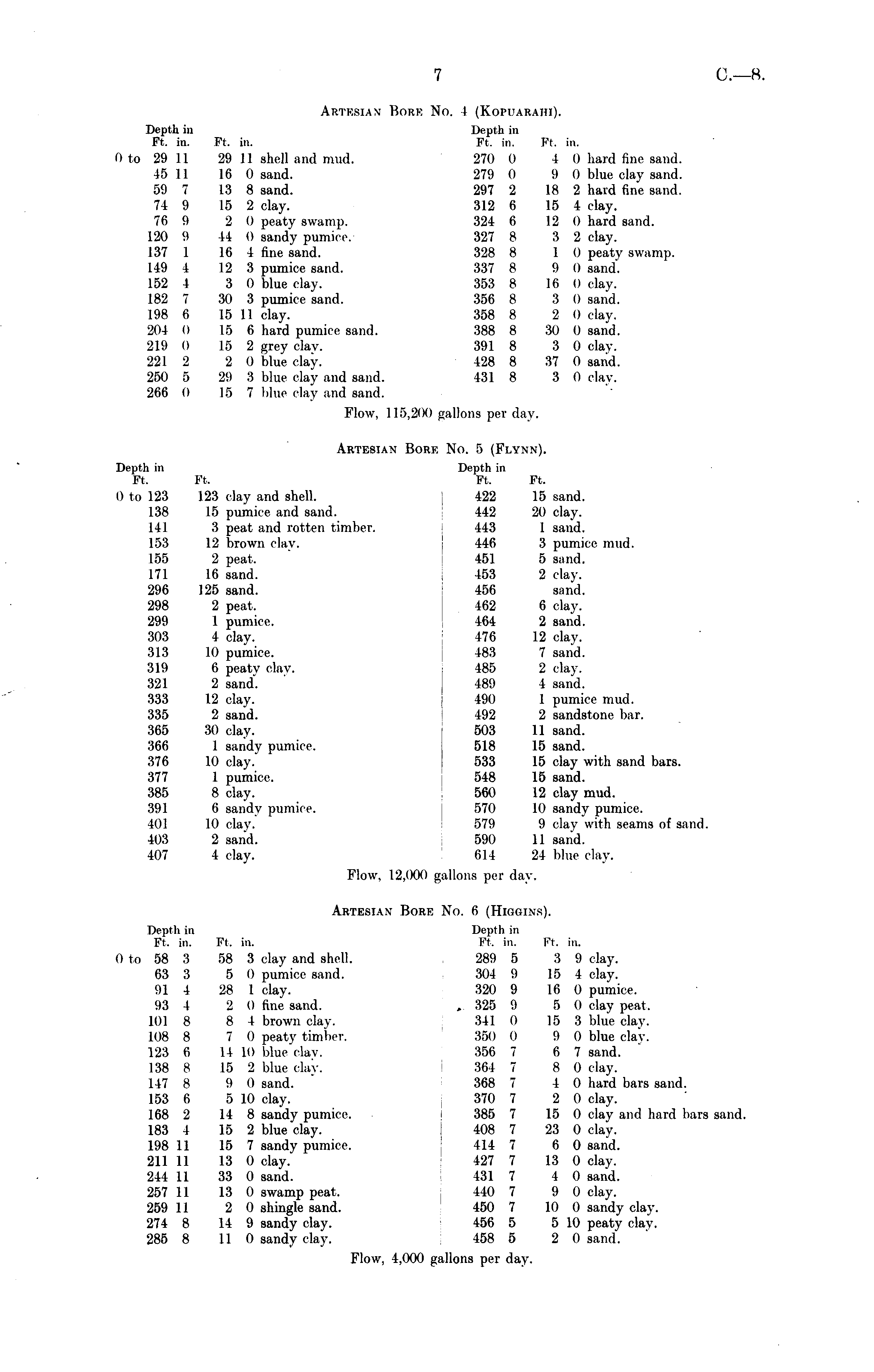 Artesian Bore No. I (Kopuarahi). Depth in Depth in Ft. in. Ft. in. Ft. in. Ft. in. oto 29 11 29 11 shell and mud. 270 0 I 0 hard fine sand. 15 11 16 0 sand. 279 0 9 0 blue clay sand. 59 7 13 8 sand. 297 2 18 2 hard fine sand. 74 9 15 2 clay. 312 6 15 4 clay. 76 9 2 0 peaty swamp. 324 6 12 0 hard sand. 120 ( .i 11 0 sandy pumice. 327 8 3 2 clay. 137 1 16 4 fine sand. 328 8 L 0 peaty swamp. 149 4 12 3 pumice sand. 337 8 9 0 sand. 152 4 3 0 blue day. 353 8 Lβ 0 day. 182 7 30 3 pumice sand. 356 8 3 0 sand. 198 6 15 11 clay. 358 8 2 0 clay. 2<M 0 15 6 hard pumice sand. 388 8 30 0 sand. 219 0 15 2 grey clay. 391 8 3 0 clay. 221 2 2 0 blue day. 428 8 37 0 sand. 250 5 29 3 blue clay and sand. 431 8 3 0 clay. 266 0 15 7 blue clay and sand. Flow, 115,200 gallons per day. Artesian Bore No. 5 (Flyxx). Depth in Depth in Ft. Ft Ft, Ft. 0 to 123 123 day and shell. 422 15 sand. 138 15 pumice and sand. 442 20 day. 141 3 peat and rotten timber. 443 1 sand. 153 12 brown clay. 446 3 pumice mud. 155 2 peat. 451 5 sand. 171 16 sand. 453 2 clay. 296 125 sand. 456 sand. 298 2 peal. 462 6 clay. 299 1 pumice. 464 2 sand. 303 4 clay. 476 12 clay. 313 10 pumice. 483 7 sand. 319 6 peaty clay. 485 2 clay. 321 2 sand. 489 4 sand. 333 12 clay. 490 1 pumice mud. 335 2 sand. 492 2 sandstone bar. 365 30 clay. 503 11 sand. 366 1 sandy pumice. 518 15 sand. 376 10 clay. 533 15 clay with sand bars. 377 1 pumice. 548 15 sand. 385 8 clay. 560 12 clay mud. 391 6 sandy pumice. 570 10 sandy pumice. 401 10 clay. 579 9 clay with seams of sand. 403 2 sand. 590 11 sand. 407 I day. 614 24 blue clay. Flow. 12,000 gallons per day. Artesian , Bore No. 6 (Higgins). Deptli in Depth in Ft. in. Ft. in. Ft. in. Ft. in. oto 58 3 58 3 clay and shell. 289 5 3 9 clay. 63 3 5 0 pumice sand. 304 9 15 4 day. 91 4 28 1 clay. 320 9 16 0 pumice. 93 I 2 0 Hue sand. 325 9 5 0 clay peal. 101 8 8 4 brown clay. 341 0 15 3 blue day. 1(18 8 7 0 peaty timber. 350 0 9 0 blue clay. 123 6 14 10 blue clay. 356 7 6 7 sand. 138 8 15 2 blue clay. 364 7 8 0 clay. 117 8 9 0 sand. 368 7 4 0 hard bars sand. 153 6 5 10 clay. 370 7 2 0 clay. 168 2 14 8 sandy pumice. 385 7 15 0 clay and hard bars sand. 183 1 15 2 blue clay. 408 7 23 0 day. 198 11 15 7 sandy pumice. 414 7 6 0 sand. 211 11 13 0 clay. 427 7 13 0 clay. 244 11 33 0 sand. 431 7 4 0 sand. 257 11 13 0 swamp peat, 440 7 9 0 clay. 259 11 2 0 shingle sand. 450 7 10 0 sandy clay. 274 8 14 9 sandy clay. 456 5 5 10 peaty clay. 285 8 110 sandy clay. 458 5 2 0 sand. Flow, 4,000 gallons per day.