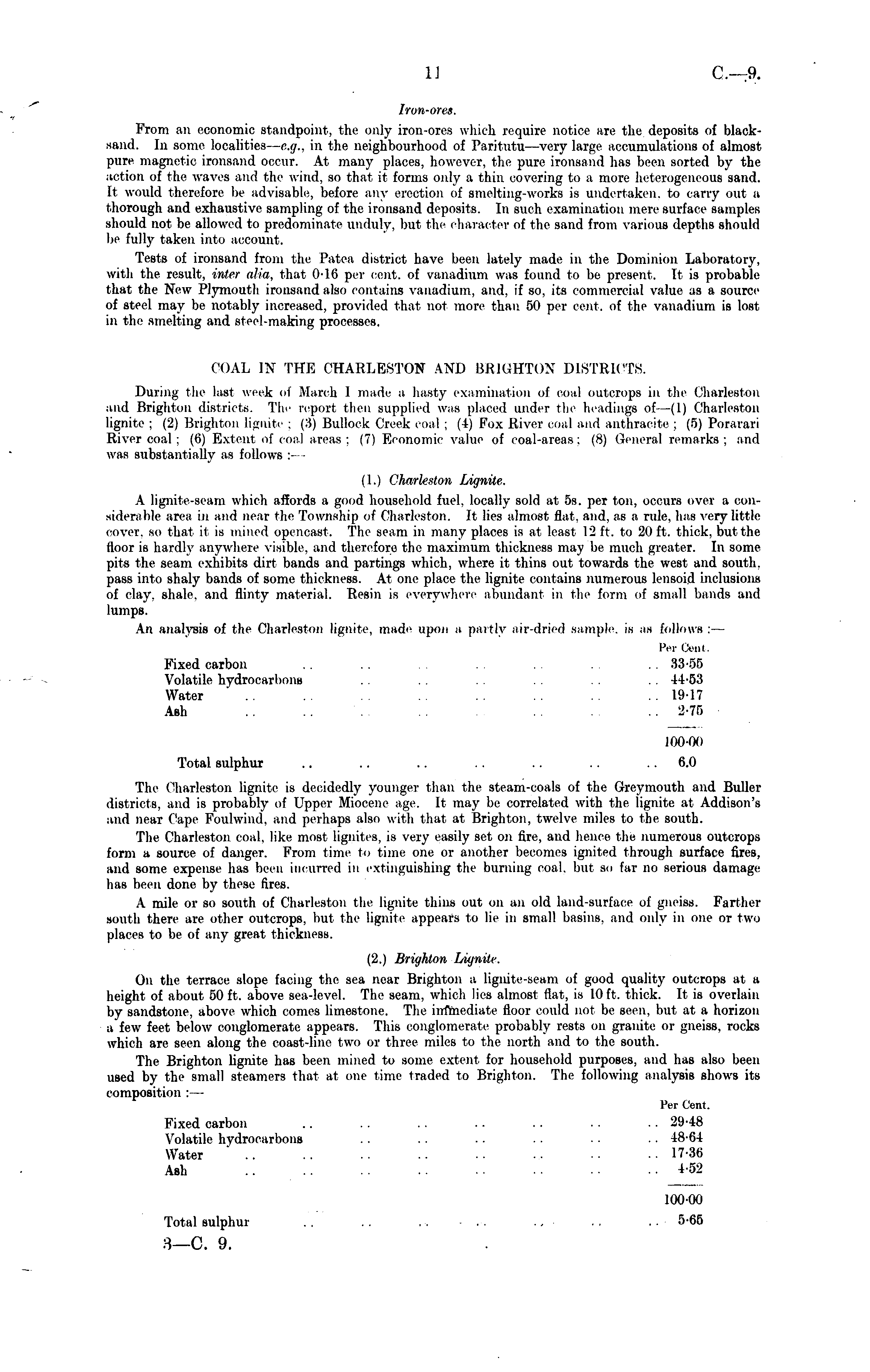 Iron-ores. From an economic standpoint, the only iron-ores which require notice are the deposits of blacksand. In some, localities — e.g.. in the neighbourhood of Paritutu —very large accumulations of almost pure magnetic ironsand occur. At many places, however, the pure ironsand has been sorted by the action of the waves and the wind, so that it forms only a thin covering to a more heterogeneous sand. It would therefore be advisable, before any erection of smelting-works is undertaken, to cany out a thorough and exhaustive sampling of the ironsand deposits. In such examination mere surface samples should not be allowed to predominate unduly, but the character of the sand from various depths should be fully taken into account. Tests of ironsand from the Paten district have been lately made in the Dominion Laboratory, with the result, inter alia, that 0-16 per cent, of vanadium was found to be present. It is probable that the New Plymouth ironsand also contains vanadium, and, if so, its commercial value as a source of steel may be notably increased, provided that not more than 50 per cent, of the vanadium is lost in the smelting and steel-making processes. COAL IN THE CHARLESTON AND BRIGHTON DISTRICTS. During the last week ol March I made a hasty examination of coal outcrops in the Charleston and Brighton districts. The report then supplied was placed under the headings of —(1) Charleston lignite ; (2) Brighton lignite ; (3) Bullock Creek coal ; (4) Fox River coal and anthracite ; (5) Porarari River coal; (6) Extent of coal areas; (7) Economic value of coal-areas; (8) General remarks; and was substantially as follows : (1.) Charleston Lignite. A lignite-seam which affords a good household fuel, locally sold at ss. per ton. occurs over a considerable area in and near the Township of Charleston. It lies almost flat. and. ;is :' rule, has very little cover, mi that it is mined opencast. The seam in many places is at least 12 ft. to 20 ft. thick, but the floor is hardly anywhere visible, and therefore the maximum thickness may be much greater. In some pits the seam exhibits dirt bands and partings which, where it thins out towards the west and south, pass into shaly bands of some thickness. At one place the lignite contains numerous lensoid inclusions of clay, shale, and flinty material. Resin is everywhere abundant in the form of small bands and lumps. An analysis of the Charleston lignite, made upon a partly air-dried sample, is as follows : — Per Cent. Fixed carbon .. .. . . . . .. . .. 33-55 Volatile hydrocarbons .. .. .. . . . . .. 44-515 Water .. .. . .. .. .. .. .. 19-17 Ash . . . . . . .. .. . . . 2-75 100-0(1 Total sulphur .. .. .. .. .. .. .. 6.0 The Charleston lignite is decidedly younger than the steam-coals of the Qxeymouth and Buller districts, and is probably of Upper Miocene age. It may be correlated with the lignite at Addison's and near Cape Foulwind, and perhaps also with that at Brighton, twelve miles t<, the south. Tin' Charleston coal, like most lignites, is very easily set on fire, and hence the numerous outcrops form a source of danger. From time to time one or another becomes ignited through surface fires, and some expense has been incurred in extinguishing the burning coal, but so far no serious damage has been done by these fires. A mile or so south <if Charleston tin , lignite thins out on an old land-surface of gneiss. Farther south then' are other outcrops, but the lignite appears to lie in small basins, and only in one or two places t<i be of any great thickness. (2.) Brighton Lignite. On the terrace slope facing the sea near Brighton a lignite-seam of good quality outcrops at a height of about 50 ft. above sea-level. The seam, which lies almost flat, is 10 ft. thick. It is overlain by sandstone, above which comes limestone. The immediate floor could not be seen, but at a horizon a few feet below conglomerate appears. This conglomerate probably rests on granite or gneiss, rocks which are seen along the coast-line two or three miles to the north and to the south. The Brighton lignite has been mined to some extent for household purposes, and has also been used by the small steamers that at one time traded to Brighton. The following analysis shows its composition : — Per Cent. Fixed carbon .. . . .. .. .. . . . 29-48 Volatile hydrocarbons .. .. .. • • • • ■ ■ 48-64 Water 17-36 Ash .. .. .. 4-62 100-00 Total sulphur . . . . . . . . . - . . . • 565 3—C. 9.