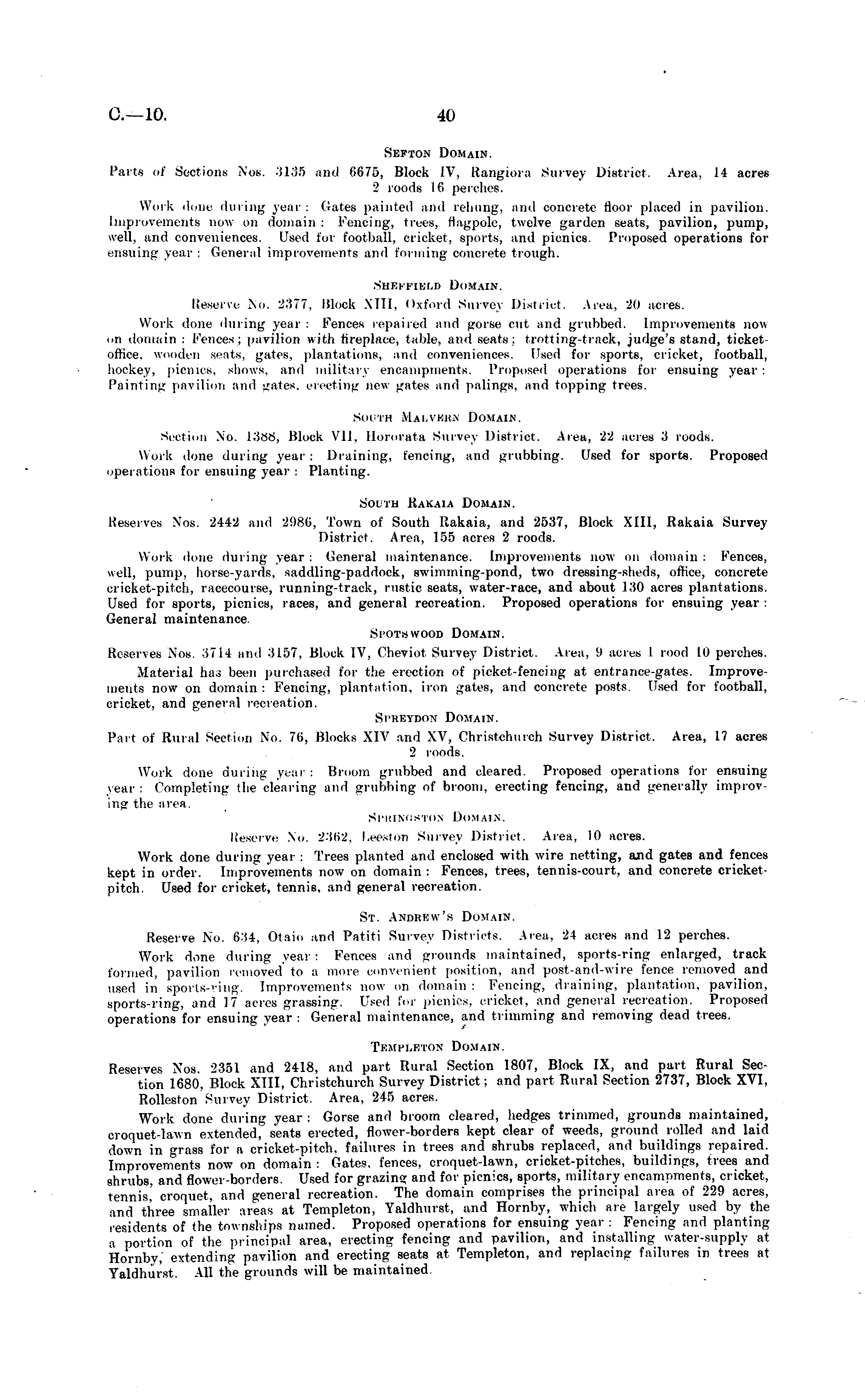 Sefton Domain. Parts nf Sections Nos. 3135 and <i(>7s, Block IV. Rangiora Survey District. Area, 14 acres 2 roods 16 perches. Work done during year: Hates painted and reining, and concrete floor placed in pavilion. improvements now on domain: Fencing, trees, flagpole, twelve garden seats, pavilion, pump, well, and conveniences. Used for football, cricket, sports, and picnics. Proposed operations for ensuing year : General improvements and forming concrete trough. Sheffield Domain. Reserve No. 2377, Block XIII, Oxford Survey District. Area, 20 acres. Work done during year: Fences repaired and gorse cut and grubbed. improvements now on domain : Fences; pavilion with fireplace, table, and seats; trotting-track, judge's stand, ticketoffice, wooden seats, gates, plantations, and conveniences. Used for sports, cricket, football, hockey, picnics, shows, ami military encampments. Proposed operations for ensuing year : Painting pavilion and gates, erecting new gates and palings, and topping trees. Sot in M .u.vkkn Domain. Section Xo. 1388, Block VII, Hororata Survey District. Area, 22 acres ;; roods. Work done during year: Draining, fencing, and grubbing. Used for sports. Proposed operations for ensuing year : Planting. South Rakaia Domain. Reserves Xos. 2442 and 2986, Town of South Rakaia, and 2537, Block XIII, Rakaia Survey District. Area, 155 acres 2 roods. Work done during year ; General maintenance. Improvements now on domain ; Fences. well, pump, Imrse cards, saddling-paddock, swimming-pond, two dressing-sheds, office, concrete cricket-pitch, racecourse, running-track, rustic seats, water-race, and about 130 acres plantations. Used for sports, picnics, races, and general recreation. Proposed operations for ensuing year : General maintenance. S cuts wood Domain. Hi serves Xos. 3714 ami 3157, Block IV, Cheviot Survey District, Area, 9 acres I rood 10 perches. Material has been purchased for the erection of picket-fencing at entrance-gates. Improvements now on domain : Fencing, plantation, iron gates, and concrete posts. Used for football, cricket, and general recreation. Si'REyoon Domain. Pari of Rural Section Xo. 76, Blocks XIV and XV, Christchurch Survey District. Area, 17 acres 2 roods. Work done during v.ar : Broom grubbed and cleared. Proposed operations for ensuing \ear: Completing the clearing and grubbing of broom, erecting fencing, and generally improving the area. SPKINOSTON Domain. Reserve No. 2362, Leeston Survey District. Area, 10 acres. Work done during year : Trees planted and enclosed with wire netting, and gates and fences kept in order. Improvements now on domain : Fences, trees, tennis-court, and concrete cricketpitch. Used for cricket, tennis, and general recreation St. Andrew's Domain. Reserve No. 634. Otaio and Patiti Survey Districts. Ana. 21 acres and 12 perches. Work done during year: Fences and grounds maintained, sports-ring enlarged, track formed, pavilion removed to a more convenient position, and post-ami-wire fence removed and used in sports-ring. Improvements now on domain : Fencing, draining, plantation, pavilion, sports-ring, ami 17 acres grassing. Used for picnics, cricket, and general recreation. Proposed operations for ensuing year: General maintenance, and trimming and removing dead trees. Templeton Domain. Reserves Nos. 2351 and 2418. and part Rural Section 1807, Block IX, and pari Rural Section 1680, Block XIII, Christchurch Survey District; and part Rural Section 2737, Block XVI, Rolleston Survey District. Area, 245 acres. Work done during year : Gorse and broom cleared, hedges trimmed, grounds maintained, croquet-lawn extended, seats erected, flower-borders kept clear of weeds, ground rolled and laid down in grass for a cricket-pitch, failures in trees and shrubs replaced, and buildings repaired. Improvements now on domain : Gates, fences, croquet-lawn, cricket-pitches, buildings, trees and shrubs, and flower-borders. Used for grazing and for picnics, sports, military encampments, cricket, tennis, croquet, and general recreation. The domain comprises the principal area of 229 acres, and three smaller areas at Templeton, Yaldhurst, and Hornby, which are largely used by the residents of the townships named. Proposed operations for ensuing year : Fencing and planting a portion of the principal area, erecting fencing and pavilion, and installing water-supply at Hornby, extending pavilion and erecting seats at Templeton, and replacing failures in trees at Yaldhurst, All the grounds will be maintained.