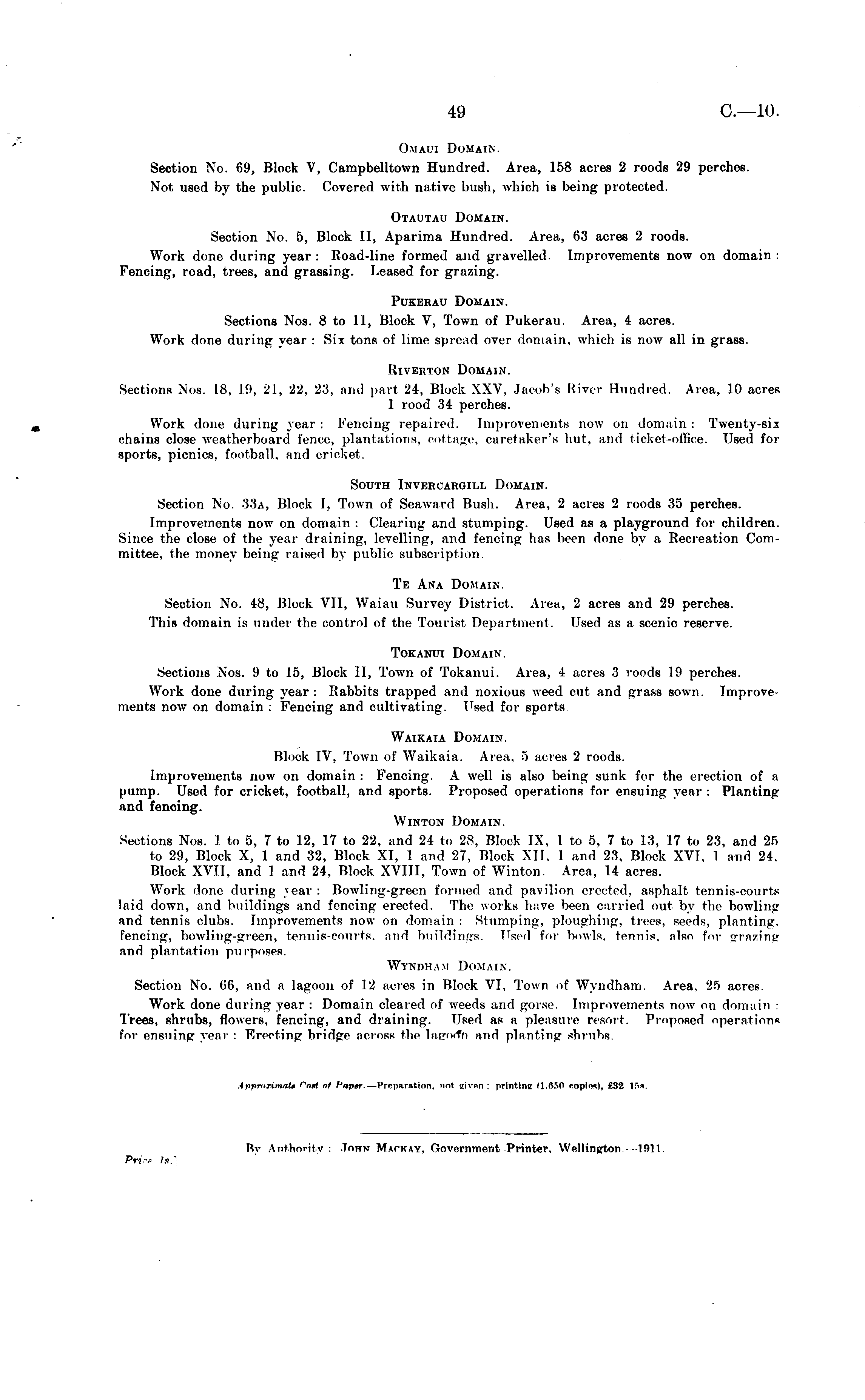 Omaui Domain Section No. 69, Block V, Campbelltown Hundred. Area, 158 acres 2 roods 29 perches. Not used by the public. Covered with native bush, which is being protected. Otautau Domain. Section No. 5, Block 11, Aparima Hundred. Area, 63 acres 2 roods. Work done during year: Road-line formed and gravelled. Improvements now on domain: Fencing, road, trees, and grassing. Leased for grazing. Pukerau Domain. Sections Nos. Bto 11, Block V, Town of Pukerau. Area, 4 acres. Work done during year : Six tons of lime spread over domain, which is now all in grass. Riverton Domain. Sections Xos. is, 19, 21, 22. 23, ami part 24, Block XXV, Jacob's River Bund red. Area, 10 acres 1 rood 34 perches. m Work done during year : Fencing repaired. Improvements now on domain ; Twenty-six chains close weatherboard fence, plantations, cottage, caretaker's hut, and ticket-office. Used for sports, picnics, football, and cricket. South Invercargill Domain. Section No. 33a, Block I, Town of Seaward Bush. Area, 2 acres 2 roods 35 perches. Improvements now on domain : Clearing and stumping. Used as a playground for children. Since the close of the year draining, levelling, and fencing has been done by a Recreation Committee, the money being raised by public subscription. Te Ana Domain. Section No. 48, Block VII, Waiau Survey District. Area, 2 acres and 29 perches. This domain is under the control of the Tourist Department. Used as a scenic reserve. Tokanui Domain. Sections Xos. 9to 15, Block 11, Town of Tokanui. Area, 4 acres 3 roods 19 perches. Work done during year: Rabbits trapped and noxious weed cut and grass sown Tmprovenients now on domain . Fencing ami cultivating Used for sports Waikaia Domain. Block IV, Town of Waikaia. Area. 5 acres 2 roods. Improvements now on domain : Fencing. A well is also being sunk for the erection of a pump. Used for cricket, football, and sports. Proposed operations for ensuing year ; Planting and fencing. Winton Domain. Sections Nos. 1 to 5, 7 to 12, 17 to 22, and 21 to 28, Block IX, 1 to 5. 7 to 13, 17 to 23, and 25 to 29, Block X, 1 and 32, Block XI, 1 and 27. Block XII, I and 23, Block XVI, 1 and 24. Block XVII, and I and 24, Block XVIII, Town of Winton. Area, 14 acres. Work done during year: Bowling-green formed and pavilion erected, asphalt tennis-courts laid down, and buildings and fencing erected. The works have been carried out by the bowling and tennis clubs, improvements now on domain: Stumping, ploughing, trees, seeds, planting, fencing, bowling-green, tennis-courts, and buildings. Used for bowls, tennis, also for grazing and plantation purposes. Wyndham Domain. Section No. 66. and a lagoon of 12 acres in Block VI, Town of Wyndham. Area. 25 acres. Work done during year : Domain cleared of weeds and gorse. Improvements now on domain : Trees, shrubs, flowers, fencing, and draining. Used as a pleasure resort. Proposed operation* for ensuing year : Erecting- bridge across the lagoirfi ami planting shrubs.