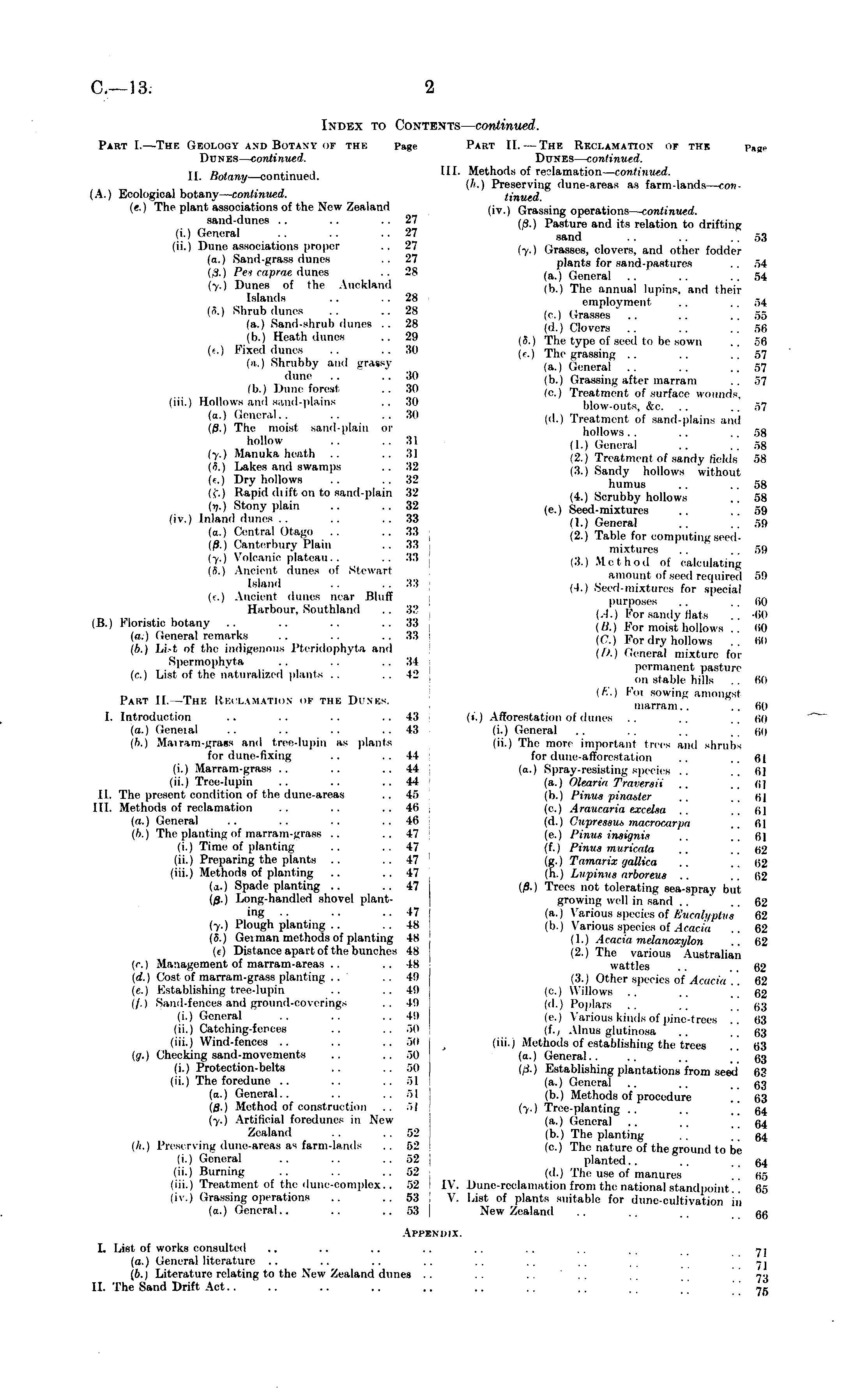 Index to Contents— continued. Part I.—Thk Geology and Botany of the Page Part 11. — The Reclamation <>f the p sgP Dunes— continued. Dunes — continued. 11. Botany— oontinued. [lx Methods of reclamation— continued. (/'.) Preserving dune-areas as farm-lands—con-(A.) Ecological botany— continued. tinned. («.) The plant associations of the New Zealand , iv , Grassing operations— continued. sand-dunes .. .. ..27 (,8.) Pasture and its relation to drifting (i.) General .. .. ..27 sand ,_ - )3 (n.) Dune associations proper .. 27 (7.) Grasses, clovers, and other fodder (a.) Sand-grass dunes .. 27 plants for sand-pastures .. 54 (0.) Pcs copras dunes .. 28 (a.) General 54 (7.) Dunes of the Auckland (b-) The nnnua j | upmg> anrl (hpjr Wfnds .. .. 28 employment .. . 54 («.) Shrub dunes .. ..28 (f . , (; rass( . s ,_ (a.) Sand-shrub dunes .. 28 (d.) Clovers 56 (b.) Heath dunes .. 29 (*.) The type of seed to be sown . 56 (<•) B"uted dunes . .. 30 ((! .) The grassing .. ..57 (a.) Shrubby and grassy _ (a.) General .. ..57 , ' lml( ' •• •• ■'"' (b.) Grassing after marram .. .17 •„„ (0.) Dune fares! .. 30 (0.) Treatment of surface wounds, (in.) Hollows and sand-plains .. 30 blow-outs, &c. .. 57 (a.) General.. .. 30 (d.) Treatment of sand-plains and OS.) The mois! sand-plam or hollows .-,8 „ h "","\ . •• ■• jjj (I.) General .. .. 58 7.) Manuka heath .. .. 31 (2.) Treatment of sandy fields 58 J.) Lakes and swamps .. 32 (3.) Sandy hollows without («. Dry hollow S .. .32 1,,,,,,,,, M (£) Rapid diift on to sand-plain 32 (4.) Scrubby hollows 58 (~) Stony plain .. ..32 (c.) Seed-mixtures .. 59 (iv.) Inland dunes 33 (|.) General .. 59 («.) Centra Otago .. .. 38 (2 ., Table for computing seed(/S.) Canterbury Plain .. 33 mixtures 59 (7) Volcanic plateau 33 (3.) Method of calculating (».) Ancient dunes of Stewart amount of seed requirea 59 , . lB fand .. S3 (4-) Seed-mixtures for special («.) Ancient dunes near Bluff , purposes .. . 80 „ L Harbour. Southland .. 32 L 4.) For sandy flats 80 (B.) Moristic botany . 33 (B.) For moist hollows .. 80 -.General remarks . . . 33 (C.) For dry hollows .. 60 (b.) Li-t of the indigenous Ptendophyta and (ll] (; ,, |(Ta| |n|x( , lr( . fof Spermophyta .. 34 permanent pasture (c) List of the naturalized plants .. .. 12 on stable hflls .. 60 „ ~ ,„ ~ ~ l/ '--) POl sowing amongst Part ll.—The Reclamation ok thk, Dink-.. marram 80 I. Introduction .. .. .. .. 4,' i (»'.) Afforestation of dunes .. .. gn (a.) General .. .. .. ..43 (i.) General .. .. .. .. tin (b.) Marram-grass and tree.lupin as plants (ii.) The more important lives and shrubs for dime-fixing .. ..44 for dune-afforestation .. ..61 (i.) Marram-grass .. .. ..44 (a.) Spray-resisting species .. (il (ii.) Tree-lupin .. .. ..44 (a.) Olearia Traversii .. (il 11. The present condition of the dune-areas .. 15 (b.) Pinus pinaster ~ til 111. Methods of reclamation .. .. .. 46 (c.) Araucaria excelm ill (a.) General .. .. .. .. 46 (d.) Cupressut macrocarpa .. 6] (b.) The planting of marram-grass .. ..47 (c.) Pinut insignia .. 11l (i.) Time of planting .. ..47 (f.) Pinua muricata .. .. <;2 (ii.) Preparing the plants .. ..47 (g.) Tamarix gallica .. .'.62 (iii.) Methods of planting .. ..47 (h.) Lupinut arboreus .. 62 (a.) Spade planting .. ..47 (0.) Trees not tolerating sea-spray but (ff.) Long-handled shovel plant- growing well in sand .. ' ..62 iug .. .. ..I" (a.) Various species of Eucalyptut 62 (7.) Plough planting .. .. ts (b.) Various species of Acacia .. 62 (5.) Geiman methods of planting 48 (1.) Acacia melanoxi/lon . 62 ( £ ) Distance apart of the bunches 48 (2.) The various 'Australian (r.) Management of marram-areas . . 48 wattles .. 62 \d.) Cost of marram-grass planting .. .. 49 (3.) Other species of Acacia.'. 62 (r.) Establishing tree-lupin .. ..49 (c.) Willows ~ 62 (/.) Sand-fences and ground-coverings .. 49 (d.) Poplars .. .. 63 (i.) General .. .. .. 49 (c.) Various lands of pine-trees .. 63 (ii.) Catching-fences .. .. 50 (f. ; Alnus glutinosa ..63 (iii.) Wind-fences .. .. .. 50 (iii.) Methods of establishing the trees .. 63 ('/.) Checking sand-movements .. .. 50 (a.) General.. .. .. 63 (i.) Protection-belts .. .. 50 (,A) Establishing plantations from seed 63 (ii.) The foredune .. .. ..51 (a.) General .. .. 63 (a.) General.. .. .. 51 (b.) Methods of procedure 63 (8.) Method of construction .. 51 (7.) Tree-planting .. .. '.! 64 (7.) Artificial foredunes in New (a.) Genera] .. 64 Zealand .. .. 52 (b.) The plantiiiL' .. .64 (A.) Preserving dune-areas as farm-lands .. 52 (c.) The nature of the ground to be (i.) General .. .. ..52 planted.. .. .64 (ii.) Burning .. 62 j (d.) The use of manures '.' 65 (iii.) Treatment of the dune-complex.. 52 IV. Dune-reclamation from the national standpoint 65 (iv.) (irassing operations .. ..53 V. List of plants suitable for dune-cultivation in (a.) General.. .. .. .">:{ New Zealand .. .. .. ..66 AI'PKNIIIX. I. List of works consulted .. .. .. .. .. .. y, (a.) General literature .. .. .. .. .. .. ~ -■ (6.) Literature relating to the New Zealand dunes .. .. .. .. -•> 11. The Sand Drift Act.. .. .. .. .. .. .. .. .' y B