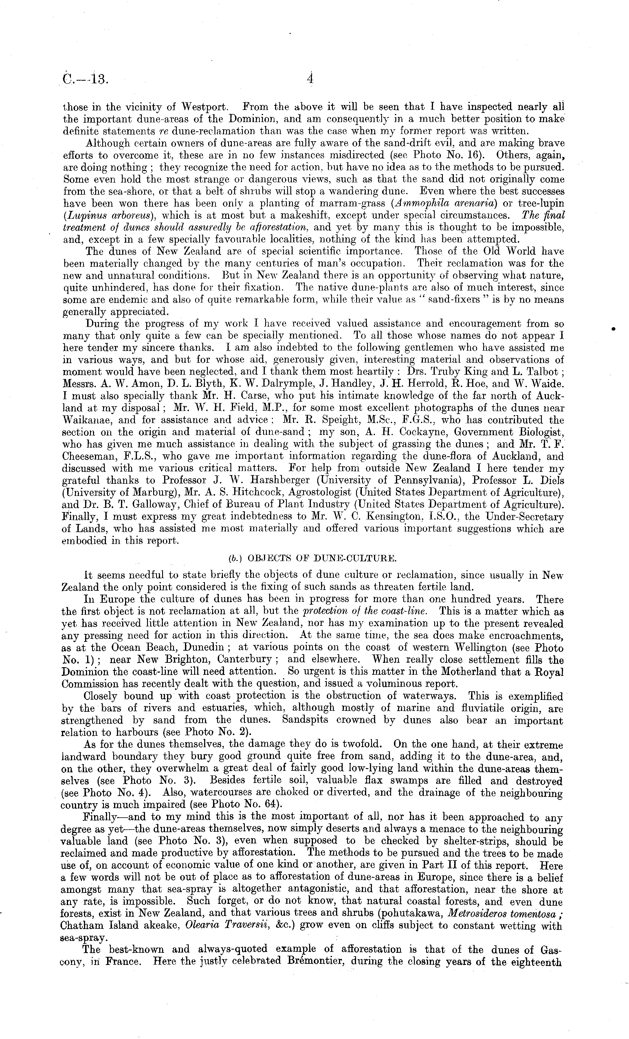 those in the vicinity of Westport. From the above it will be seen that I have inspected nearly all the important dune-areas of the Dominion, and am consequently in a much better position to make definite statements re dune-reclamation than was the case when my former report was written. Although certain owners of dune-areas are fully aware of the sand-drift evil, and are making brave efforts to overcome it, these are in no few instances misdirected (see Photo No. 16). Others, again, are doing nothing : they recognize the need for action, but have no idea as to the methods to be pursued. Some even hold the most strange or dangerous views, such as that the sand did not originally come from the sea-shore, or that a belt of shrubs will stop a wandering dune. Even where the best successes have been won there has been only a planting of marram-grass (Ammophila arenaria) or tree-lupin (Lupinus arboreus), which is at most but a makeshift, except under special circumstances. The final treatment of dunes should assuredly he afforestation, and yet by many this is thought to be impossible, and, except in a few specially favourable localities, nothing of the kind has been attempted. The dunes of New Zealand are of special scientific importance. Those of the Old World have been materially changed by the many centuries of man's occupation. Their reclamation was for the new and unnatural conditions. But in New Zealand there is an opportunity of observing what nature, quite unhindered, has done for their fixation. The native dune-plants are also of much interest, since some are endemic and also of quite remarkable form, while their value as " sand-fixers " is by no means generally appreciated. During the progress of my work I have received valued assistance and encouragement from so many that only quite a few can be specially mentioned. To all those whose names do not appear I here tender my sincere, thanks. lam also indebted to the following gentlemen who have assisted me in various ways, and but for whose aid, generously given, interesting material and observations of moment would have been neglected, and I thank them most heartily : Drs. Truby King and L. Talbot; Messrs. A. W. Arnoii, I). L. Blyth, K. W. Dalrymple, J. Handley, J. H. Herrold, R. Hoe, and W. W'aide. I must also specially thank Mr. H. Carse, who put his intimate knowledge of the far north of Auckland at my disposal; Mr. W. H. Field, M.P., for some most excellent photographs of the dunes near Waikanae, and for assistance and advice ; Mr. R. Speight, M.Sc, F.G.S., who has contributed the section on the origin and material of dune-sand ; my son, A. H. Cockayne, Government Biologist. who has given me much assistance in dealing with the subject of grassing the dunes ; and Mr. T. F. Cheeseman, F.L.S., who gave me important information regarding the dune-flora of Auckland, and discussed with me various critical matters. For help from outside New Zealand I here tender my grateful thanks to Professor J. W. Harshberger (University of Pennsylvania), Professor L. Diels (University of Marburg), Mr. A. S. Hitchcock, Agrostologist (United States Department of Agriculture), and Dr. B. T. Galloway, Chief of Bureau of Plant Industry (United States Department of Agriculture). Finally, I must express my great indebtedness to Mr. W. C. Kensington, 1.5.0., the Under-Secretary of Lands, who has assisted me most materially and offered various important suggestions which are embodied in this report. (6.) OBJECTS OF DUNE-CULTURE. It seems needful to state briefly the objects of dune culture or reclamation, since usually in New Zealand the only point considered is the fixing of such sands as threaten fertile land. In Europe the culture of dunes has been in progress for more than one hundred years. There the first object is not reclamation at all, but the protection of the coast-line. This is a matter which as yet has received little attention in New Zealand, nor has my examination up to the present revealed any pressing need for action in this direction. At the same time, the sea does make encroachments, as at the Ocean Beach, Dunedin ; at various points on the coast of western Wellington (see Photo No. 1) ; near New Brighton, Canterbury ; and elsewhere. When really close settlement fills the Dominion the coast-line will need attention. So urgent is this matter in the Motherland that a Royal Commission has recently dealt with the question, and issued a voluminous report. Closely bound up with coast protection is the obstruction of waterways. This is exemplified by the bars of rivers and estuaries, which, although mostly of marine and fluviatile origin, are strengthened by sand from the dunes. Sandspits crowned by dunes also bear an important relation to harbours (see Photo No. 2). As for the dunes themselves, the damage they do is twofold. On the one hand, at their extreme landward boundary they bury good ground quite free from sand, adding it to the dune-area, and, on the other, they overwhelm a great deal of fairly good low-lying land within the dune-areas themselves (see Photo No. 3). Besides fertile soil, valuable flax swamps are filled and destroyed (see Photo No. 4). Also, watercourses are choked or diverted, and the drainage of the neighbouring country is much impaired (see Photo No. 64). Finally —and to my mind this is the most important of all, nor has it been approached to any degree as yet —the dune-areas themselves, now simply deserts and always a menace to the neighbouring valuable land (see Photo No. 3), even when supposed to be checked by shelter-strips, should be reclaimed and made productive by afforestation. The methods to be pursued and the trees to be made use of, on account of economic value of one kind or another, are given in Part II of this report. Here a few words will not be out of place as to afforestation of dune-areas in Europe, since there is a belief amongst many that sea-spray is altogether antagonistic, and that afforestation, 