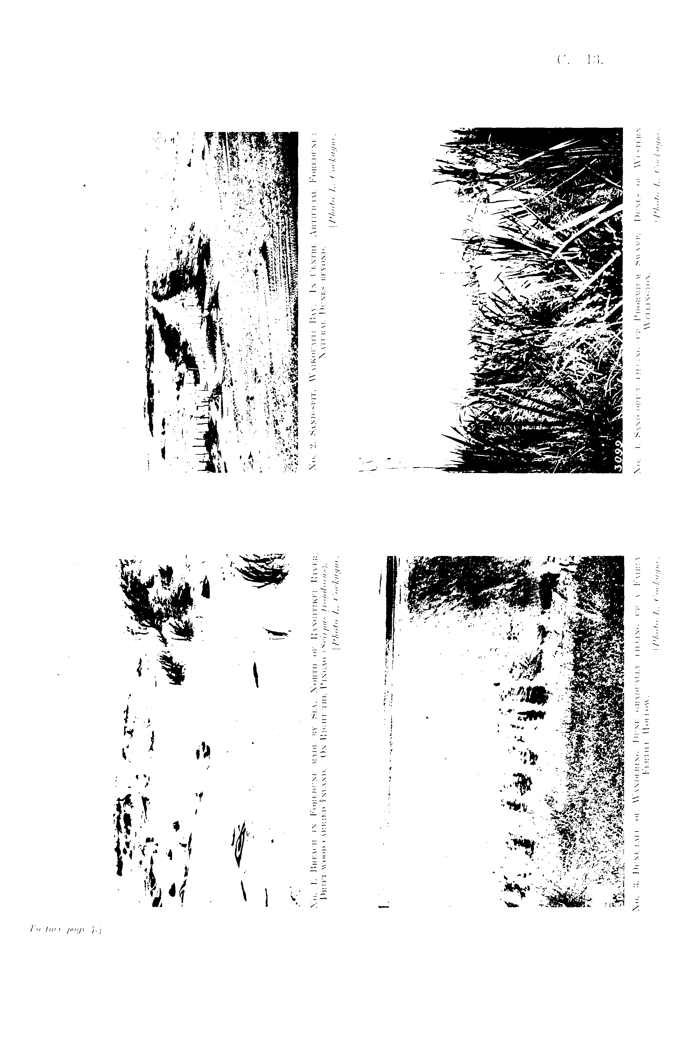 No. 1. Breach in Foredune made by Sea, North of Rangitikei River. Drift-wood carried Inland. On Right the Pingao (Scirpus frondosus).