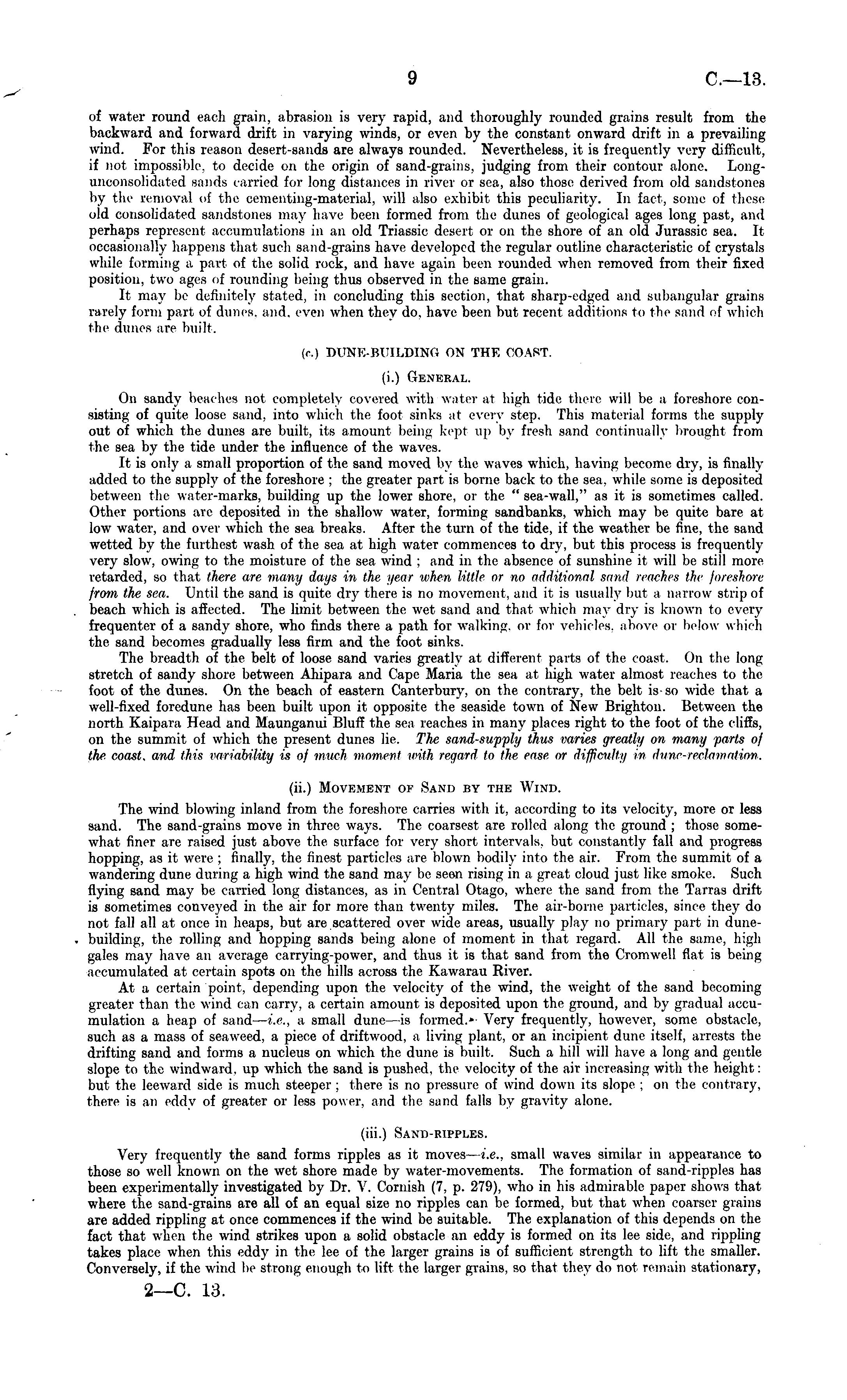 of wafer round each grain, abrasion is very rapid, and thoroughly rounded grains result from the backward and forward drift in varying winds, or even by the constant onward drift in a prevailing wind. For this reason desert-sands are always rounded. Nevertheless, it is frequently very difficult, if not impossible, to decide on the origin of sand-grains, judging from their contour alone. Longunconsolidated sands carried for long distances in river or sea, also those derived from old sandstones by the removal of the cementing-material, will also exhibit this peculiarity. In fact, some of these old consolidated sandstones may have been formed from the dunes of geological ages long past, and perhaps represent accumulations in an old Triassic desert or on the shore of an old Jurassic sea. It occasional!} happens that such sand-grains have developed the regular outline characteristic of crystals while forming a part of the solid rock, and have again been rounded when removed from their fixed position, two ages of rounding being thus observed in the same grain. It may be definitely stated, in concluding this section, that sharp-edged and subangular grains rarely form part of dunes, and. even when they do. have been but recent additions to the sand of which the dunes are built. (c.) DUNE-BUILDING ON THE COAST. (i.) General. On sandy beaches not completely covered with water at high tide there will be a foreshore consisting of quite loose sand, into which the foot sinks at every step. This material forms the supply out of which the dunes are built, its amount being kept up by fresh sand continually brought from the sea by the tide under the influence of the waves. ft is only a small proportion of the sand moved by the waves which, having become dry, is finally added to the supply of the foreshore ; the greater part is borne back to the sea. while some is deposited between the water-marks, building up the lower shore, or the "sea-wall," as it is sometimes called. Other portions are deposited in the shallow water, forming sandbanks, which may be quite bare at low water, and over which the sea breaks. After the turn of the tide, if the weather be line, the sand wetted by the furthest wash of the sea at high water commences to dry, but this process is frequently very slow, owing to the moisture of the sea wind : and in the absence of sunshine it will be still more retarded, so that there are many days in the year when little or no additional sand reaches the foreshore from the sea. Until the sand is quite dry there is no movement, and it is usually but a narrow strip of beach which is affected. The limit between the wet sand and that which may dry is known to every frequenter of a sandy shore, who finds there a path for walking, or for vehicles, above or below which the sand becomes gradually less firm and the foot sinks. The breadth of the belt of loose sand varies greatly at different parts of the coast. On the long stretch of sandy shore between Ahipara and Cape Maria the sea at high water almost reaches to the foot of the dunes. On the beach of eastern Canterbury, on the contrary, the belt is-so wide that a well-fixed foredune has been built upon it opposite the seaside town of New Brighton. Between the north Kaipara Head and Maunganui Bluff the sea reaches in many places right to the foot of the cliffs, on the summit of which the present dunes lie. The sand-supply thus varies greatly on many parts of the coast, and this variability is of much moment with regard to the ease or difficulty in dune-reclamation. (ii.) Movement of Sand by the Wind. The wind blowing inland from the foreshore carries with it, according to its velocity, more or less sand. The sand-grains move in three ways. The coarsest are rolled along the ground ; those somewhat finer are raised just above the surface for very short intervals, but constantly fall and progress hopping, as it were : finally, the finest particles are blown bodily into the air. From the summit of a wandering dune during a high wind the sand may be seen rising in a great cloud just like smoke. Such flying sand may be carried long distances, as in Central Otago, where the sand from the Tanas drift is sometimes conveyed in the air for more than twenty miles. The air-borne particles, since they do not fall all at once in heaps, but are scattered over wide areas, usually play no primary part in dunebuilding, the rolling and hopping sands being alone of moment in that regard. All the same, high gales may have an average carrying-power, and thus it is that sand from the Cromwell fiat is being accumulated at certain spots on the hills across the Kawarau River. At a certain point, depending upon the velocity of the wind, the weight of the sand becoming greater than the wind can carry, a certain amount is deposited upon the ground, and by gradual accumulation a heap of sand — i.e., a small dune —is formed.' Very frequently, however, some obstacle, such as a mass of seaweed, a piece of driftwood, a living plant, or an incipient dune itself, arrests the drifting sand and forms a nucleus on which the dune is built. Such a hill will have a long and gentle slope to the windward, up which the sand is pushed, the velocity of the air increasing with the height: but the leeward side is much steeper ; there is no pressure of wind down its slope ; on the contrary. there is an eddy of greater or less power, and the sand falls by gravity alone. (iii.) Sand-ripples. Very frequently the sand forms ripples as it moves — i.e., small waves similar in appearance to those so well known on the wet shore made by water-movements. The formation of sand-ripples has been experimentally investigated by Dr. V. Cornish (7, p. 279), who in his admirable paper shows that where the sand-grains are all of an equal size no ripples can be formed, but that when coarser grains are added rippling at once commences if the wind be suitable. The explanation of this depends on the fact that when the w