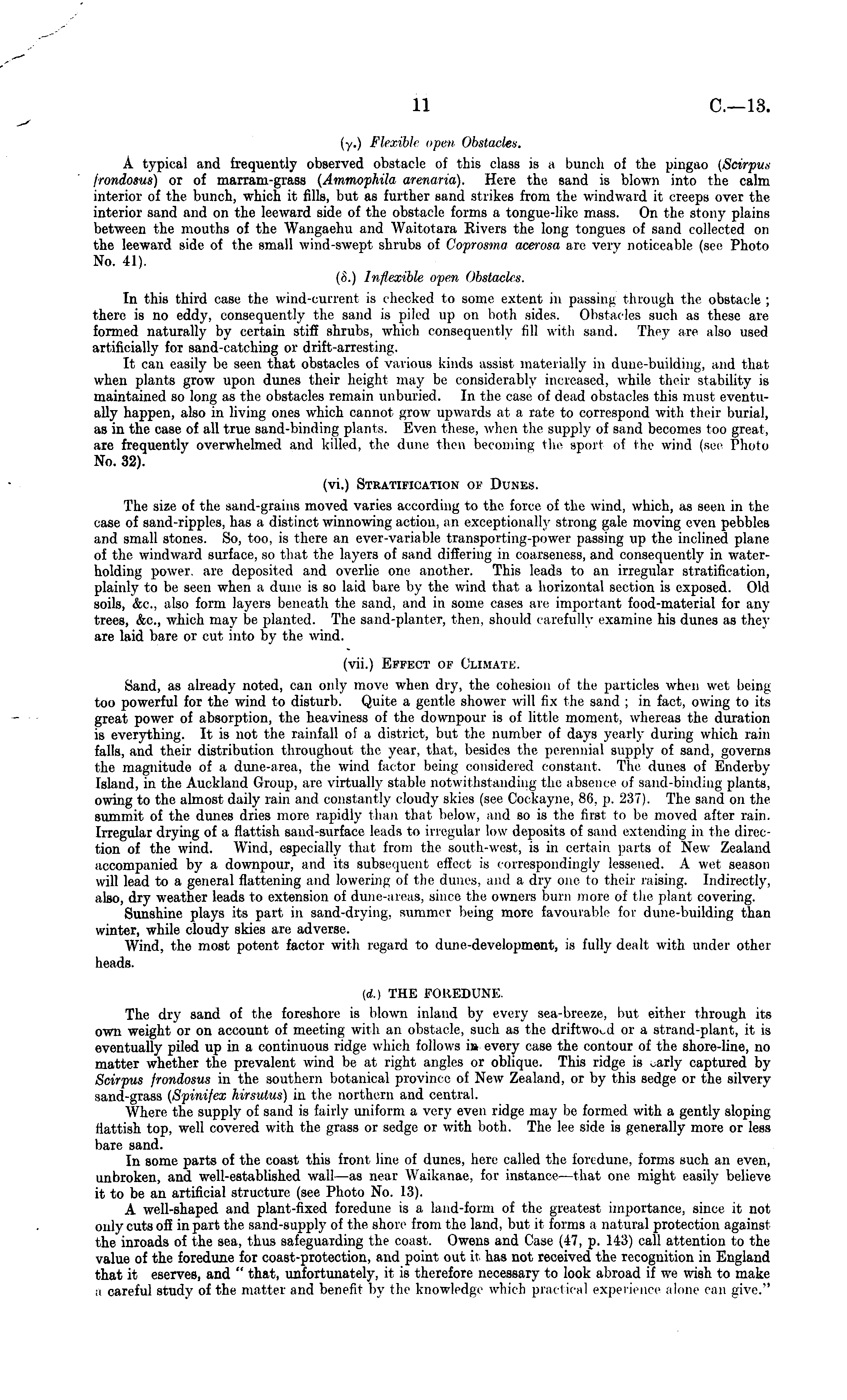 (y.) Flexible open Obstacles. A typical and frequently observed obstacle of this class is a bunch of the pingao (Scirpus frondosus) or of marram-grass (Ammophila arenaria). Here the sand is blown into the calm interior of the bunch, which it fills, but as further sand strikes from the windward it creeps over the interior sand and on the leeward side of the obstacle forms a tongue-like mass. On the stony plains between the mouths of the Wangaehu and Waitotara Rivers the long tongues of sand collected on the leeward side of the small wind-swept shrubs of Coprosma acerosa are very noticeable (see Photo No. 41). (!).) Inflexible open Obstacles. In this third case the wind-current is checked to some extent in passing through the obstacle ; there is no eddy, consequently the sand is piled it]) on both sides. Obstacles such as these are formed naturally by certain stiff shrubs, which consequently fill with sand. They are also used artificially for sand-catching or drift-arresting. It can easily be seen that obstacles of various kinds assist materially in dune-building, and that when plants grow upon dunes their height may be considerably increased, while their stability is maintained so long as the obstacles remain unburied. In the case of dead obstacles this must eventually happen, also in living ones which cannot grow upwards at a rate to correspond with their burial, as in the case of all true sand-binding plants. Even these, when the supply of sand becomes too great, are frequently overwhelmed and killed, the dune then becoming the sport of the wind (see Photo No. 32). (vi.) Stratification of Dunes. The size of the sand-grains moved varies according to the force of the wind, which, as seen in the case of sand-ripples, has a distinct winnowing action, an exceptionally strong gale moving even pebbles and small stones. So, too, is there an ever-variable transporting-power passing up the inclined plane of the windward surface, so that the layers of sand differing in coarseness, and consequently in waterholding power, are deposited and overlie one another. This leads to an irregular stratification, plainly to be seen when a dune is so laid bare by the wind that a horizontal section is exposed. Old soils, &c, also form layers beneath the sand, and in some cases are important food-material for any trees, &c, which may be planted. The sand-planter, then, should carefully examine his dunes as they are laid bare or cut into by the wind. (vii.) Effect of Climate. Sand, as already noted, can only move when dry, the cohesion id' the particles when wet being too powerful for the wind to disturb. Quite a gentle shower will fix the sand ;in fact, owing to its great power of absorption, the heaviness of the downpour is of little moment, whereas the duration is everything. It is not the rainfall of a district, but the number of days yearly during which rain falls, and their distribution throughout the year. that, besides the perennial supply of sand, governs the magnitude of a dune-area, the wind factor being considered constant. The dunes of Enderby Island, in the Auckland Group, are virtually stable notwithstanding the absence of sand-binding plants, owing to the almost daily rain and constantly cloudy skies (see Cockayne. 80. p. 237). The sand on the summit of the dunes dries more rapidly than that below, and so is the first to be moved after rain. Irregular drying of a flatfish saiid-surface leads to irregular low deposits of sand extending in the direction of the wind. Wind, especially that from the south-west, is in certain parts of New Zealand accompanied by a downpour, and its subsequent effect is correspondingly lessened. A wet season will lead to a general flattening and lowering of the dunes, and a dry one to their raising. Indirectly, also, dry weather leads to extension of dune-areas, since the owners burn more of the plant covering. Sunshine plays its part in sand-drying, summer being more favourable for dune-building than winter, while cloudy skies are adverse. Wind, the most potent factor with regard to dune-development, is fully dealt with under other heads. (d.) THE EOREDUNIv The dry sand of the foreshore is blown inland by every sea-breeze, but either through its own weight or on account of meeting with an obstacle, such as the driftwood or a strand-plant, it is eventually piled up in a continuous ridge which follows ia every case the contour of the shore-line, no matter whether the prevalent wind be at right angles or oblique. This ridge is captured by Scirpus frondosus in the southern botanical province of New Zealand, or by this sedge or the silvery sand-grass (Spinifex hirsutus) in the northern and central. Where the supply of sand is fairly uniform a very even ridge may be formed with a gently sloping tiattish top, well covered with the grass or sedge or with both. The lee side is generally more or less bare sand. In some parts of the coast this front line of dunes, here called the foredune, forms such an even, unbroken, and well-established wall —as near Waikanae, for instance—that one might easily believe it to be an artificial structure (see Photo No. 13). A well-shaped and plant-fixed foredune is a land-form of the greatest importance, since it not only cuts off in part the sand-supply of the shore from the land, but it forms a natural protection against the inroads of the sea, thus safeguarding the coast. Owens and Case (47, p. 143) call attention to the value of the foredune for coast-protection, and point out it has not received the recognition in England that it eserves, and " that, unfortunately, it is therefore necessary to look abroad if we wish to make a careful study of the matter and benefit by the knowledge which practical experience alone can give."