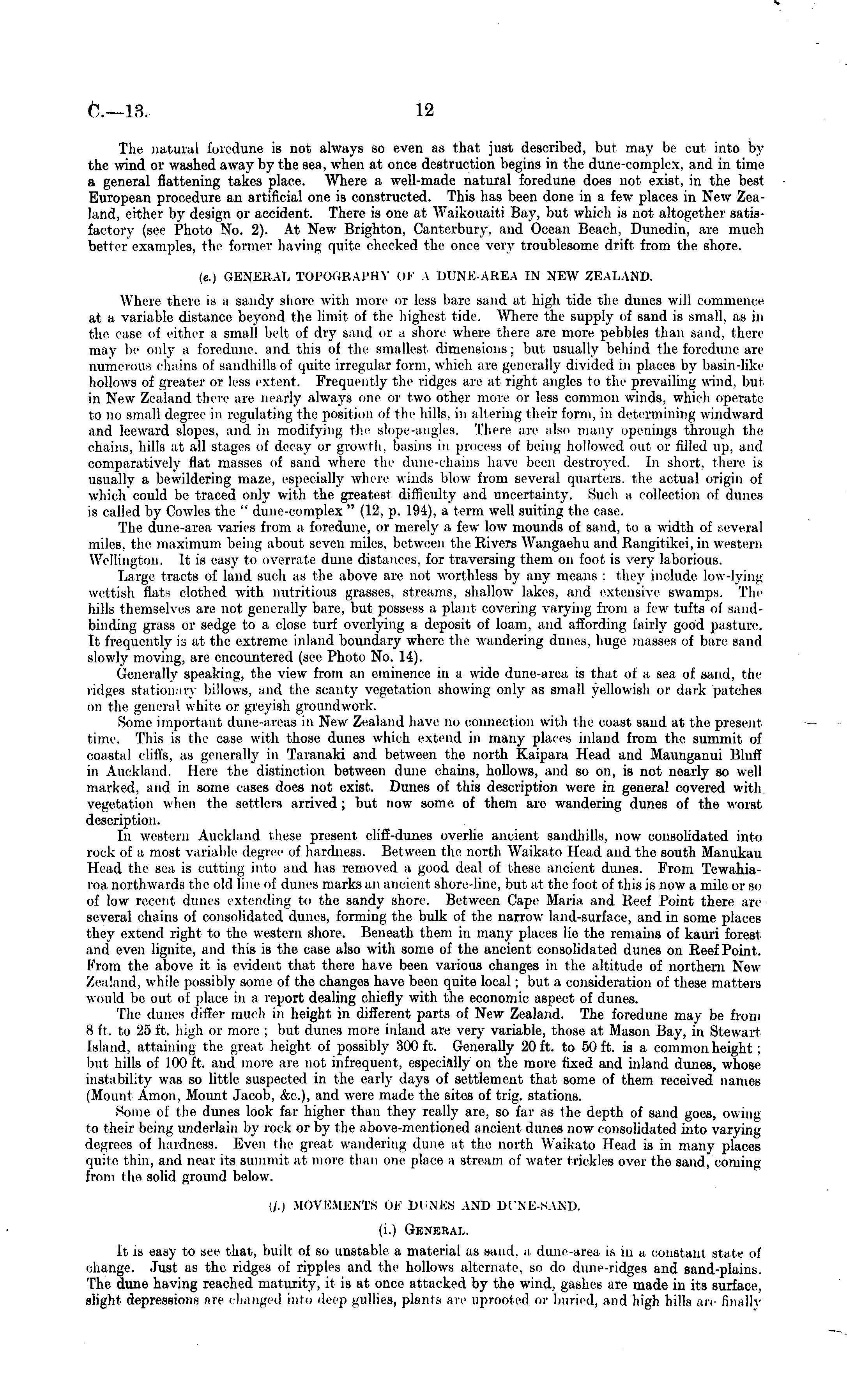 The natural foredune is not always so even as that just described, but may be cut into by the wind or washed away by the sea, when at once destruction begins in the dune-complex, and in time a general flattening takes place. Where a well-made natural foredune does not exist, in the best European procedure an artificial one is constructed. This has been done in a few places in New Zealand, either by design or accident. There is one at Waikouaiti Bay, but which is not altogether satisfactory (see Photo No. 2). At New Brighton, Canterbury, and Ocean Beach. Dunedin, are much better examples, the former having quite checked the once very troublesome drift from the shore. (c.) GENERAL TOPOGRAPHY OF A DUNE-AREA IN NEW ZEALAND. Where there is a sandy shore with more or less bare sand at high tide the dunes will commence at a variable distance beyond the limit of the highest tide. "Where the supply of sand is .small, as in the case of either a small belt of dry sand or a shore where there are more pebbles than sand, there may be only a foredune. and this of the smallest dimensions; but usually behind the foredune are numerous chains of sandhills of quite irregular form, which are generally divided in places by basin-like hollows of greater or less extent. Frequently the ridges are at right angles to the prevailing wind, but in New Zealand there are nearly always one or two other more or less common winds, which operate to no small degree in regulating the position of the hills, in altering their form, in determining windward and leeward slopes, and in modifying the slope-angles. There are also many openings through the chains, hills at all stages of decay or growth. basins in process of being hollowed out or filled up, and comparatively Hat masses of sand where the dune-chains have been destroyed. In short, there is usually a bewildering maze, especially where winds blow from several quarters, the actual origin of which could be traced only with the greatest difficulty and uncertainty. Such a collection of dunes is called by Cowles the " dune-complex " (12. p. 194), a term well suiting the case. The dune-area varies from a foredune, or merely a few low mounds of sand, to a width of several miles, the maximum being about seven miles, between the Rivers Wangaehu and Raugitikei. in western Wellington. It is easy to overrate dune distances, for traversing them on foot is very laborious. Large tracts of land such as the above are not worthless by any means : they include low-lying Ii flats clothed with nutritious grasses, streams, shallow lakes, and extensive swamps. The hills themselves are not generally bare, but possess a plant covering varying from a few tufts of sandbinding grass or sedge to a close turf overlying a deposit of loam, and affording fairly good pasture. It frequently is at the extreme inland boundary where the wandering dunes, huge masses of bare sand slowly moving, are encountered (see Photo No. 14). Generally speaking, the view from an eminence in a wide dune-area is that of a sea of sand, the ridges stationary billows, and the scanty vegetation showing only as small yellowish or dark patches on the general white or greyish groundwork. Some important dune-areas in New Zealand have no connection with I he coast sand at the present time. This is the case with those dunes which extend in many places inland from the summit of coastal cliffs, as generally in Taranaki and between the north Kaipara Head and Maunganui Bluff in Auckland. Here the distinction between dune chains, hollows, and so on, is not nearly so well marked, and in some cases does not exist. Dunes of this description were in general covered with vegetation when the settlers arrived; but now some of them are wandering dunes of the worst description. In western Auckland these present cliff-dunes overlie ancient sandhills, now consolidated into rock of a most variable degree of hardness. Between the north Waikato Head and the south Manukau Head the sea is cutting into and has removed a good deal of these ancient dunes. From Tewahiaroa northwards tin' old line of dunes marks an ancient shore-line, but at the foot of this is now a mile or so of low recent dunes extending to the sandy shore. Between Cape Maria and Reef Point there are several chains of consolidated dunes, forming the bulk of the narrow land-surface, and in some places they extend right to the western shore. Beneath them in many places lie the remains of kauri forest and even lignite, and this is the. case also with some of the ancient consolidated dunes on Reef Point. From the above it is evident that there, have been various changes in the altitude of northern New Zealand, while possibly some of the changes have been quite local : but a consideration of these matters would be out of place in a report dealing chiefly with the economic aspect of dunes. The dunes differ much in height in different parts of New Zealand. The foredune may be from 8 ft. to 25 ft. high or more ; but dunes more inland are very variable, those at .Mason Bay, in Stewart Island, attaining the great height of possibly 300 ft. Generally 20 ft. to 50 ft. is a common height ; but hills of 100 ft. and more are not infrequent, especially on the more fixed and inland dunes, whose instability was so little suspected in the early days of settlement that some of them received names (.Mount Anion, Mount Jacob, &c), and were made the sites of trig, stations. Some of the dunes look far higher than they really are, so far as the depth of sand goes, owing to their being underlain by rock or by the above-mentioned ancient dunes now consolidated into varying is of hardness. Even the great wandering dune at the north Waikato Head is in many places quite thin, and near its summit at more than one place a stream of water trickles over the sand, coming from the solid ground below. (/.) MOVEMENTS OP DUNES \NJ> DUNE-SAND. (i.) GrENEHAi.. It is easy to see that, built of so unstable a material as sand, a dune 