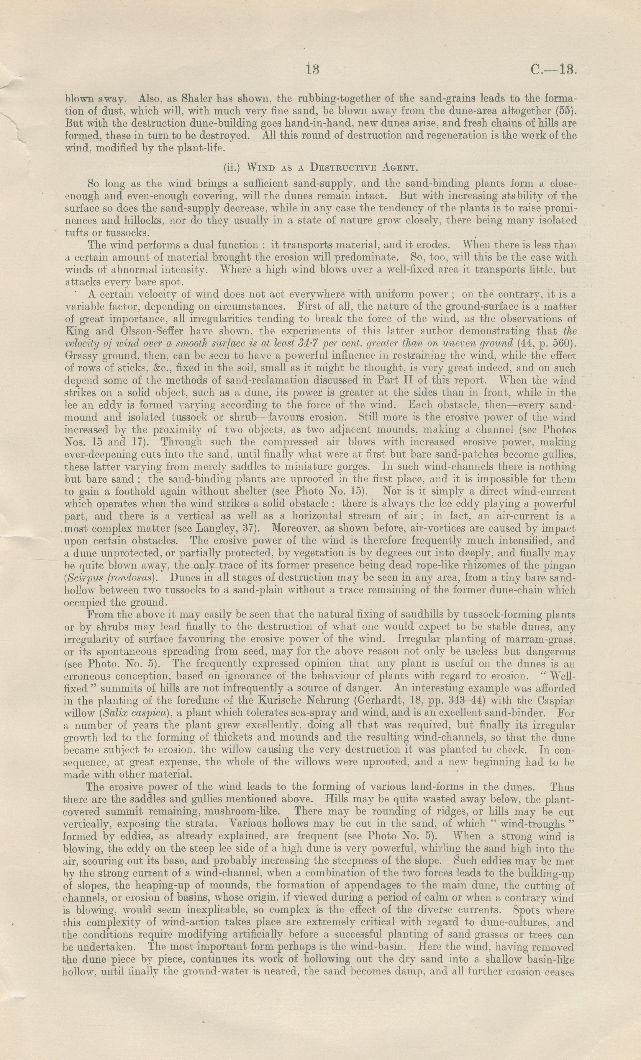 blown away. Also, as Shaler has shown, the rubbing-together of the sand-grains leads to the formation of dust, which will, with much very fine sand, be blown away from the dune-area altogether (55). But with the destruction dune-building goes hand-in-hand, new dunes arise, and fresh chains of hills are formed, these in turn to be destroyed. All this round of destruction and regeneration is the work of the wind, modified by the plant-life. (ii.) Wind as a Destructive Agent. So long as the wind' brings a sufficient sand-supply, and the sand-binding plants form a closeenough and even-enough covering, will the dunes remain intact. But with increasing stability of the surface so does the sand-supply decrease, while in any case the tendency of the plants is to raise prominences and hillocks, nor do they usually in a state of nature grow closely, there being many isolated tufts or tussocks. The wind performs a dual function : it transports material, and it erodes. When there is less than a certain amount of material brought the erosion will predominate. So, too, will this be the case with winds of abnormal intensity. Whore a high wind blows over a well-fixed area it transports little, but attacks every bare spot. A certain velocity of wind does not act everywhere with uniform power ; on the contrary, it is a variable factor, depending on circumstances. First of all, the nature of the ground-surface is a matter of great importance, all irregularities tending to break the force of the wind, as the observations of King and Olsson-Seffer have shown, the experiments of this latter author demonstrating that the velocity of wind over a smooth surface is at least 34-7 per cent, greater than on uneven ground (44, p. 560). Grassy ground, then, can be seen to have a powerful influence iii restraining the wind, while the effect of rows of sticks, &c, fixed in the soil, small as it might be thought, is very great indeed, and on. such depend some of the methods of sand-reclamation discussed in Part II of this report. When the wind strikes on a solid object, such as a dune, its power is greater at the sides than in front, while in the lee an eddy is formed varying according to the force of the wind. Each obstacle, then —every sandmound and isolated tussock or shrub—favours erosion. Still more is the erosive power of the wind increased by the proximity of two objects, as two adjacent mounds, making a channel (see Photos Nos. 15 and 17). Through such the compressed air blows with increased erosive power, making ever-deepening cuts into the sand, until finally what were at first but bare sand-patches become gullies, these latter varying from merely saddles to miniature gorges. In such wind-channels there is nothing but bare sand ; the sand-binding plants are uprooted in the first place, and it is impossible for them to gain a foothold again without shelter (see Photo No. 15). Nor is it simply a direct wind-current which operates when the wind strikes a solid obstacle : there is always the lee eddy playing a powerful part, and there is a vertical as well as a horizontal stream of air ; in fact, an air-current is a most complex matter (see Langley, 37). Moreover, as shown before, air-vortices are caused by impact upon certain obstacles. The erosive power of the wind is therefore frequently much intensified, and a dune unprotected, or partially protected, by vegetation is by degrees cut into deeply, and finally may be quite blown away, the only trace of its former presence being dead rope-like rhizomes of the pingao (Scirpus frondosus). Dunes in all stages of destruction may be seen in any area, from a tiny bare sandhollow between two tussocks to a sand-plain without a trace remaining of the former dune-chain which occupied the ground. From the above it may easily be seen that the natural fixing of sandhills by tussock-forming plants or by shrubs may lead finally to the destruction of what one would expect to be stable dunes, any irregularity of surface favouring the erosive power of the wind. Irregular planting of marram-grass, or its spontaneous spreading from seed, may for the above reason not only be useless but dangerous (see Photo. No. 5). The frequently expressed opinion that any plant is useful on the dunes is an erroneous conception, based on ignorance of the behaviour of plants with regard to erosion. " Wellfixed " summits of hills are not infrequently -a source of danger. An interesting example was afforded in the planting of the foredune of the Kurische Nehrung (Gerhardt, 18, pp. 343-44) with the Caspian willow (Salix caspica), a plant which tolerates sea-spray and wind, and is an excellent sand-binder. For a number of years the plant grew excellently, doing all that was required, but finally its irregular growth led to the forming of thickets and mounds and the resulting wind-channels, so that the dune became subject to erosion, the willow causing the very destruction it was planted to check. In consequence, at great expense, the whole of the willows were uprooted, and a new beginning had to be made with other material. The erosive power of the wind leads to the forming of various land-forms in the dunes. Thus there are the saddles and gullies mentioned above. Hills may be quite wasted away below, the plantcovered summit remaining, mushroom-like. _ There may be rounding of ridges, or hills may be cut vertically, exposing the strata. Various hollows may be cut in the sand, of which " wind-troughs " formed by eddies, as already explained, are frequent (see Photo No. 5). When a strong wind is blowing, the eddy on the steep lee side of a high dune is very powerful, whirling the sand high into the air, scouring out its base, and probably increasing the steepness of the slope. Such eddies may be met by the strong current of a wind-channel, when a combination of the two forces leads to the building-up of slopes, the heaping-up of mounds, the formation of appendages to the main dune, the cutting of channel