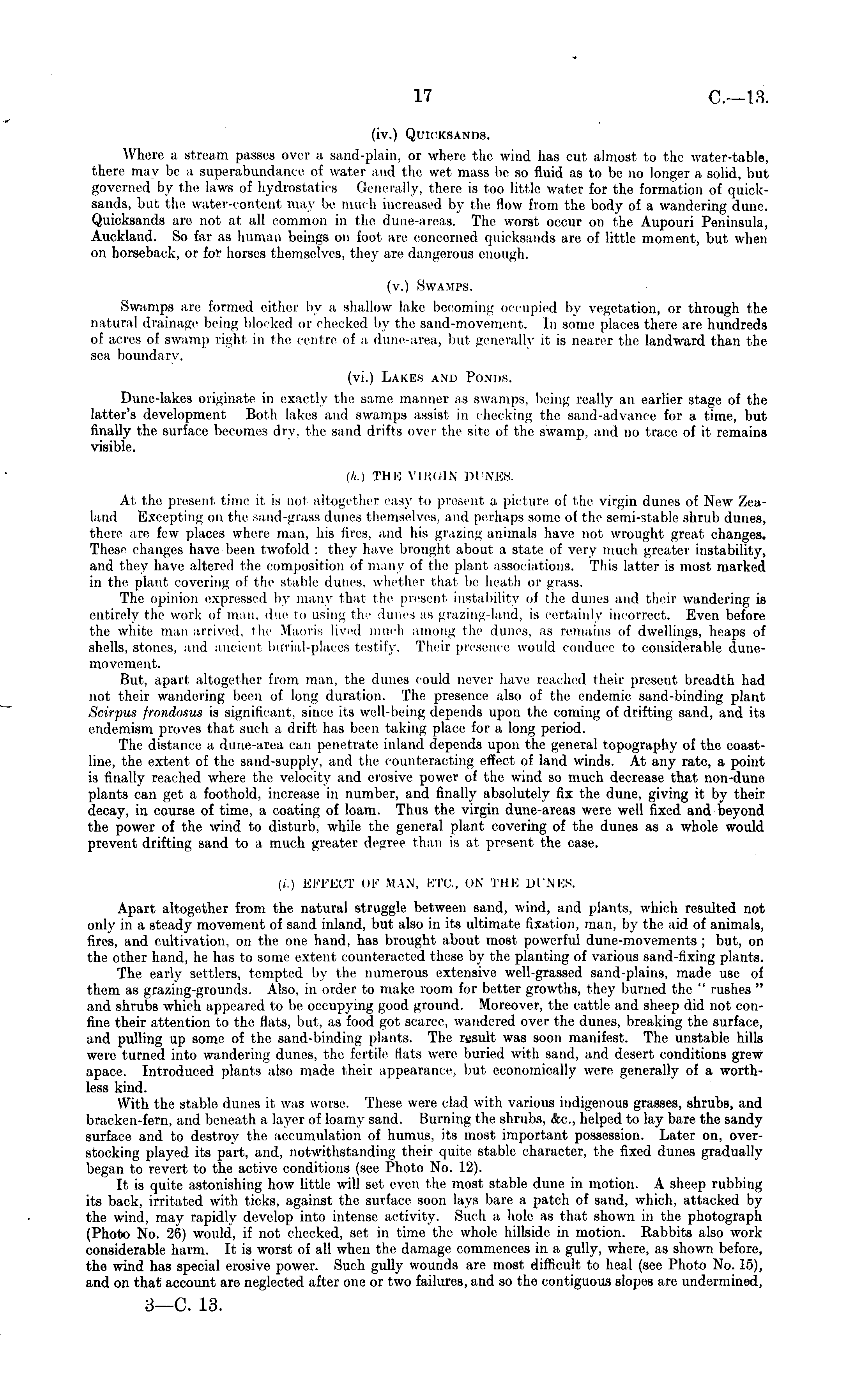 (iv.) Quicksands. Where a stream passes over a sand-plain, or where the wind has cut almost to the water-table, there may be a superabundance of water and the wet mass be so fluid as to be no longer a solid, but governed be ihe laws of hydrostatics Generally, there is too Little water for the formation of quicksands, but the water-content may be much increased by the How from the body of a wandering dune. Quicksands are not at all common in the dime-areas. The worst occur on the Aupouri Peninsula, Auckland. So far as human beings on foot are concerned quicksands are. of little moment, but when on horseback, or for horses themselves, they are dangerous enough. (v.) Swamps. Swamps are formed either by a shallow lake becoming occupied by vegetation, or through the natural drainage being blocked or checked by the sand-movement. In some places there are hundreds of acres of swamp right in the centre of a dune-area, but generally it is nearer the landward than the sea boundary. (vi.) Lakes and Ponds. Dune-lakes originate in exactly the same manner as swamps, being really an earlier stage of the hitter's development Both lakes and swamps assist in checking the sand-advance for a time, but finally the surface becomes dry, the sand drifts over the site of the swamp, and no trace of it remains visible. (//.) THE VIRGIN DUNES. Ai the present time it is not altogether easy to present a. piclirre of the virgin dunes of New Zealand Excepting on the and grass dunes t homsolves. and perhaps some of the .-'.emi--table shrub dunes, there are few places where man, his fires, and his grazing animals have not wrought great changes. These changes have been twofold : they have brought about a state of very much greater instability, and they have altered the composition of many of the plant associations. This latter is most marked in tic plant coverine of the stable dunes, whether that be heath or grass. The opinion expressed by many that the present instability of the dunes and their wandering is entirely the work of man. due to using tic dunes as grazing-land, is certainly incorrect. Even before the white man arrived, the Maoris lived much among the dunes, as remains of dwellings, heaps of shells, stones, and ancient burial-places testify. Their presence would conduce to considerable dunemovement. But, apart altogether from man. the dunes could never have reached their present breadth had not their wandering been of long duration. The presence also of the endemic sand-binding plant Scirpus frondosus is significant, since its well-being depends upon the coming of drifting sand, and its endemism proves that such a drift has been taking place for a long period. The distance a dune-area can penetrate inland depends upon the general topography of the coastline, the extent of the sand-supply, and the counteracting effect of land winds. At any rate, a point is finally reached where the velocity and erosive power of the wind so much decrease that non-dune plants can get a foothold, increase in number, and finally absolutely fix the dune, giving it by their decay, in course of time, a coating of loam. Thus the virgin dune-areas were well fixed and beyond the power of the wind to disturb, while the general plant covering of the dunes as a whole would prevent drifting sand to a much greater degree than is at present the case. (».) EFFECT OF MAN, ETC., ON THE DUNES. Apart altogether from the natural struggle between sand, wind, and plants, which resulted not only in a steady movement of sand inland, but also in its ultimate fixation, man, by the aid of animals, fires, and cultivation, on the one hand, has brought about most powerful dune-movements; but, on the other hand, he has to some extent counteracted these by the planting of various sand-fixing plants. The early settlers, tempted by the numerous extensive well-grassed sand-plains, made use of them as grazing-grounds. Also, in order to make room lor better growths, they burned the " rushes " and shrubs which appeared to be occupying good ground. Moreover, the cattle and sheep did not confine their attention to the flats, 'nil. as food got scarce, wandered over t he dunes, breaking the surface, and pulling up some of the sand-binding plants. The result was soon manifest. The unstable hills were turned into wandering dunes, the fertile Hats were buried with sand, and desert conditions grew apace. Introduced plants also made their appearance, but economically were generally of a worthless kind. With the stable dunes ii was worse. These were clad with various indigenous grasses, shrubs, and bracken-fern, and beneath a layer of loamy sand. Burning Ihe shrubs. &c, helped to lay bare the sandy surface and to destroy the accumulation of humus, its most important possession. Later on, overstocking played its part, and. notwithstanding their quite stable character, the fixed dunes gradually began to revert to the active conditions (see Photo No. 12). It is quite astonishing how little will set even the most stable dune in motion. A sheep rubbing its back, irritated with ticks, against the surface soon lavs bare a patch of sand, which, attacked by the wind, may rapidly develop into intense activity. Such a hole as that shown in the photograph (Photo No. 26) would, if not checked, set in time the whole hillside in motion. Rabbits also work considerable harm. It is worst of all when the damage commences in a gully, where, as shown before, the wind has special erosive power. Such gully wounds are most difficult to heal (see Photo No. 15), and on that account are neglected after one or two failures, and so the contiguous slopes are undermined,