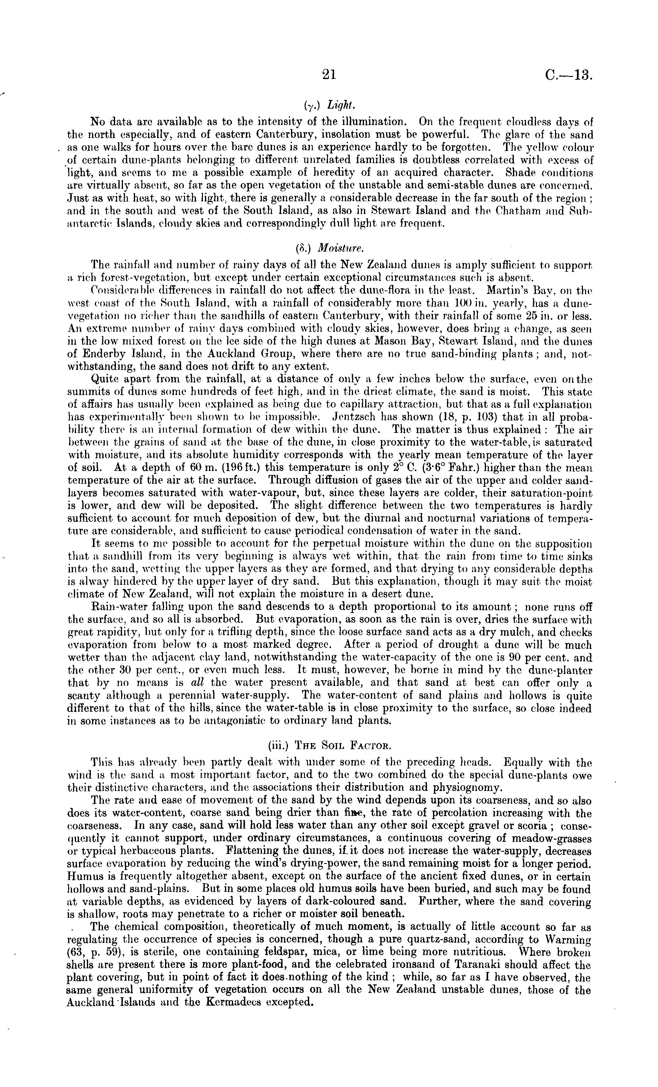 (y.) Ught. No data are available as to the intensity of the illumination. On the frequent cloudless days of the north especially, and of eastern Canterbury, insolation must be powerful. The glare of the sand as one walks lor hours over the bare dunes is an experience hardly to be forgotten. The yellow colour of certain dune-plants belonging to different unrelated families is doubtless correlated with excess of light, and seems to me a possible example of heredity of an acquired character. Shade conditions are virtually absent, so far as the open vegetation of the unstable and semi-stable dunes are concerned. Just as with heat, so with light, there is generally a considerable decrease m the far south of the region : and in the south ami west of the South Island, as also ill Stewart Island and the Chatham and Subantarctic Islands, cloudy skies and correspondingly dull light are frequent. (S.) Moisture. The rainfall and number of rainy days of all the New Zealand dunes is amply sufficient in support a rich forest -vegetation, but except under certain exceptional circumstances such is absent. Considerable differences in rainfall do not affect the dune-flora in the least. .Martin's Bay, on the west coast of the South Island, with a rainfall of considerably more than bin in. yearly, has a dunevegetation no richer than the sandhills of eastern Canterbury, with their rainfall of some 25 in. or less. An extreme number of rainy days combined with cloudy skies, however, does bring a change, as seen in the low mixed forest mi the Ice side of the high dunes at Mason Bay, Stewart Island, and the dunes of Enderby Island, in the Auckland Croup, where there are no true sand-binding plants; and, notwithstanding, the sand does not drift to any extent. Quite apart from the rainfall, at a distance of only a few inches below the surface, even on the summits of dunes some hundreds of feet high, and in the driest climate, the sand is moist. This state of affairs has usually been explained as being due to capillary attract ion. but that as a full ox plana! ion has experimentally ben shown to be impossible. Jentzsch has shown (18. ]>. 103) that in all probability there is an internal formalii I dew within the dune. The matter is thus explained : The air between llie grains of sand at the base of the dune, in close proximity to the water-table, is saturated with moisture, and its absolute humidity corresponds with the yearly mean temperature of the layer of soil. At a depth of 60 m. (196 ft.) this temperature is only 2 C. (3-6° Fahr.) higher than the mean temperature of the air at the surface. Through diffusion of gases the air of the upper and colder sandlayers becomes saturated with water-vapour, but. since these layers are colder, their saturation-point is lower, and dew will be deposited. The slight difference between the two temperatures is hardly sufficient to account for much deposition of dew, but the diurnal and nocturnal variations of temperature are considerable, and sufficient to cause periodical condensation of water in the sand. It seems to me possible to account for the perpetual moisture within the dune on the supposition that a sandhill from its very beginning is always wet within, that the rain from time to time sinks into the sand, wetting the upper layers as they are formed, and that drying to any considerable depths is alway hindered by the upper layer of dry sand. But this explanation, though it may suit the moist climate of New Zealand, will not explain the moisture in a desert dune. Rain-water falling upon the sand descends to a depth proportional to its amount ; none runs off the surface, anil so all is absorbed. But evaporation, as soon as the rain is over, dries the surface with great rapidity, but only lor a trilling depth, since the loose surface sand acts as a dry mulch, and checks evaporation from below to a most marked degree. After a period of drought a dune will be much wetter than the adjacent clay land, notwithstanding the water-capacity of the one is 90 per cent, and the other 30 per cent., or even much less. It must, however, be borne in mind by the dune-planter that by no means is all the water present available, and that sand at best can offer only a scanty although a perennial water-supply. The water-content of sand plains and hollows is quite different to that id the hills, since the water-table is in close proximity to the surface, so close indeed in some instances as to be antagonistic to ordinary land plants. (iii.) The Soil Factor. This has already been partly dealt with under some of the preceding heads. Equally with the wind is the sand a most important factor, and to the two combined do the special dune-plants owe then- distinctive characters, and the associations their distribution and physiognomy. The rate and ease of movement of the sand by the wind depends upon its coarseness, and so also does its water-content, coarse sand being drier than fhw, the rate of percolation increasing with the coarseness. In any case, sand will hold less water than any other soil except gravel or scoria ; consequently it cannot support, under ordinary circumstances, a continuous covering of meadow-grasses or typical herbaceous plants. Flattening the dimes, if.it does not increase the water-supply, decreases surface evaporation by reducing the wind's drying-power, the sand remaining moist for a longer period. Humus is frequently altogether absent, except on the surface of the ancient fixed dunes, or in certain hollows and sand-plains. But in some places old humus soils have been buried, and such may be found at variable depths, as evidenced by layers of dark-coloured sand. Further, where the sand covering is shallow, roots may penetrate to a richer or moister soil beneath. The chemical composition, theoretically of much moment, is actually of little account so far as regulating the occurrence of species is concerned, though a pure quartz-sand, according to Warming (63, p. 59), is ste