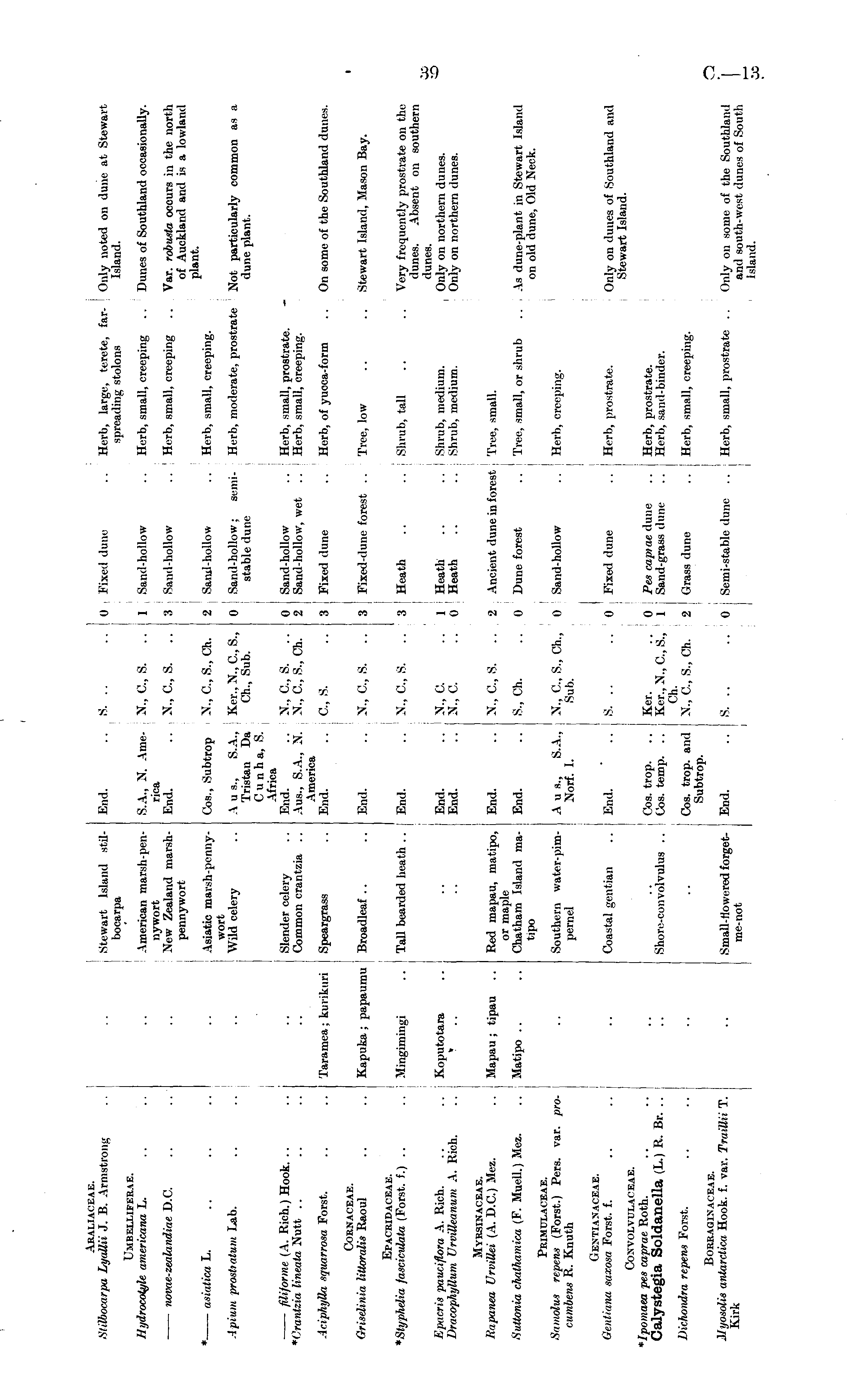 Akaliaceae. StiUbocarpa LyaUii 3. B. Armstrong Umbel_.ifi.rae. 1 1 ydrocot yle americana L. novae-zealandiae D.C. Stewart Island stilbocarpa American marsh-pen-nywort New Zealand marshpennywort End. .. S. .. .. 0 Fixed dune .. Herb, large, terete, far- Only noted on dune at Stewart spreading stolons Island. S.A., N. Ame- N., C, S. .. 1 Sand-hollow .. Herb, small, creeping .. Dunes of Southland occasionally, rica End. .. X., ('., S. .. 3 Sand-hollow . . Herb, small, creeping .. Var. robusta occurs in the north of Auckland and is a lowland plant. Cos., Subtrop X., C, S., Ch. 2 Sand-hollow .. Herb, small, creeping. * asiatica L. Allium prosttatum Lab. Asiatic marsh-penny-wort Wild celery Aus., S.A., Ker., X., C, S., 0 Sand-hollow; semi- Herb, moderate, prostrate Not particularly common as a Tristan Da Ch., Sub. stable dune dune plant. C u n h a, S. Africa End .. X., G, S. .. 0 Sand-hollow Herb, small, prostrate. Aus., S.A., X. X., C, S., Ch. 2 Sand-hollow, wet .. Herb, small, creeping. America End. .. ('., S. .. 3 Fixed dune .. Herb, of yucca-form .. On some of the Southland dunes. 2 0 filiforme (A. Rich.) Hook. .. "I'nnitzin linentn Nutt .. Slender celery Common crantzia .. 0 2 Aciphylla squamosa Forst. .. .. Taramea; kurikuri Speargrass 3 Cornaceae. Griselinia littoralit Raoul .. .. Kapuka ; papaumu Broadleaf .. End. .. X., C, S. .. 3 Fixed-dune forest .. Tree, low .. .. Stewart Island, Mason Bay. EPACRIDAl EAE. *Styphelia fasciculatn (Forst. f.) .. .. Minginiingi Tall bearded heath .. I End. .. X., C, S. .. 3 Heath .. .. Shrub, tall .. .. Very frequently prostrate on th. dunes. Absent on southern dunes. End. .. X., ('. .. 1 Heath .. .. Shrub, medium. ( Only on northern dunes. End. .. N., C. .. 0 Heath .. Shrub, medium. Only on northern dunes. Epacris puueiflora A. Rich. .. .. Koputotara Vracophyllum Urvilleanuni A. Rich. Myksinaceae. Rapanea Urvillei (A. D.C.) Me/.. .. Mapau ; tipau Siiltonia chalhnmica (F. Muell.) Mez. .. Matipo .. Primulaceae. Sumolus repent (Forst.) Pers. var. procumbens R. Knuth Red mapau, matipo, or maple Chatham Island matipo Southern water-pim-pernel End. .. N., G, S. .. 2 Ancient dune in forest Tree, small. End. .. S., Ch. .. 0 Dune forest .. Tree, small, or shrub .. As dune-plant in Stewart Island on old dune, Old Neck. „ Gextiaxaceae. Genitalia saxosa Forst. f. Co-JVOLVULACEAE. *Ipomaea pes caprae Roth. Calystegia Soldanella (L.) R. Br. .. Vichondra repens Forst. Borragixacea e. Mgotolit antarctica Hook. f. var. Traillii T. Kirk Coastal gentian Shore-convolvulus .. Small-flowered forget-me-not A u s., S.A., N., C, S., Ch., 0 Sand-hollow .. Herb, creeping. Xorf. I. Sub. lend. .. S. .. .. 0 Fixed dune .. Herb, prostrate. Only on dunes of Southland and Stewart Island. Cos. troi_ .. Ker. .. 0 Pew captae dune .. Herb, prostrate. Cos. temp. .. Ker., X., C, S., 1 Sand-grass dune .. Herb, sand-binder. Ch. Cos. trop. and N., C, S., Ch. j 2 Grass dune .. Herb, small, creeping. Subtrop. End. .. S. .. .. 0 Semi-stable dune .. Herb, small, prostrate .. Only on some of the Southland and south-west dunes of South Island.