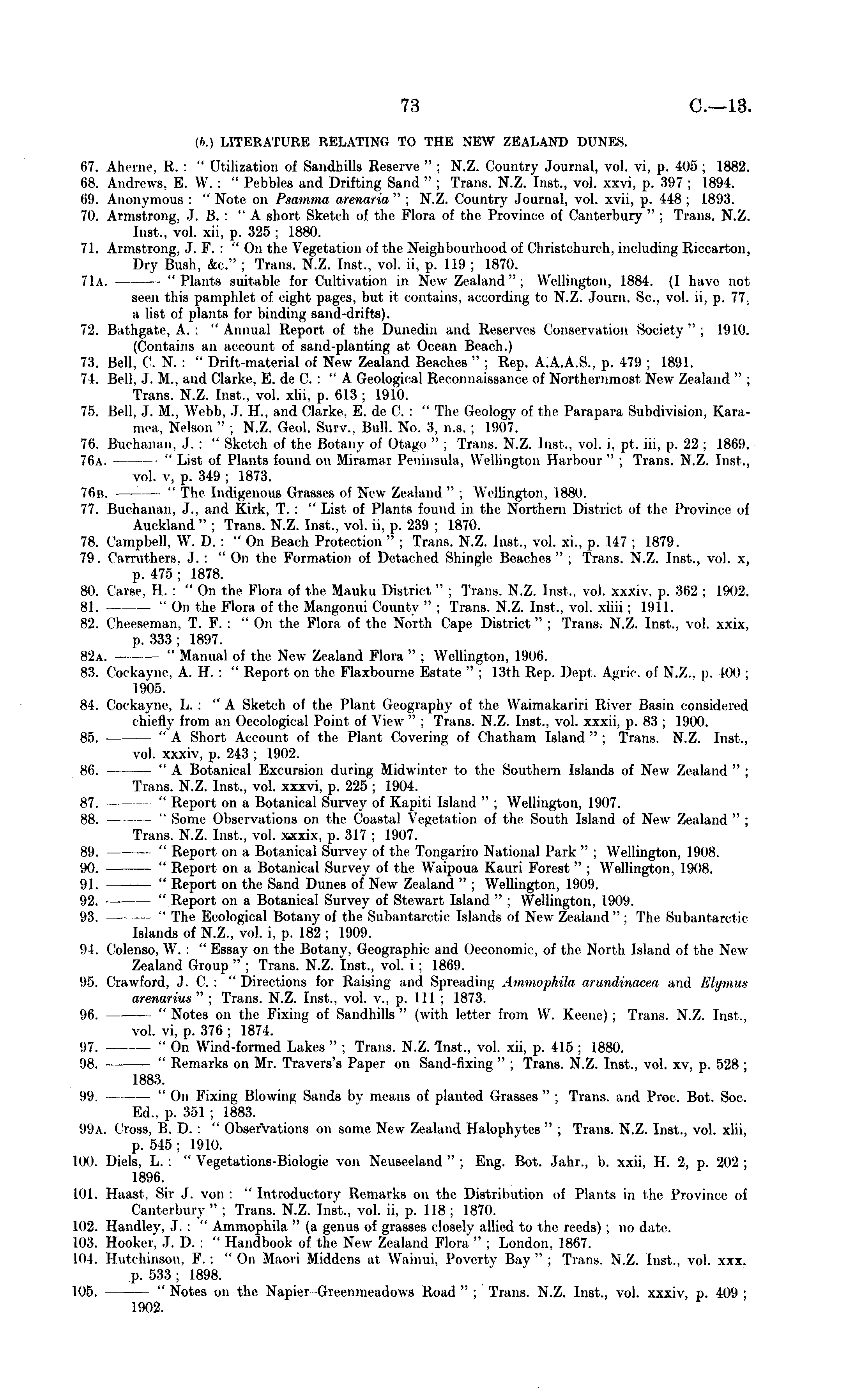 (6.) LITERATURE RELATING TO THE NEW ZEALAND DUNES. 67. Aherne, R. : " Utilization of Sandhills Reserve " ; N.Z. Country Journal, vol. vi, p. 405 ; 1882. 68. Andrews, E. W. : " Pebbles and Drifting Sand " ; Trans. N.Z. Inst., vol. xxvi, p. 397 ; 1894. 69. Anonymous : " Note on Psamma arenaria " ; N.Z. Country Journal, vol. xvii, p. 448 ; 1893. 70. Armstrong, J. B. : "A short Sketch of the Flora of the Province of Canterbury " ; Trans. N.Z. Inst., vol. xii. p. 325; 1880. 71. Armstrong, J. F. : " On the Vegetation of the Neighbourhood of Christchurch, including Riccarton, Dry Bush, &c" ; Trans. N.Z. Inst., vol. ii, p. 119 ; 1870. 71a. "Plants suitable for Cultivation in New Zealand": Wellington, 1884. (I have not seen this pamphlet of eight pages, but it contains, according to N.Z. Journ. Sc, vol. ii, p. 77. a list of plants for binding sand-drifts). 72. Bathgate, A. : "Annual Report of the Dunedin and Reserves Conservation Society"; 1910. (Contains an account of sand-planting at Ocean Beach.) 73. Bell. C. N. : " Drift-material of New Zealand Beaches " ; Rep. A.A.A.S., p. 479 ; 1891. 74. Bell, J. M., and Clarke, E. de C. : "A Geological Reconnaissance of Northernmost New Zealand " ; Trans. N.Z. Inst., vol. xlii, p. 613 ; 1910. 75. Bell, J. M., Webb, J. H, and Clarke. E. de C. : " The Geology of the Para para Subdivision, Karamea. Nelson " ; N.Z. Geol. Surv., Bull. No. 3, n.s. ; 1907. 76. Buchanan. J. : " Sketch of the Botany of Otago " ; Trans. N.Z. Inst., vol. i, pt. iii, p. 22 ; 1869. 76a. " List of Plants found on Miramar Peninsula. Wellington Harbour" ; Trans. N.Z. Inst., vol. v, p. 349 ; 1873. 76b. — " The Indigenous Grasses of New Zealand " ; Wellington, 1880. 77. Buchanan, J., and Kirk, T. : "List of Plants found in the Northern District of the Province of Auckland" ; Trans. N.Z. Inst., vol. ii, p. 239 ; 1870. 78. Campbell, W. D. : " On Beach Protection " ; Trans. N.Z. Inst., vol. xi., p. 147 ; 1879. 79. Carruthers. J. : " On the Formation of Detached Shingle Beaches " ; Trans. N.Z. Inst., vol. x, p. 475 ; 1878. Bii. (arse. 11. : " On the Flora of the Mauku District " : Trans. N.Z. Inst., vol. xxxiv, p. 362 ; 1902. 81. " On the Flora of the Mangonui County " ; Trans. N.Z. Inst., vol. xliii ; 1911. 82. Cheeseman, T. F. :" On the Flora of the North Cape District" ; Trans. N.Z. Inst., vol. xxix, p. 333 ; 1897. 82a. " Manual of the New Zealand Flora " ; Wellington, 1906. 83. Cockayne, A. H. : " Report on the Flaxbourne Estate " ; 13th Rep. Dept. Agric. of N.Z.. p. 100 ; 1905. 84. Cockayne, L. : " A Sketch of the Plant Geography of the Waimakariri River Basin considered chiefly from an Oecological Point of View " ; Trans. N.Z. Inst., vol. xxxii, p. 83 ; 1900. 85. " A Short Account of the Plant Covering of Chatham Island " ; Trans. N.Z. Inst., vol. xxxiv, p. 243 ; 1902. 86. " A Botanical Excursion during Midwinter to the Southern Islands of New Zealand " ; Trans. N.Z. Inst., vol. xxxvi, p. 225 ; 1904. 87. " Report on a Botanical Survey of Kapiti Island " ; Wellington, 1907. 88. " Some Observations on the Coastal Vegetation of the South Island of New Zealand " ; Trans. N.Z. Inst., vol. xxxix, p. 317 ; 1907. 89. " Report on a Botanical Survey of the Tongariro National Park " ; Wellington, 1908. 90. " Report on a Botanical Survey of the Waipoua Kauri Forest " ; Wellington, 1908. 91. " Report on the Sand Dunes of New Zealand " ; Wellington, 1909. 92. — " Report on a Botanical Survey of Stewart Island " ; Wellington, 1909. 93. " The Ecological Botany of the Subantarctic Islands of New Zealand" ; The Subantarctic Islands of N.Z., vol. i. p. 182 ; 1909. 9 I. Colcnso. W. : " Essay on the Botany, Geographic and Oeconomic, of the North Island of the New Zealand Group " ; Trans. N.Z. Inst., vol. i ; 1869. 95. Crawford, J. C. : "Directions for Raising and Spreading Ammophila arundinacea and Elymus arenarius" ; Trans. N.Z. Inst., vol. v., p. 11l ; 1873. 96. " Notes on the Fixing of Sandhills " (with letter from W. Keenc) ; Trans. N.Z. Inst., vol. vi, p. 376 ; 1874. 97. — " On Wind-formed Lakes " ; Trans. N.Z. Inst., vol. xii, p. 415 ; 1880. 98. " Remarks on Mr. Travers's Paper on Sand-fixing " ; Trans. N.Z. Inst., vol. xv, p. 528 ; 1883. 99. "On Fixing Blowing Sands by means of planted Grasses" ; Trans, and Proc. Bot. Soc. Ed., p. 351 ; 1883. 99a. Cross, B. D. : " Observations on some New Zealand Halophytes " ; Trans. N.Z. Inst., vol. xlii, p. 545 ; 1910. 100. Diels, L. : " Vegetations-Biologic yon Neuseeland " ; Eng. Bot. Jahr., b. xxii, H. 2, p. 202 ; 1896. 101. Haast. Sir J. yon : "Introductory Remarks on the Distribution of Plants in the Province of Canterbury" ; Trans. N.Z. Inst., vol. ii, p. 118; 1870. 102. Handley, J. : " Ammophila " (a genus of grasses closely allied to the reeds) ; no date. 103. Hooker", J. D. : " Handbook of the New Zealand Flora " ; London, 1867. 101. Hutchinson, F.: "On Maori Middens at Wainui, Poverty Bay"; Trans. N.Z. Inst., vol. xxx. .p. 533 ; 1898. 105. "Notes on the Napier -Greenmeadows Road"; Trans. N.Z. Inst., vol. xxxiv, p. 409; 1902.