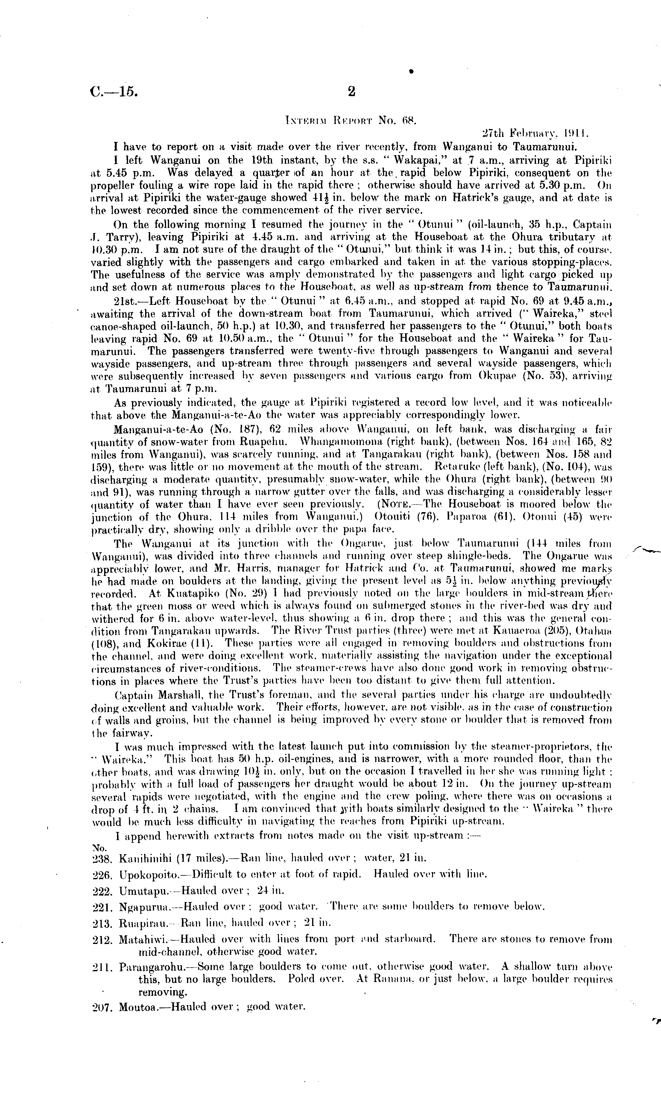 Interim Report No. 68. 27th February. 1911. I have to report on a visit made over the river recently, from Wanganui to Taumarunui. 1 left Wanganui on the 19th instant, by the s.s. " Wakapai," at 7 a.tr)., arriving at Pipiriki at 5.45 p.m. Was delayed a quarter of an hour at the,rapid below Pipiriki, consequent on the propeller Fouling a wire rope laid in the rapid there; otherwise should have arrived at 5.30 p.m. On arrival at I'ipiriki the water-gauge showed HJ in. below the mark on llatriek's gauge, and at date is the lowest recorded since the commencement of the river service. On the following morning I resumed the journey in the "Otunui" (oil-launch. .'55 h.p., Captain .1. Tarry), leaving Pipiriki at 4.45 a.m. and arriving at the Houseboat at the Ohura tributary at 10.30 p.m. lam not sure of the draught of the " Otunui," hut think it was I 1 in. ; but this, of course. varied slightly with the passengers and cargo embarked and taken in at the various stopping-places. The usefulness of the service was amply demonstrated by the passengers and light cargo picked up and set down at numerous places to the llouselioat. as well as up-stream from thence to Taunianiiiui. 21st. Left llouselioat by the ■Otunui" at 6.45 a.m., and slopped at rapid No. 69 at 9.45 n.in., awaiting the arrival of the down-st ream boat from Taumarunui. which arrived (" Waireka,' , steel canoe-shaped oil-launch. 50 h.p.) at 10.30, and transferred her passengers to the " Otunui." both boats leaving rapid No. 09 at 10.51) a.m., the "Otunui" for the llouselioat and the " Waireka" for Taumarunui. The passengers transferred were twenty five through passengers to Wanganui and several wayside passengers, and up-stream three through passengers ;md several wayside passengers, which were subsequently increased by seven passengers and various cargo from Okupae (No. 53), arriving it Taumarunui at 7 p.m. As previously indicated, the gauge at Pipiriki registered a record low level, and it was noticeable that above the Manganui-a-te-Ao the water was appreciably correspondingly lower. Manganui-a-te-Ao (No. IX~). c>2 miles above Wanganui, on left hank, was discharging a fair quantity of snow-water from Ruapehu. Whangamomona (right bank), (between Nos. 164 and 165, 82 miles from Wanganui), was scarcely running, and at Tangarakau (right bank), (between Nos. 158 and 159), there was little or no movement at tin- mouth of the stream. Retaruke (left hank). (No. 101). was discharging a moderate quantity, presumably snow-water, while the Ohura (right bank), (between '.hi and 91). was running through a narrow gutter over the falls, ami was discharging a considerably lesser quantity of water than I have ever seen previously. (NOTE. The llouselioat is moored below tin , junction of the Ohura. 11l miles from Wanganui.) Otouiti (76). Paparoa (<>l). Otonui (15) were practically dry. showing only a dribble over the papa lace. The Wanganui a< its junction with the Ongarue, just below Taumarunui (141 miles from Wanganui), was divided into three channels and running over steep shingle-beds. The Ongarue was appreciably lower, and Mr. Harris, manager for rlatrick and Co. at Taumarunui. showed me marks he had made on boulders ;it the landing, giving tin , present level as 5$ in. below anything previouph recorded. At Kuatapiko (No. 29) 1 had previously noted on the large boulders in mid-stream ! herthat the green moss or weed which is always found on submerged stones in the river-bed was dry and withered for (i in. above water-level, thus showing a (i in. drop there; and this was the general eon dition from Tangarakau upwards. The River Trust parties (three) were met at Kauaeroa (205). Otaliua (108), and Kokirae (II). These parlies were ail engaged in removing boulders and obstructions from the channel, and were doing excellent work, materially assisting the navigation under the exceptional circumstances of river-conditions. The steamer en ws have also done good work in removing obstructions in places where the Trust's parlies have been too distant to give them full attention. Captain .Marshall, the Trust's foreman, and the several parlies under his charge are undoubtedly doing excellent and valuable work. Their efforts, however, are not Visible, as in the caee of construction I f walls and uniins. but the channel is being improved by every stone or boulder that is removed from the fairway. 1 was much impressed with the latest launch put into commission by the steamer-proprietors, the " Waireka." This boat has 50 h.p. oil-engines, and is narrower, with a more rounded floor, than the i i her boats, and was drawing lOjj in. only, but on the occasion I t ravelled in her she was running light : probably with a lull load of passengers her draught would be about 12 ill. On the journey up-stream several rapids weie negotiated, with the engine and the crew poling, where there was on occasions a .Imp of I ft. in. 2 chains. lam convinced thai jyith boats similarly designed to the " Waireka " there would be much less difficulty in navigating the reaches from I'ipiriki up-stream. I append herewith extracts from notes made on the visit up-stream : No. 238. Kanihinihi (17 miles). Ran line, hauled over; water, 21 in. 226. QpokopoitO. Difficult to enter at fool of rapid. Hauled over with line. 222. Umutapu. Hauled over; 21 in. 221. Ngapurua. Hauled over; good water. There are some boulders to remove below. 213. Ruapirau. Ran line, hauled over; 21 in. 212. Matahiwi. Hauled over with lines from port and starboard. There are stones to remove from mid-channel, otherwise good water. 211. Parangarohu. Some large boulders to come out. otherwise good water. A shallow turn above this, but no large boulders. Poled over. At Etanana, or just below, a large boulder requires removing. 207. Moutoa. —Hauled over ; good water.