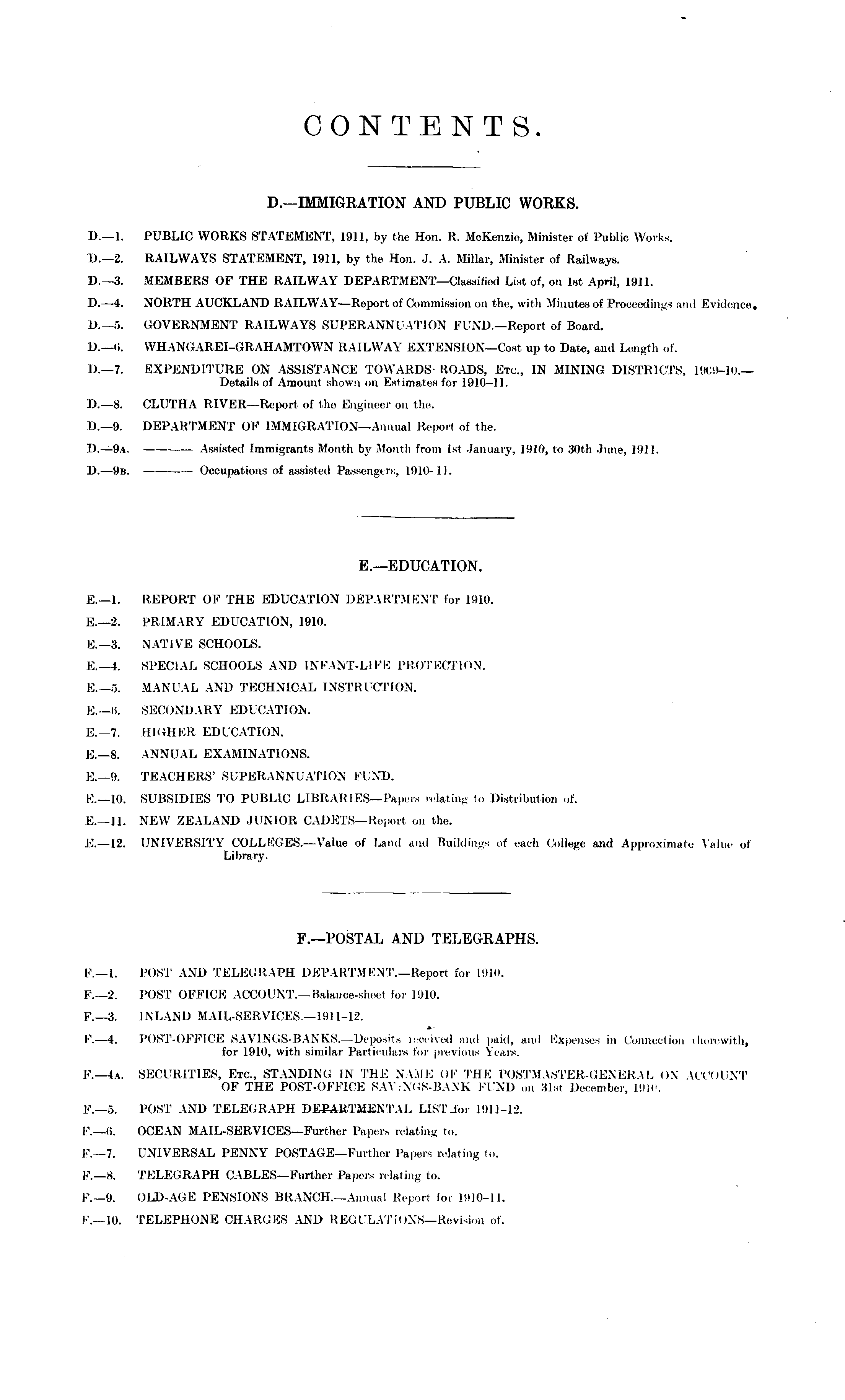 CONTENTS. D.—IMMIGRATION AND PUBLIC WORKS. D.—l. PUBLIC WORKS STATEMENT, 1911, by the Hon. R. MoKenzie, Minister of Public Works. D.—2. RAILWAYS STATEMENT, 1911, by the Hon. J. A. Millar, Minister of Railways. D.—3. MEMBERS OF THE RAILWAY DEPARTMENT— CIassified List of, on Ist April, 1911. 1).—4. NORTH AUCKLAND RAILWAY— Report of Commission <>v the, with Minutes of Proceedings and Evidence. D.—s. GOVERNMENT RAILWAYS SUPERANNUATION FUND.—Report of Board. D.—f>. WHANGAREI-GRAHAMTOWN RAILWAY EXTENSION—CoeI up to Date, and Length of. D.—7. EXPENDITURE ON ASSISTANCE TOWARDS ROADS, Etc., IN MINING DISTRICTS, 19C9-10.— Details of Amount shown on Estimates for 1910—11. D.—B. CLUTHA RlVER—Report of the Engineer on the. D.—9. DEPARTMENT OF IMMIGRATION—AnnuaI Report of the. D.—9a. Assisted Immigrants Month by Month from Ist January, 1910, to 30th June, 1911. D.—9b. Occupations of assisted Passengers, 11)10-11. E.—EDUCATION. E.—l. REPORT OF THE EDUCATION DEPARTMENT for 1910. E.—2. PRIMARY EDUCATION, 1910. X.— :). NATIVE SCHOOLS. X.— 4. SPECIAL SCHOOLS AND ENFANT-LIFE PROTECTION. E.—s. MANUAL AND TECHNICAL INSTRUCTION. E._6. SECONDARY EDUCATION. E.—7. HIGHER EDUCATION. E.—B. ANNUAL EXAMINATIONS. E.—9. TEACHERS' SUPERANNUATION FUND. E.—lo. SUBSIDIES TO PUBLIC LIBRARIES—Papers relating to Distribution of. E.— ll. NEW ZEALAND JUNIOR CADETS—Report on the. E.— l2. UNIVERSITY COLLEGES.—VaIue of Land and Buildings of each College and Approximate Value of Library. F.—POSTAL AND TELEGRAPHS. F._ 1. POST AXJ) TELEGRAPH DEPARTMENT.—Report for 1910. F._2. POST OFFICE ACCOUNT.—Bakuioe-sheel for 1010. F.—3. INLAND MAIL-SERVICES.—I9II-12. F. — 4. POST-OFFICE SAVINGS-BANKS.—Deposits luoeived and paid, and Expenses in Connection therewith, for 1910, with similar Particulars for previous Years. F.—4a. SECURITIES, Etc., STANDING IN THE NAME OF THE POBTMASTER-GENERAL ON VCCOUNT OF THE POST-OFFICE SAVINGS-BANK FUND on 31s1 December, 1910. F.— 6. POST AND TELEGRAPH DEUAIiTiI KMWL LiKT for tSUr-12. F.—l!. OCEAN MAIL-SERVICES—Further Papers relating to. F.—7. UNIVERSAL PENNY POSTAGE—Further Papers relating to. F._B. TELEGRAPH CABLES—Further Paper relating to. F.—9. OLD-AC!:: PEXSloxs BRANCH.—AnnuaI Report for 1910-11. F.—lo. TELEPHONE CHARGEB AND REGULATIONS—Revision of.