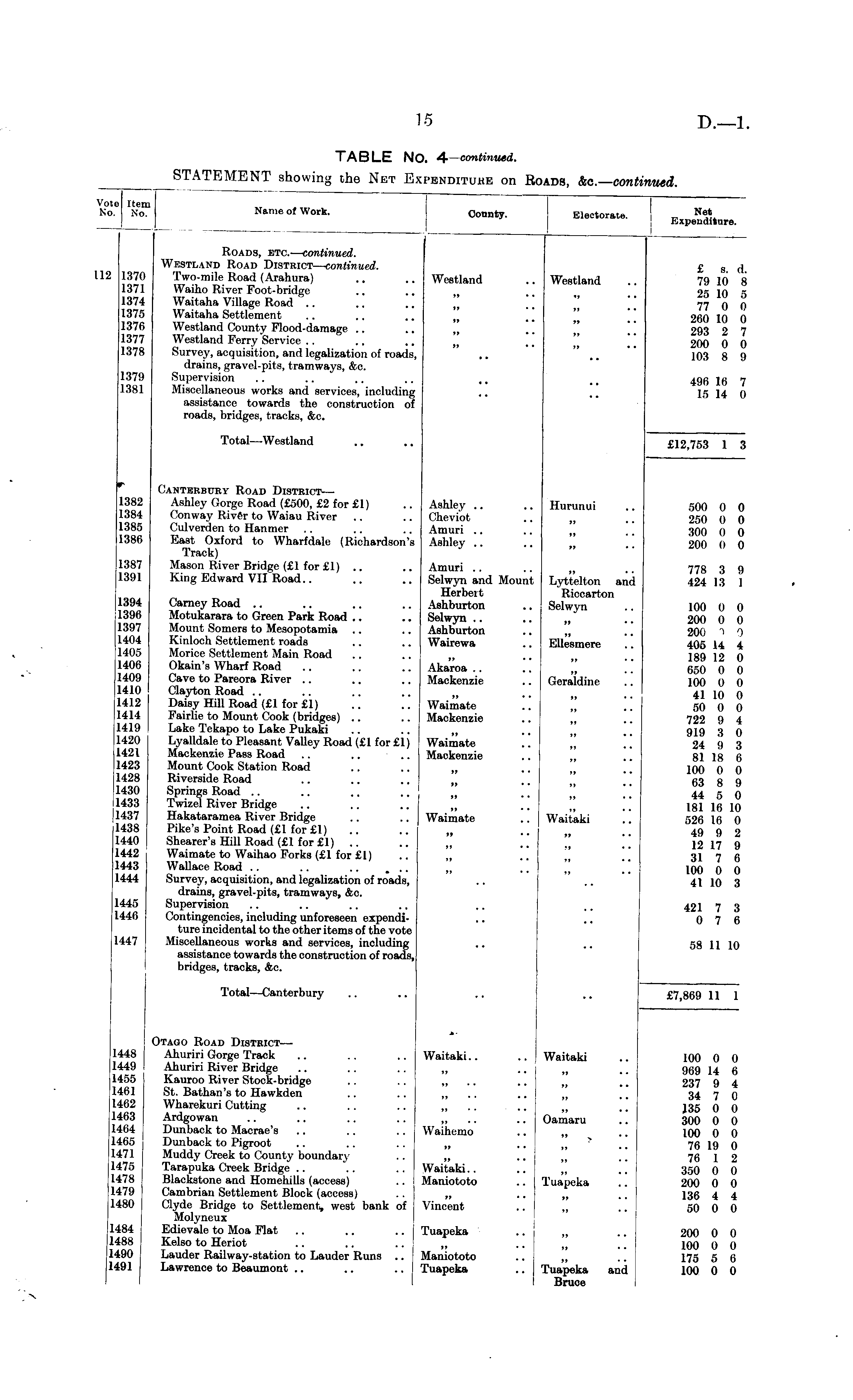 Vote No. Item No. Name of Work. Electorate. Net Expenditure. County. 1L> 1370 1371 1374 1375 1376 1377 1378 Roads, etc.— continued. Westland Road District— continued. Two-mile Road (Arahura) Waiho River Foot-bridge Waitaha Village Road Waitaha Settlement Westland County Flood-damage Westland Ferry Service Survey, acquisition, and legalization of roads, drains, gravel-pits, tramways, &c. Supervision Miscellaneous works and services, inoklding assistance towards the construction of roads, bridges, tracks, &c. Westland »» • • Westland £ s. d. 79 10 8 25 10 5 77 0 0 260 10 0 293 2 7 200 0 0 103 8 9 »» • • 1379 1381 496 16 7 15 14 0 Total—Westland £12,753 1 3 1382 1384 1385 1386 Canterbury Road District— Ashley Gorge Road (£500, £2 for £1) Conway RivSr to Waiau River Culverden to Hanmer East Oxford to Wharfdale (Richardson's Track) Mason River Bridge (£1 for £1) King Edward VII Road Ashley Cheviot Amuri Ashley Hurunui »> • • 600 0 0 250 0 0 300 0 0 200 0 0 »» • • 1387 1391 Amuri Selwyn and Mount Herbert Ashburton Selwyn Ashburton Wairewa Lyttelton and Riccarton Selwyn 778 3 9 424 13 1 1394 1396 1397 1404 1405 1406 1409 1410 1412 1414 1419 1420 1421 1423 1428 1430 1433 11437 1438 1440 1442 1443 1444 Carney Road Motukarara to Green Park Road Mount Somers to Mesopotamia Kinloch Settlement roads Morice Settlement Main Road Okain's Wharf Road Cave to Pareora River Clayton Road Daisy Hill Road (£1 for £1) Fairlie to Mount Cook (bridges) Lake Tekapo to Lake Pukaki Lyalldale to Pleasant Valley Road (£1 for £1) Mackenzie Pass Road Mount Cook Station Road Riverside Road Springs Road Twizel River Bridge Hakataramea River Bridge Pike's Point Road (£1 for £1) Shearer's Hill Road (£1 for £1) .. Wivimate to Waihao Forks (£1 for £1) Wallace Road .. .. Survey, acquisition, and legalization of roads, drains, gravel-pits, tramways, &c. Supervision Contingencies, including unforeseen expenditure incidental to the other items of the vote Miscellaneous works and services, including assistance towards the construction of roads, bridges, tracks, &c. Akaroa Mackenzie Waimate Mackenzie >» • • Waimate Mackenzie Ellesmere Geraldine 100 0 0 200 0 0 200 I 'I 405 14 4 189 12 0 650 0 0 100 0 0 41 10 0 50 0 0 722 i) 4 919 3 0 24 9 3 81 18 6 100 0 0 63 8 9 44 5 0 181 16 10 526 Iβ 0 49 9 2 12 17 9 31 7 6 100 0 0 41 10 3 »» • • Waimate Waitaki »» • • »» • • •» • • »» • • 1445 1446 421 7 3 0 7 6 1447 58 11 10 Total—Canterbury £7,869 11 1 Otaoo Road District— Ahuriri Gorge Track Ahuriri River Bridge Kauroo River Stock-bridge St. Bathan's to Hawkden Wharekuri Cutting Ardgowan Dunback to Macrae's Dunback to Pigroot Muddy Creek to County boundary Tarapuka Creek Bridge Blackstone and Homehills (access) Cambrian Settlement Block (access) Clyde Bridge to Settlement, west bank of Molyneux Edievale to Moa Flat Kelso to Heriot Lauder Railway-station to Lauder Runs .. Lawrence to Beaumont > i 1448 1449 1455 1461 1462 1463 1464 1465 1471 1475 1478 1479 1480 Waitaki Waitaki 100 0 0 969 14 6 237 9 4 34 7 0 J35 0 0 300 0 0 100 0 0 76 19 0 76 1 2 350 0 0 200 0 0 136 4 4 50 0 0 Waihemo Oamaru " »» • • Waitaki Maniototo Tuapeka Vincent 1484 1488 1490 491 Tuapeka >» 200 0 0 100 0 0 175 5 6 100 0 0 Maniototo Tuapeka >» Tuapeka and