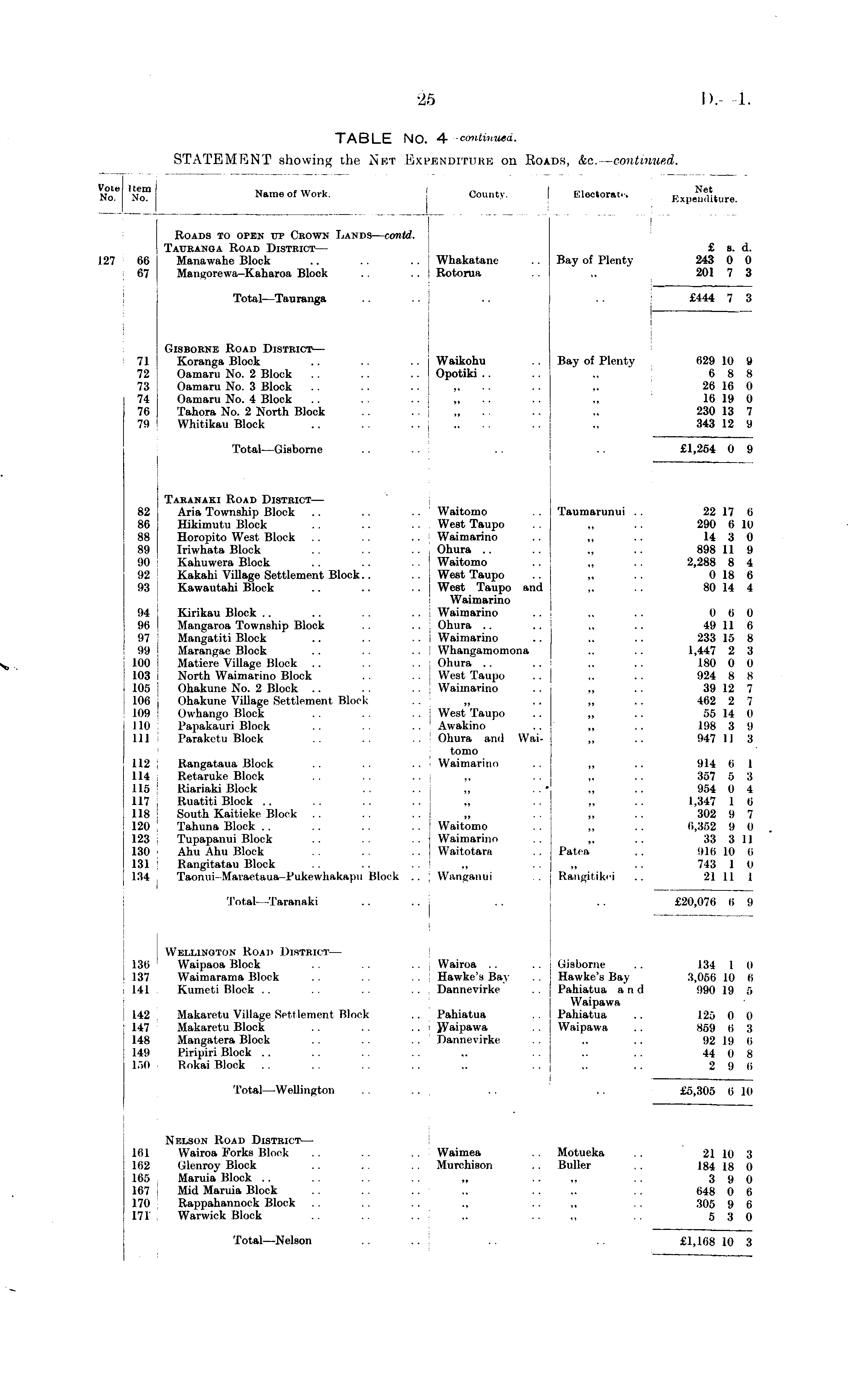 Vote Item No. No. Name of Work. County. Electoral.-. Net Expenditure. 27 66 67 Roads to open up Crown Lands — c&ntd. Tauranga Road District — 66 Manawahe Block .. .. . . Whakatane 67 Mangorewa—Kaharoa Block .. . . Rotorua Bay of I'len Bay of Plenty rity £ s. d. 243 0 0 201 7 3 £ s. d. 243 0 0 201 7 3 — — Total —Tauranga .. £444 7 3 £444 7 3 Gisborne Road District — 71 Koranga Block .. .. .. Waikohu 72 Oamaru No. 2 Block . . .. .. Opotiki 73 Oamaru No. 3 Block .. .. 74 Oamaru No. 4 Block .. .. 76 Tahora No. 2 North Block .. .. „ 79 Whitikau Block .. .. .. ,. • • 71 72 73 74 7<i 79 Bay of Pier Bay of Plenty nty 629 10 » 6 8 8 26 16 0 16 19 0 230 13 7 343 12 9 629 10 » 6 8 8 26 16 0 16 19 0 230 13 7 343 12 9 Total—Gisborne £1,254 0 9 £1,254 0 82 86 88 89 90 92 93 94 96 97 99 100 103 105 106 109 110 111 Taranaei Road District — 82 Aria Township Block .. .. . . Waitomo 86 Hikimutu Block . . .. . . West Taupo 88 Horopito West Block .. .. .. Waimarino 89 Iriwhata Block . . .. Ohura 90 Kahuwera Block . . .. .. Waitomo 92 Kakahi Village Settlement Block.. .. West Taupo 93 Kawautahi Block .. .. . . West Taupo and Waimarino 94 Kirikau Block .. .. . . . Waimarino 96 Mangaroa Township Block . . .. Ohura 97 Mangatiti Block .. .. . . Waimarino 99 Marangae Block .. .. . . Whangamomona 100 Matiere Village Block .. .. . Ohura 103 North Waimarino Block . . .. West Taupo 106 Ohakune No. 2 Block .. .. .. Waimarino 106 Ohakune Village Settlement Block .. „ 109 (Iwhango Block .. .. .. West Taupo 110 i Papakauri Block .. .. .. Awakino 1 J 1 Paraketu Block . . . . . Ohura anil Wai- I tomo 112 Rangataua Block .. .. .. Waimarino IJ4 Retaruke Block 115 Riariaki Block . . .. „ 117 ; Ruatiti Block .. .. .. .. „ 118 South Kaitieke Block .. . . .. „ 120 Tahuna Block .. .. .. .. Waitomo 123 Tupapanui Block .. .. .. Waimarinn J HO Ahu Ahu Block .. .. .. Waitotara 131 Rangitatau Block .. .. .. „ 134 Taonui-Maraetaua-Pukewhftkapii Block .. Wanganui Taumarunu ;; >, Patea" Rangitikei Taumarunui .. ni . . 22 17 0 290 6 10 14 3 0 898 11 9 2,288 8 4 0 18 6 80 14 4 0 ti 0 49 11 6 233 15 8 1,447 2 3 180 0 0 924 8 8 39 12 7 462 2 7 55 14 0 198 3 9 947 II 3 914 li I 357 6 3 954 0 4 1,347 1 6 302 9 7 6,362 9 0 Xi 3 11 Dili 10 (i 743 1 0 21 11 1 22 17 6 290 6 10 14 3 0 898 11 9 2,288 8 4 0 18 6 80 14 4 0 ti 0 49 11 6 233 15 8 1,447 2 3 180 0 0 924 8 8 39 12 7 462 2 7 55 14 0 198 3 9 947 II 3 112 114 115 117 118 120 123 130 131 134 Patca" Rangitikei 914 li I 357 6 3 954 0 4 1,347 1 6 302 9 7 6,362 9 0 33 3 11 Dili 10 (i 743 1 0 21 11 1 Total--Taranaki .. ..I £20,076 I) 9 £20,076 t> 9 I Wellington Road District— 136 Waipaoa Block .. .. .. Wairoa .. 137 Waimarama Block .. . . . Hawke's Bay 141 Kumeti Block .. .. . . . Dannevirke .. | Uisborne Hawke's Ba Pahiatua a (iisbome Hawke's Bay Pahiatua and Waipawa Pahiatua Waipawa and 134 1 0 3,056 10 6 990 19 5 125 0 0 859 li :i 92 I!) 6 44 0 8 2 9 6 134 1 0 3,056 10 6 990 19 6 Waiuawa 142 Makaretu Village Settlement Block .. Pahiatua 147 Makaretu Block .. .. . . Waipawa 148 Mangatera Block .. . . . . Dannevirke 149 Piripiri Block .. 150 Rokai Block Pahiatua Waipawa 125 0 0 859 li :i 92 19 6 44 0 8 2 9 6 Total—Wellington £5,305 6 10 £5,305 6 1(1 Nelson Road District— 161 Wairoa Forks Block . . .. .. Waimea 162 Glenroy Block .. . . . . Murchison 165 Maruia Block 167 , Mid Maruia Block 170 Rappahannock Block 171 Warwick Block Motueka Buller 21 10 3 184 18 0 3 9 0 648 0 6 305 9 6 5 3 0 Total—Nelson £1,168 10 3
