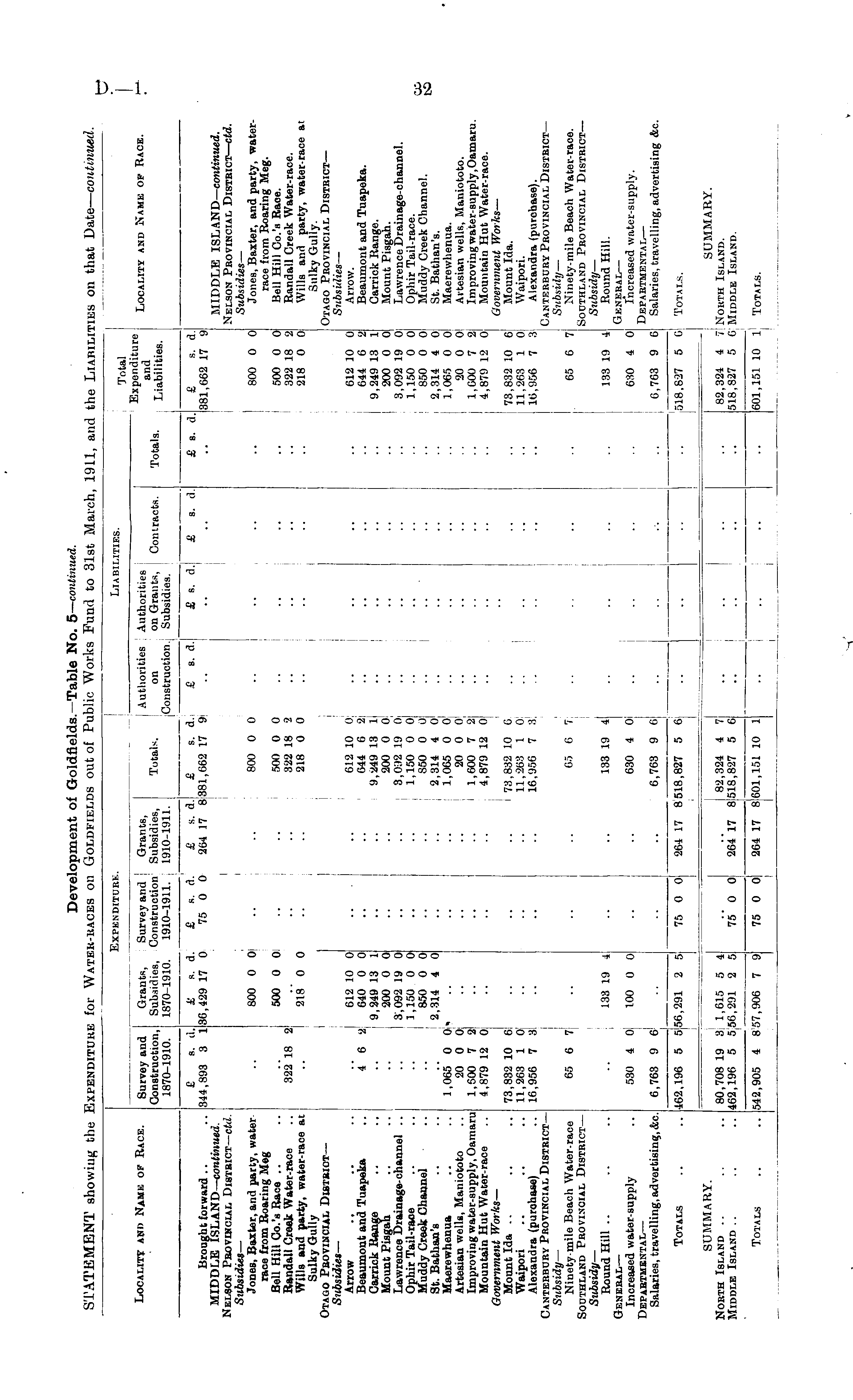 Development of Goldfields. -Table No. 5— continued. STATEMENT showing the Expenditure for Water-races on Goldfields out of Public Works Fund to 31st March, 1911, and the Liabilities on that Date— continued.