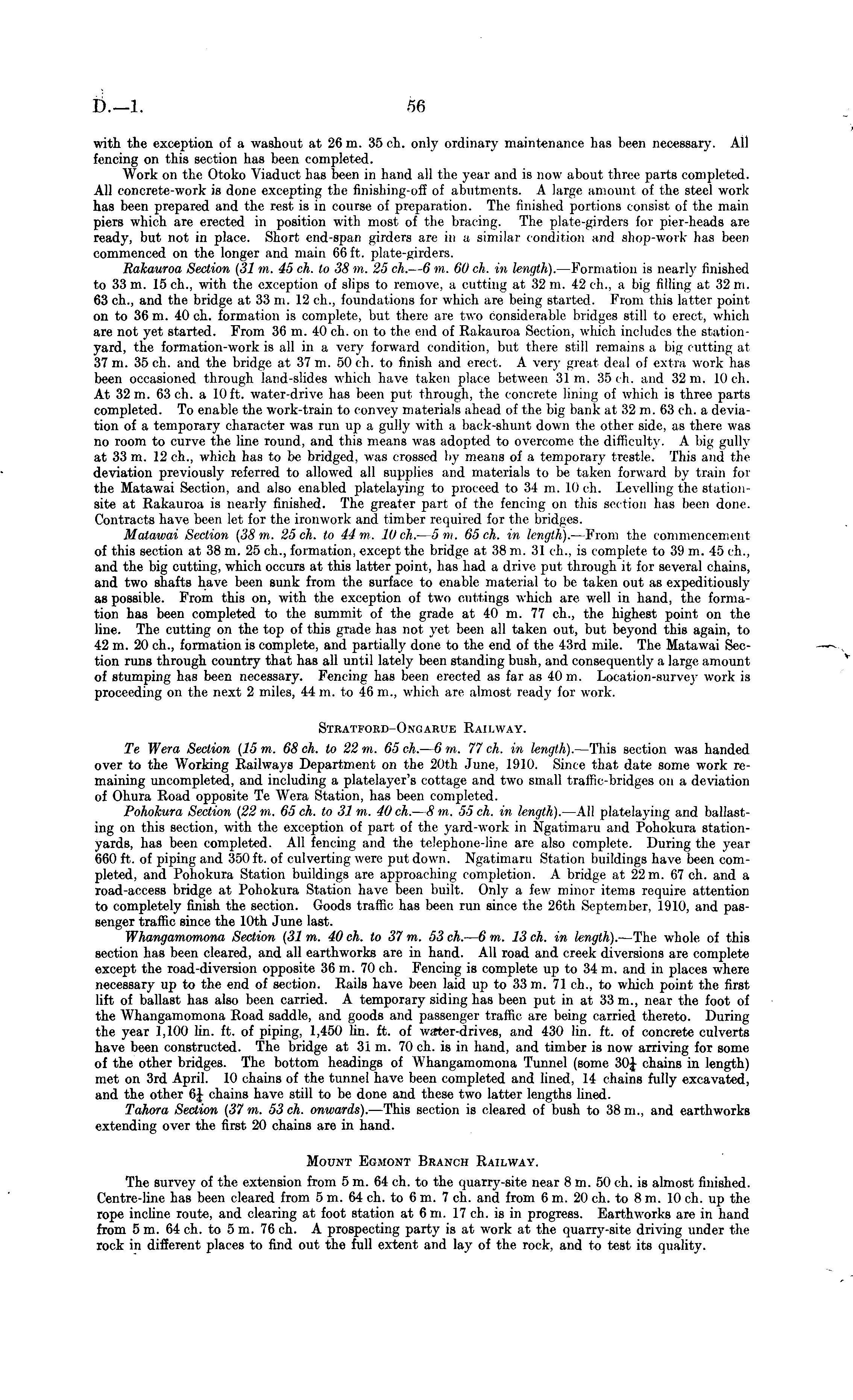 with the exception of a washout at 26 m. 35 eh. only ordinary maintenance has been necessary. All fencing on this section has been completed. Work on the Otoko Viaduct has been in hand all the year and is now about three parts completed. All concrete-work is done excepting the finishing-oil of abutments. A large amount of the steel work has been prepared and the rest is in course of preparation. The finished portions consist of the main piers which are erected in position with most of the bracing. The plate-girders for pier-heads are ready, but not in place. Short end-span girders are in a similar condition and shop-work lias been commenced on the longer and main 66 ft. plate-girders. Rakauroa Section (31 m. 45 eh. to 38 m. 25 eh. — 6 m. 60 eh. in length). — Formation is nearly finished to 33 m. 15 eh., with the exception of slips to remove, a cutting at 32 m. 42 eh., a big filling at 32 m. 63 eh., and the bridge at 33 m. 12 eh., foundations for which are being started. From this latter point on to 36 m. 40 eh. formation is complete, but there are two considerable bridges still to erect, which are not yet started. From 36 m. 40 eh. on to the end of Rakauroa Section, which includes the stationyard, the formation-work is all in a very forward condition, but there still remains a big cutting at 37 m. 35 eh. and the bridge at 37 m. 50 eh. to finish and erect. A very great deal of cxi ra work has been occasioned through land-slides which have taken place between 31m. 35 eh. and ■'Win. 10 eh. At 32 m. 63 eh. a 10 ft. water-drive has been put through, the concrete lining of which is three parts completed. To enable the work-train to convey materials ahead of the big bank at 32 m. 63 eh. a deviation of a temporary character was run up a gully with a back-shunt down the other side, as there was no room to curve the line round, and this means was adopted to overcome the difficulty. A big gully at 33 m. 12 eh., which has to be bridged, was crossed by means of a temporary trestle. This and the deviation previously referred to allowed all supplies and materials to be taken forward by train for the Matawai Section, and also enabled jtlatelaying to proceed to 34 m. 10 eh. Levelling the stationsite at Rakauroa is nearly finished. The greater part of the fencing on this section has been done. Contracts have been let for the ironwork and timber required for the bridges. Matawai Section (38 m. 25 eh. to 44 m. 10 eh. — 5 m. 65 eh. in length). —From the commencement of this section at 38 m. 25 eh., formation, except the bridge at 38 m. 31 eh., is complete to 39 m. 45 eh., and the big cutting, which occurs at this latter point, has had a drive put through it for several chains, and two shafts have been sunk from the surface to enable material to be taken out as expeditiously as possible. From this on, with the exception of two cuttings which are well in hand, the formation has been completed to the summit of the grade at 40 m. 77 eh., the highest point on the line. The cutting on the top of this grade has not yet been all taken out, but beyond this again, to 42 m. 20 eh., formation is complete, and partially done to the end of the 43rd mile. The Matawai Section runs through country that has all until lately been standing bush, and consequently a large amount of stumping has been necessary. Fencing has been erected as far as 40 m. Location-survey work is proceeding on the next 2 miles, 44 m. to 46 m., which are almost ready for work. Stratford-Ongarue Railway. Te Wera Section (15 m. 68 eh. to 22 m. 65 eh. — 6 m. 77 eh. in length). —This section was handed over to the Working Railways Department on the 20th June, 1910. Since that date some work remaining uncompleted, and including a platelayer's cottage and two small traffic-bridges on a deviation of Ohura Road opposite Te Wcra Station, has been completed. Pohokura Section (22 m. 65 eh. to 31m. 40 ch. — B m. 55 eh. in length). —All platelaying and ballasting on this section, with the exception of part of the yard-work in Ngatimaru and Pohokura stationyards, has been completed. All fencing and the telephone-line are also complete. During the year 660 ft. of piping and 350 ft. of culverting were put down. Ngatimaru Station buildings have been completed, and Pohokura Station buildings are approaching completion. A bridge at 22 m. 67 eh. and a road-access bridge at Pohokura Station have been built. Only a few minor items require attention to completely finish the section. Goods traffic has been run since the 26th September, 1910, and passenger traffic since the 10th June last. Whangamomona Section (31 m. 40 eh. to 37 m. 53 eh. —6 m. 13 eh. in length). —The whole of this section has been cleared, and all earthworks are in hand. All road and creek diversions are complete except the road-diversion opposite 36 m. 70 eh. Fencing is complete up to 34 m. and in places where necessary up to the end of section. Rails have been laid up to 33 in. 71 eh., to which point the first lift of ballast has also been carried. A temporary siding has been put in at 33 m., near the foot of the Whangamomona Road saddle, and goods and passenger traffic are being carried thereto. During the year 1,100 lin. ft. of piping, 1,450 lin. ft. of wirter-drives, and 430 lin. ft. of concrete culverts have been constructed. The bridge at 31 m. 70 eh. is in hand, and timber is now arriving for some of the other bridges. The bottom headings of Whangamomona Tunnel (some 30J chains in length) met on 3rd April. 10 chains of the tunnel have been completed and lined, 14 chains fully excavated, and the other 6 J chains have still to be done and these two latter lengths lined. Tahora Section (37 m. 53 eh. onwards). —This section is cleared of bush to 38 m., and earthworks extending over the first 20 chains are in hand. Mount Egmont Branch Railway. The survey of the extension from 5 m. 64 eh. to the quarry-site near 8 m. 50 eh. is almost finished. Centre-line has been cleared from 5 m. 6