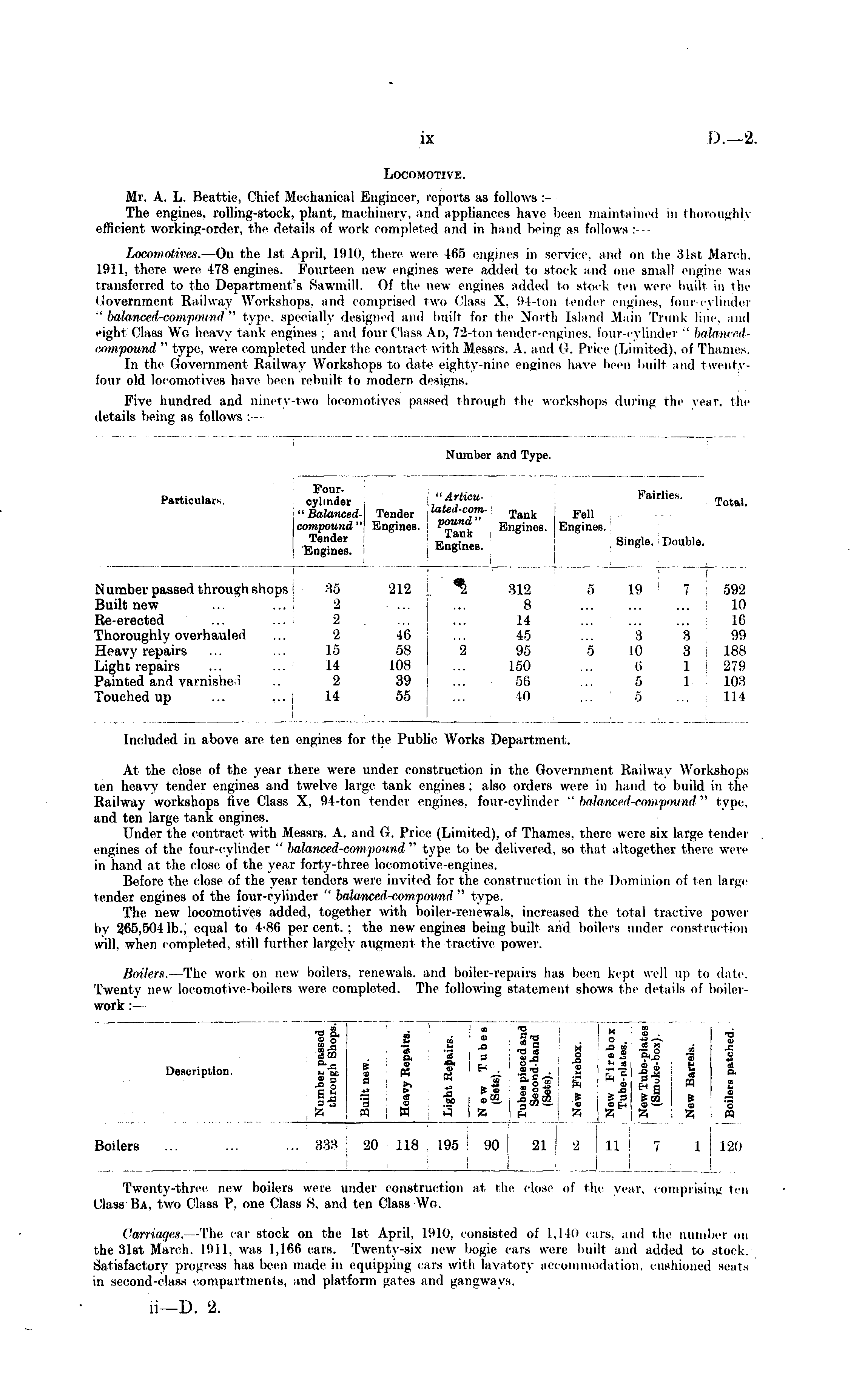 Included in above are ten engines for the Public Works Department. At the close of the year there were under construction in the Government Railway Workshops ten heavy tender engines and twelve large tank engines ; also orders were in hand to build in the Railway workshops five Class X. 04-ton tender engines, four-cylinder " balanced-compound " type. and ten large tank engines. Under the contract with Messrs. A. and G. Price (Limited), of Thames, there were six large tender engines of the four-cylinder " bolancedrCompound" type to be delivered, so that altogether there were in hand at the close of the year forty-three locomotive-engines. Before the close of the year tenders were invited for the construction in the Dominion of ten large tender engines of the four-cylinder " balanced-corn pound " type. The new locomotives added, together with boiler-renewals, increased the total tractive power by 265,5041b., equal to 4-86 percent.; the new engines being built and boilers under construction will, when completed, still further largely augment the tractive power. Boilers. The work on new boilers, renewals, and boiler-repairs has been kept well up to date. Twenty new locomotive-boilers were completed. The following statement shows the details of boilerwork :—