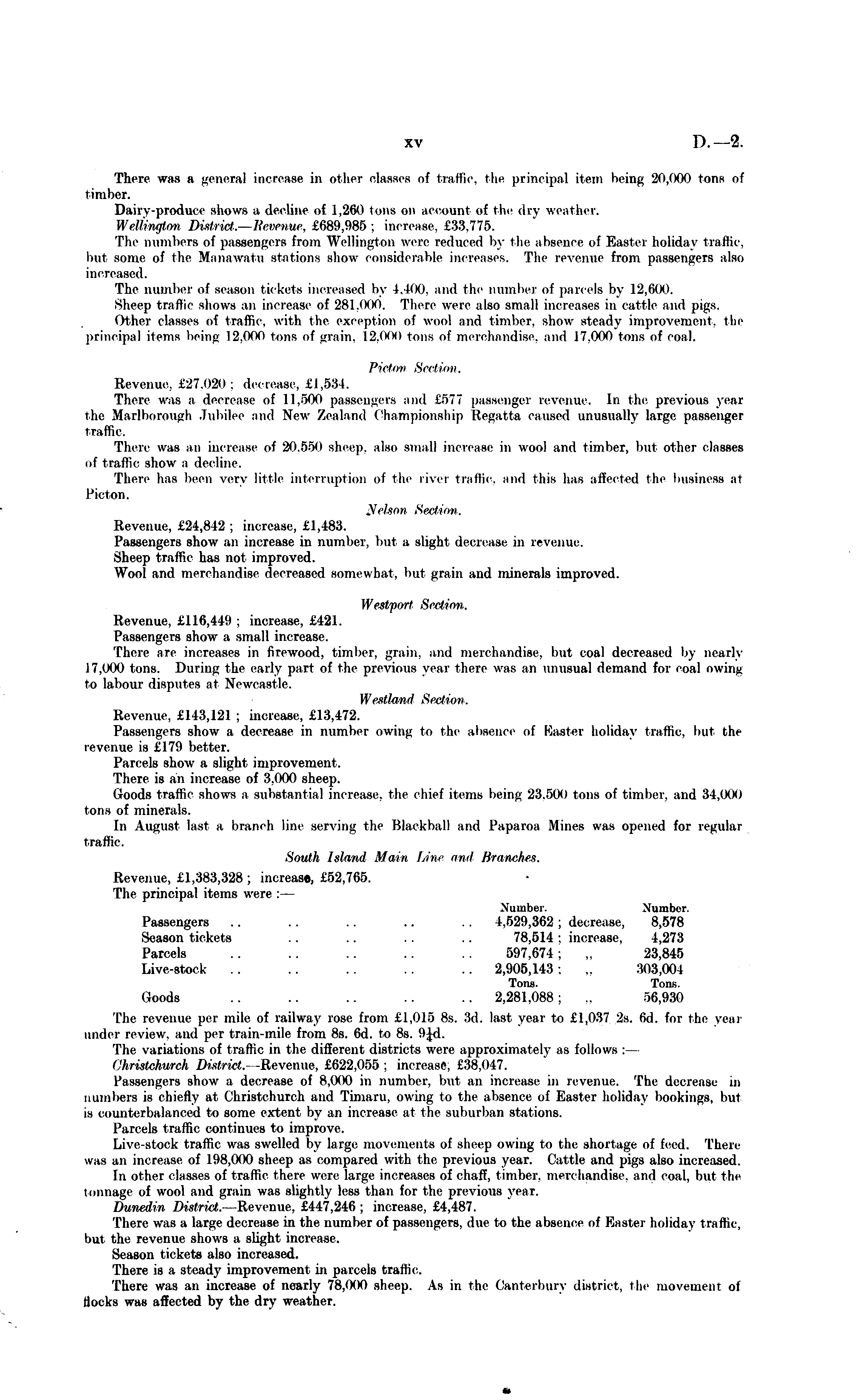 There was a general increase in other classes of traffic, the principal item doing 20,(>00 tons of timber. Dairy-produce shows a decline of 1,260 tons on account of the dry weather. Wellington District-.—Revenue. £689,985 ; increase, £33,775. The numbers of passengers from Wellington were reduced by the absence of Easter holiday traffic, but some of the Manawatu stations show considerable increases. Tin , revenue from passengers also increased. The number of season tickets increased by 1,400, and tin , number of parcels by 12,6(X). Sheep traffic shows .in increase of 281,000. There were also small increases in cattle and pigs. Other classes of traffic, with the exception of wool and timber, show steady improvement, the principal items being 12,000 tons of grain, 12.imm> tons of merchandise, and 17,000 tons of coal. I'iciiDi Section. Revenue, £27.020 : decrease, £1,534. There was a decrease of 11,600 passengers and to"? passenger revenue. In the. previous year the Marlborough Jubilee and New Zealand Championship Regatta caused unusually large passenger traffic. There was an increase of 20.550 sheep, also small increase in wool and timber, but other classes of traffic show a decline. There has been very little interruption of the river traffic, and this has affected the business ai Picton. SchuH Section. Revenue, £24,842 ; increase, £1,483. Passengers show an increase in number, but a slight decrease in revenue. Sheep traffic has not improved. Wool and merchandise decreased somewhat, bul grain and minerals improved. Westport Section. Revenue, £116,449 ; increase, £421. Passengers show a small increase. There are increases in firewood, timber, grain, and merchandise, but coal decreased by nearly 17,000 tons. During the early part of the previous year there was an unusual demand for coal owing to labour disputes at Newcastle. Westland Section. Revenue, £143,121 ; increase, £13,472. Passengers show a decrease in number owing to the absence oi Easter holiday traffic, but the revenue is £179 better. Parcels show a slight improvement. There, is an increase of 3,000 sheep. Goods traffic shows a substantial increase, the chief items being 23.500 tons of timber, and 34,(KH1 tons of minerals. In August last a branch line serving the Blackball and Paparoa Mines was opened for regular traffic. South Island Main Line timl Branches. Revenue, £1,383,328 ; increase, £52,765. The principal items were : — Number. Number. Passengers .. .. .. .. .. 4,529,362; decrease, 8,578 Season tickets .. .. . . .. 78,514 : increase, 4,273 Parcels .. .. .. .. .. 597,674: ~ 23,845 Live-stock .. .. .. .. .. 2,905,143: .. 303,004 Tons. Tons. Goods .. .. .. .. .. 2,281,088; .. 56,930 The revenue per mile of railway rose from £1,015 Bs. 3d. last year to £1,037 2s. (id. for the year under review, and per train-mile from Bs. 6d. to Bs. 9{d. The variations of traffic in the different districts were approximately as follows :— Chrislchurch District.- -Revenue, £622,055; increase, £38,047. Passengers show a decrease of 8,000 in number, but an increase in revenue. The decrease in numbers is chiefly at Christchurch and Timaru, owing to the absence of Easter holiday bookings, but is counterbalanced to some extent by an increase at the suburban stations. Parcels traffic continues to improve. Live-stock traffic was swelled by large movements of sheep owing to the shortage of feed. There was an increase of 198,000 sheep as compared with the previous year. Cattle and pigs also increased. In other classes of traffic there were large increases of chaff, timber, merchandise, and coal, hut the tonnage of wool and grain was slightly less than for the previous year. Dunedin District. —Revenue, £447,246 ; increase, £4,487. There was a large decrease in the number of passengers, due to the absence of Easter holiday traffic, but the revenue shows a slight increase. Season tickets also increased. There is a steady improvement in parcels traffic. There was an increase of nearly 78,000 sheep. As in the Canterbury district, the movement of docks was affected by the dry weather.