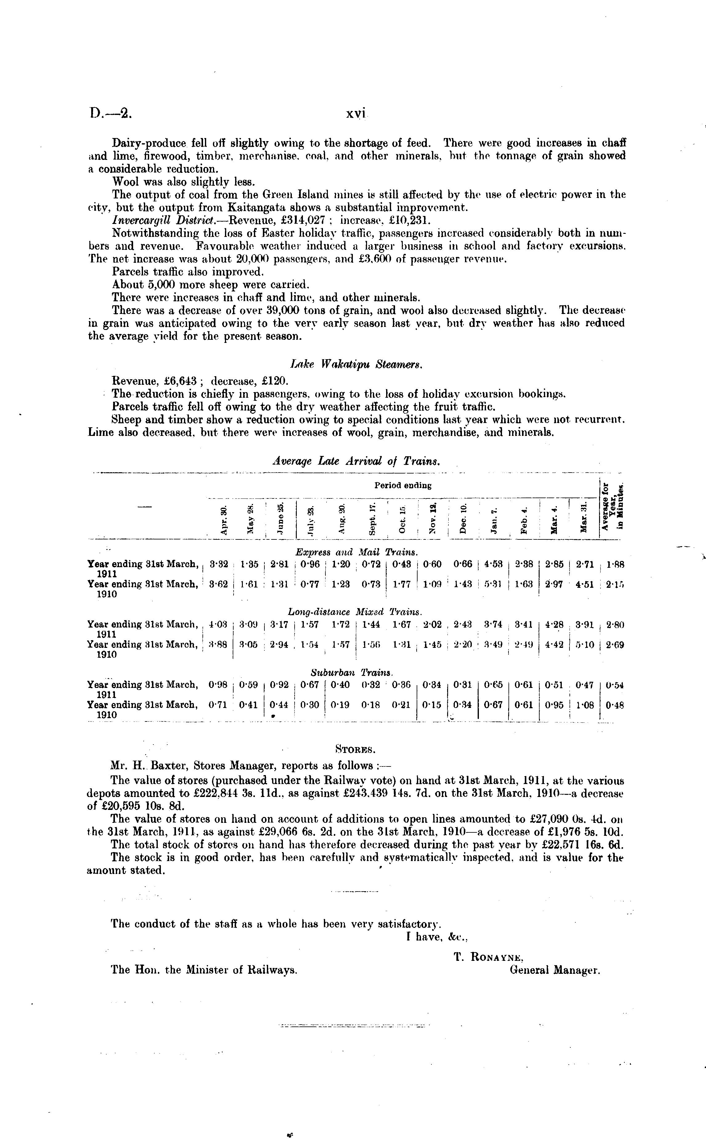Stores. Mγ. H. Baxter, Stores Manager, reports as follows : — The value of stores (purchased under the Railway vote) on hand at 31st March, 1911, at the various depots amounted to £222.8U Bs. lid., as against £243.439 14s. 7d. on the 31st March. 1910—a decrease of £20,595 10s. Bd. The value of stores on hand on account of additions to open lines amounted to £27,090 os. 4d. on the 31st March, 191 1. as against £29,066 6s. 2d. on the 31st March. 1910—a decrease of £1,976 ss. 10d. The total stock of stores on hand has therefore decreased during the past year by £22.571 16s. 6d. The stock is in good order, has been carefully and systematically inspected, and is value for the amount stated.