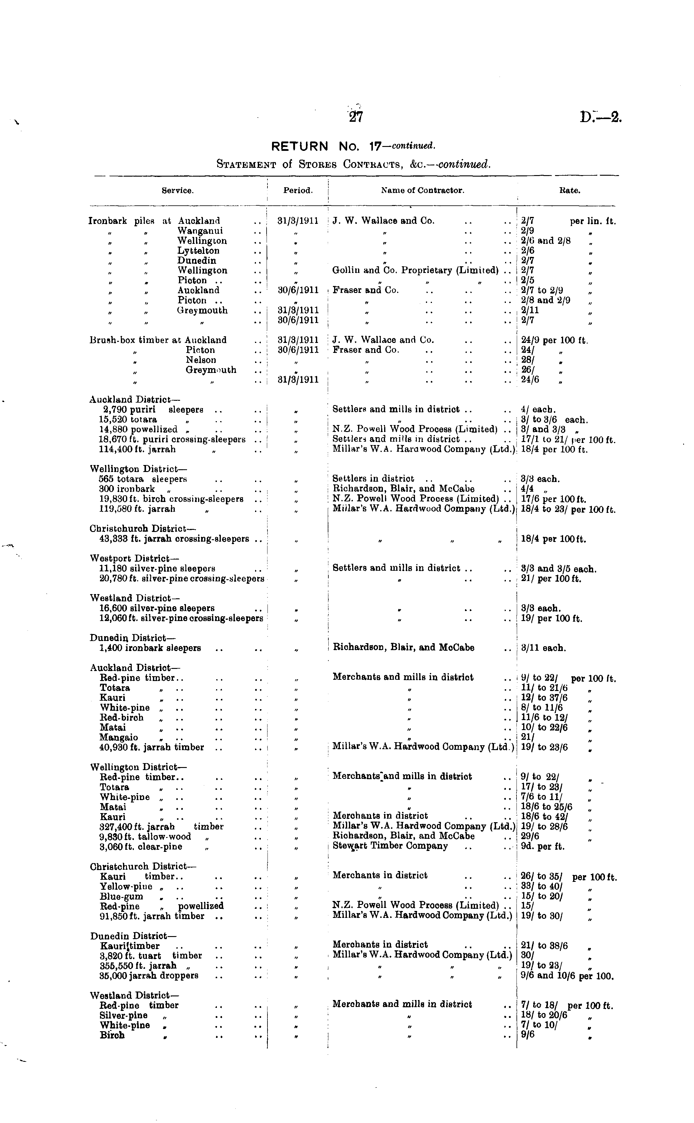 Service. Period. Name of Contractor. Kate. I Ironbark piles at Auckland .. 31/3/1911 J. W. Wallace and Go. .. ..2/7 per lin. ft. Wangaimi .. „ .... 2/9 Wellington ... „ .... 2/0 and 2/8 Lyttelton .. „ „ .... 2/6 Dunedin .. . „ .... 2/7 „ „ Wellington .. „ Golliii and Co. Proprietary (Limited) .. 2/7 „ Picton .. .. „ „ „ .. > 2/5 Auckland .. 30/6/1911 Fraser and Co. .. .. .. 2/7 to 2/9 Picton .. .. . „ .. .. .. 2/8 and 2/9 Hieymouth .. 31/3/1911 „ .. .. .. 2/11 .. 30/6/1911 „ .. .. ..2/7 Brush-box timber at Auckland .. 31/3/1911 J. W. Wallace and Co. .. .. 24/9 per 100 ft. Picton .. 30/6/1911 Fraser and Co. .. .. ..24/ Nelson .. ' „ „ .. .. .. 28/ Greymmth .. . „ .. .. .. 26/ „ .. 31/3/1911 : „ .. .. .. 24/6 Auckland District— 2,790 puriri sleepers .. .. » Settlers and mills in district .. .. 4/each. 15,520 totara „ .. , „ .. .. 3/ to 3/6 each. 14,880 powellized , .. .. „ N.Z. Powell Wood Process (Limited) .. 3/and 3/3 , 18,670 ft. puriri crossing-sleepers .. „ Settler-i and mills in district .. .. 17/1 to 21/per 100ft. 114,400 ft. jarrah „ .. „ Millar's W. A. Harowood Company (Ltd.) 18/4 per 100 ft. Wellington District — 565 totara sleepers .. .. „ Settlers in distriot .. .. .. 3/3 each. 300 ironbark , .. .. „ Richardson, Blair, and McCabe .. 4/4 „ 19,830ft. birch crossing-sleepers .. , N.Z. Powell Wood Process (Limited) .. 17/6 per 100ft. 119,580 ft. jarrah „ .. „ Millar's W.A. Hardwtiod Company (Ltd.) 18/4 to 23/per 100 ft. Cbristchuroh District — 43,333 ft. jarrah crossing-sleepers .. » „ 18/4 per 100ft. Westport District— 11,180 silver-pine sleepers .. „ Settlers and mills in district .. .. 3/3 and 3/5 each. '20,780 ft. silver-pine crossing-sleepers „ » .... 21/per 100 ft. Weetland District— 16,600 silver-pine sleepers ... . .... 3/3 each. 12,060 ft. silver-pine crossing-sleepers „ » .... 19/per 100 ft. Diinedin. District— 1,400 ironbark sleepers .. .. „ Riohardson, Blair, and MoCabe .. 3/11 each. Auckland District— Red-pine timber.. .. .. „ Merchants and mills in district .. 9/to 22/ per 100 (t. Totara „ .. .. .. . „ .. 11/ to 21/6 Kauri „ .. .. .. . . .. 12/ to 37/6 White-pine ........ . .. 8/to 11/6 Red-birch ......... . .. 11/6 to 12/ Matai „ .. .. .. . . .. 10/ to 22/6 Mangaio „ .. .. „ „ .. j 21/ 40,930 ft. jarrah timber .. .. . Millar's W.A. Hardwood Company (Ltd.) 19/to 23/6 Wellington District— Red-pine timber.. .. .. „ Merchants'and mills in district .. 9/to 22/ Totara „ .. .. .. . . .. 17/ to 23/ White-pine „ .. .. .. . . .. 7/6 to 11/ Matai ........ . .. 18/6 to 25/6 „ Kauri „ .. .. „ Merchants in district .. .. 18/6 to 42/ 327,400 ft. jarrah timber .. , Millar's W.A. Hardwood Company (Ltd.) 19/to 28/6 . 9,830ft. tallow wood „ .. „ Riohardson, Blair, and McCabe .. 29/6 3,060 ft. clear-pine „ .. „ Stewart Timber Company .. .. 9d. per ft. Christchurch District— Kauri timber.. .. .. „ Merchants in district .. .. > 26/to 35/ per 100 ft Yellow-pine „ .. .. .. . -, .. .. 33/ to 40/ Blue-gum ... .. .. . . .. .. 15/ to 20/ Red-pine . powellized .. „ N.Z. Powell Wood Process (Limited) .. 15/ 91,850 ft. jarrah timber .. .. „ Millar's W.A. Hardwood Company (Ltd.) 19/to 30/ Dunedin Distriot — Kaurijtimber .. .. .. » Merchants in district .. .. 21/ to 38/6 3,820 ft. tuart timber .. .. „ Millar's W.A. Hardwood Company (Ltd.) 30/ 355,550 ft. jarrah ...... „ „ „ 19/ to 23/ 35,000 jarrah droppers ..... . . „ 9/6 and 10/6 per 100. Westland District— Red-pine timber .. .. . Merohants and mills in district .. 7/to 18/ per 100 ft. Silver-pine „ .. .. „ . .. 18/ to 20/6 White-pine . .. .. . . „ .. 7/ to 10/ Birch . ..... . ..9/6