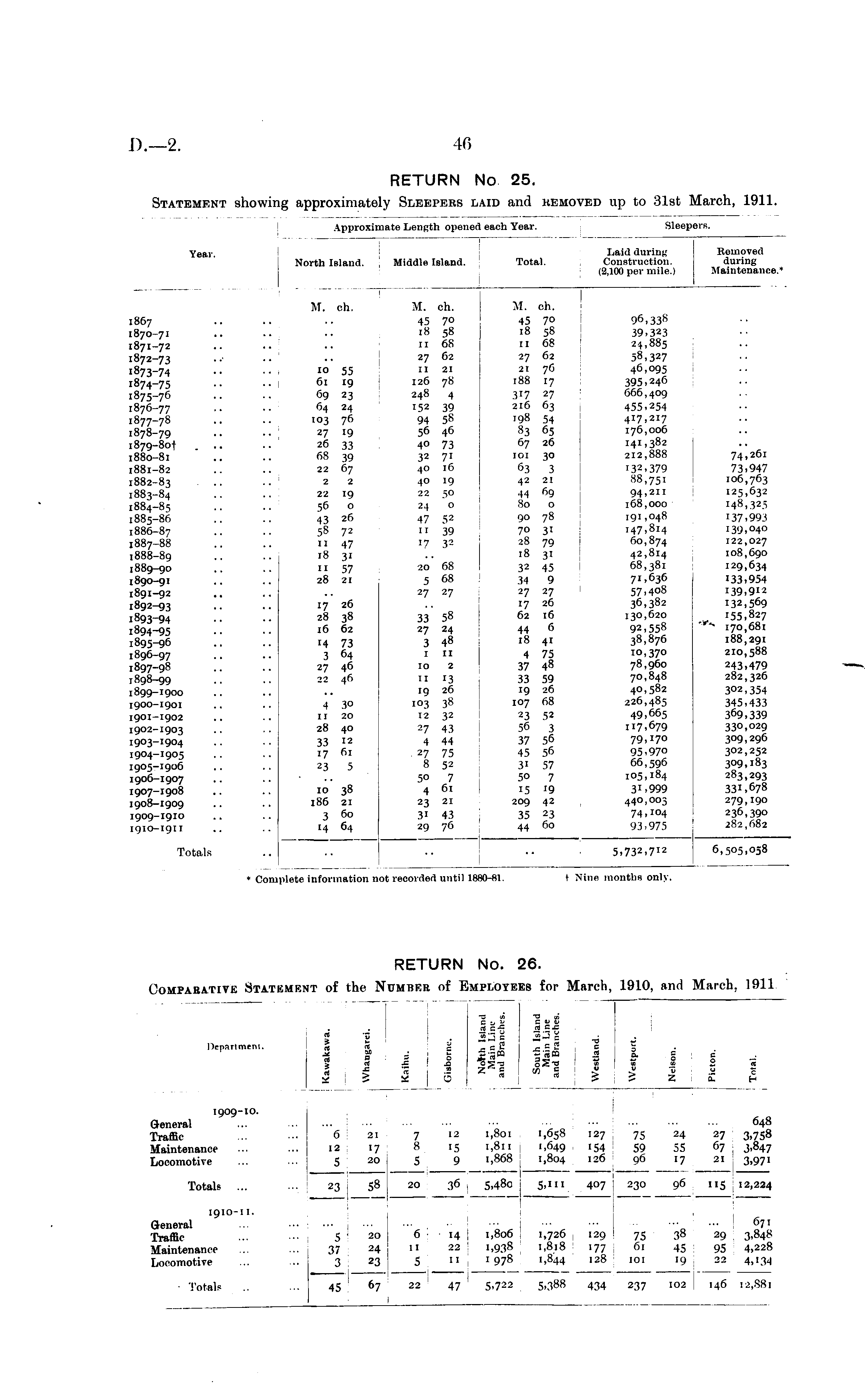 RETURN No 25. Statement showing approximately Sleepers laid and removed up to 31st March, 1911.