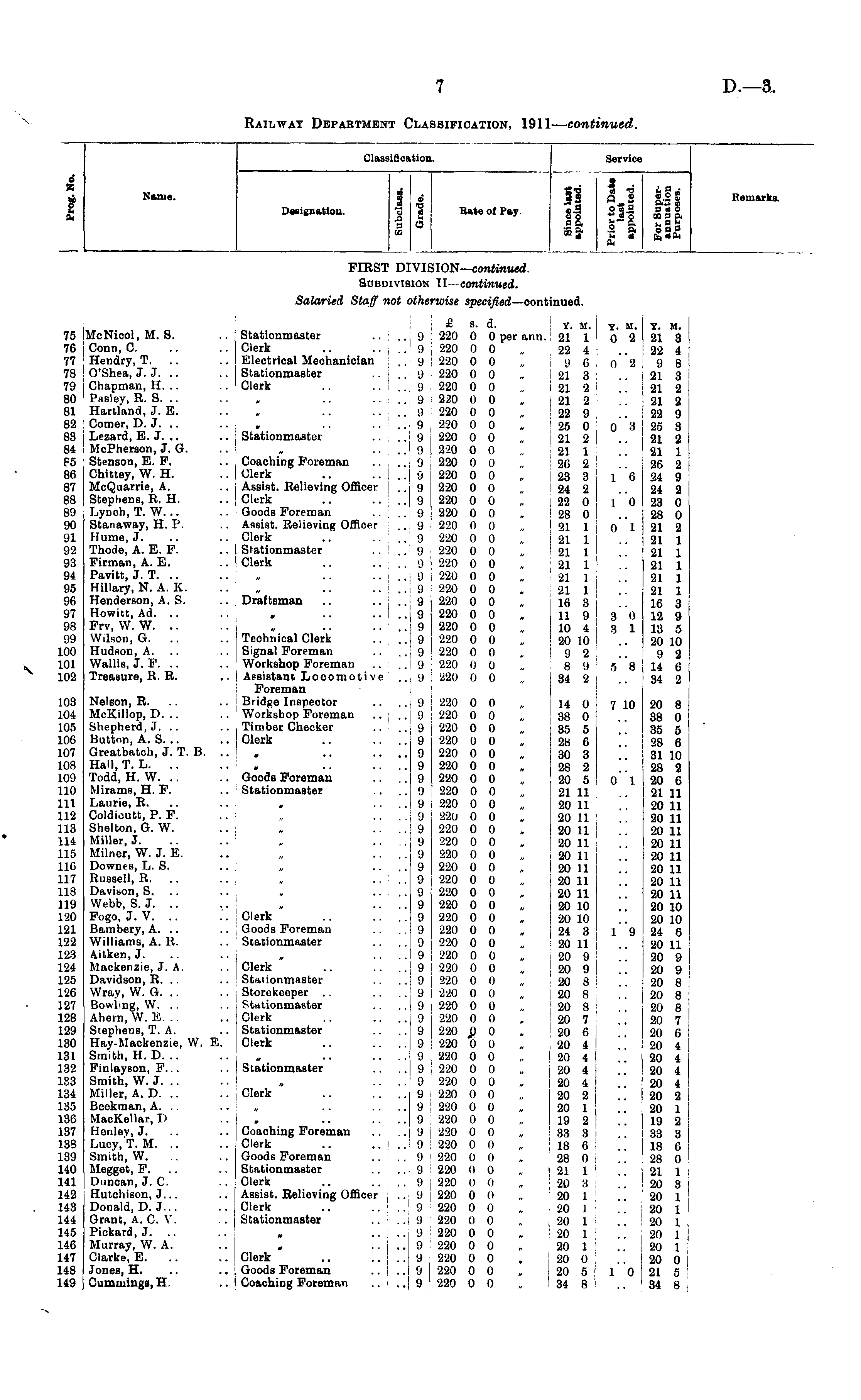 Classification. Service Name. Designation. •i i » 6 1C Rate of Fay si O as 2 9 4 O I I sSjj Kern arks. PIEST DI SCBDIVISI VIS [ON II ON— continued. II continued. Salaried Staff not o ith» ■wise specified— oonti inued. 75 76 77 78 79 80 81 82 83 84 F5 86 87 88 89 90 91 92 93 94 95 96 97 98 99 100 101 102 McNiool, M. S. .. j Stationmaster .. .. Conn, C. .. .. Clerk Hendry, T. .. .. Electrical Mechanician O'Shea, J. J. .. .. Stationmaster Chapman, H. .. . Clerk i Pasley, R. S. .. .. . .. .... Hattland, J. E. .. „ .. .... Comer, D. J. .. .. „ .. .... Lezard, E. J. .. .. Stationmaster McPherson, J. G. .. , .... Stenson, E. P. .. Coaching Foreman Chittey, W. H. .. i Ulerk .. .... McQuarrie, A. ... Assist. Relieving Officer Stephens, R. H. .. Clerk Lynch, T. W... .. Goods Foreman Stanaway, H. P. .. Assist. Relieving Officer Hume, J. .. .. j Clerk .. .. .. Thode, A. E. F. .. I Stationmaster . . Firman, A. E. .. ] Clerk .. .. Pavitt, J. T. .. .. , .. .... Hillary, N. A. K. .. , .. .. .. Henderson, A. S. .. Draftsman Howit.t, Ad. .. .. , .. .... Frv, W. W. .. .. . .. .... Wilson, G. .. .. Teohnieal Clerk Hudson, A. ., Signal Foreman Wallis, j. F. .. . . Workshop Foreman Treasure, R. R. .. Apsistanc Locomotive .. Foreman Nelson, R. .. .. Bridge Inspector McKillop, D. .. .. Workshop Foreman Shepherd, J. .. .. Timber Checker Button, A. S. .. .. Clerk .. .. .. Greatbatch, J. T. B. .. . .. .. .. Hall, T. L. .. .. . .. .... Todd, H. W. .. .. Goods Foreman .. Mirams, H. F. .. Stationmaster Laurie, R. .. .. „ .... Coldicutt, P. F. Shelton, G. W. Miller, J. Milner, W. J. E. .. „ .... Downes, L. S. .. „ .... Russell, R. .. .. „ .... Davison, S. .. .. . .. .. Webb, S. J. .. .. . ... Fogo, J. V. .. .'. Clerk .. .... Bambery, A. .. .. Goods Foreman Williams, A. R. .. Scationmaster Aitken, J. .. » .... Mackenzie, J. A. .. Clerk Davidson, R. .. .. St&iionmaster Wray, W. G. .. . . Storekeeper Bowling, W. .. .. Stationmaster Ahem, W. E. .. .. Clerk .. .. .. Stephens, T. A. .. Stationmaster Hay-Mackenzie, W. E. Clerk .. .. Smith, H. D. .. . . „ .. .... Finlayson, F... .. Stationmaster Smith, W. J. .. .. , .... Miller, A. D. .. .. Clerk .. .. .. Beekman, A. . .. „ .. .... MacKellar, D .. . .. .. .. Henley, J. .. .. Coaching Foreman Lucy, T. M. .. .. Clerk .. .. I .. Smith, W. .. .. Goods Foreman Megget, F. .. .. | Stationmaater Duncan, J. C. .. Clerk .. .. Hutchison, J... .. I Assist. Relieving Officer j Donald, D. J... .. Clerk .. Grant, A. O. V. .. Stationmaster Pickard, J. .. .. , .... Murray, W. A. .. . ... Clarke, E. .. ,. Clerk .. .. Jones, H. .. .. Goods Foreman i Cumaiings, H. .. Coaching Foreman '.) 9 9 9 g 9 9 g g 0 9 9 9 9 9 9 9 9 9 9 9 9 'J 9 9 9 •i 9 £ s. d. 220 0 0 per aim. 220 0 0 220 0 0 220 0 0 220 0 0 220 0 0 220 0 0 220 0 0 220 0 0 220 0 0 220 0 0 220 0 0 220 0 0 220 0 0 220 0 0 220 0 0 220 0 0 220 0 0 220 0 0 220 0 0 220 0 0 220 0 0 220 0 0 220 0 0 220 0 0 220 0 0 220 0 0 220 0 0 Y. M. 21 1 22 4 9 6 21 3 21 2 21 2 22 9 25 0 21 2 21 1 26 2 23 3 24 2 22 0 28 0 21 1 21 1 21 1 21 1 21 1 21 1 16 3 11 9 10 4 20 10 9 2 8 9 34 2 y. m. 0 2 0 2 0 3 16 10 Y. M. 21 3 22 4 9 8 21 3 21 2 21 2 22 9 25 3 21 2 21 1 26 2 24 9 24 2 23 0 28 0 21 2 21 1 21 1 21 1 21 1 21 1 16 3 12 9 18 6 20 10 9 2 14 6 34 2 0 1 8 ii 3 1 s"8 103 104 105 106 107 108 109 110 111 112 113 114 115 11G 117 118 119 120 121 122 123 124 125 126 127 128 129 130 131 132 133 134 135 136 137 138 139 140 141 142 143 144 145 146 147 148 149 9 '.! 9 9 9 9 9 '.) 9 9 9 9 9 9 g 9 9 9 9 9 II 9 9 9 9 9 9 9 ii 9 g 9 !) g 9 9 9 1) 9 9 9 :i 9 '.i 'J 9 9 220 0 0 220 0 0 220 0 0 220 0 0 220 0 0 220 0 0 220 0 0 220 0 0 220 0 0 220 0 0 220 0 0 220 0 0 220 0 0 220 0 0 220 0 0 220 0 0 220 0 0 220 0 0 220 0 0 220 0 0 220 0 0 220 0 0 220 0 0 220 0 0 220 0 0 220 0 0 220 p 0 220 0 0 220 0 0 220 0 0 220 0 0 220 0 0 220 0 0 220 0 0 220 0 0 220 0 0 220 0 0 220 0 0 220 0 0 220 0 0 220 0 0 220 0 0 220 0 0 220 0 0 220 0 0 220 0 0 220 0 0 14 0 38 0 35 5 28 6 30 3 28 2 20 5 21 11 20 11 20 11 20 11 20 11 20 11 20 11 20 11 20 11 20 10 20 10 24 3 20 11 20 9 20 9 20 8 20 8 20 8 20 7 20 6 20 4 20 4 20 4 20 4 20 2 20 1 19 2 33 3 18 6 28 0 21 1 20 3 20 1 20 1 20 1 20 1 20 1 20 0 20 5 34 8 7 10 0 1 19 20 8 38 0 35 5 28 6 31 10 28 2 20 6 21 11 20 11 20 11 20 11 20 11 20 11 20 11 20 11 20 11 20 10 20 10 24 6 20 11 20 9 20 9 20 8 20 8 20 8 20 7 20 6 20 4 20 4 20 4 20 4 20 2 20 1 19 2 33 3 18 0 28 0 21 1 20 3 20 1 20 1 20 1 20 1 20 1 20 0 21 5 34 8 10