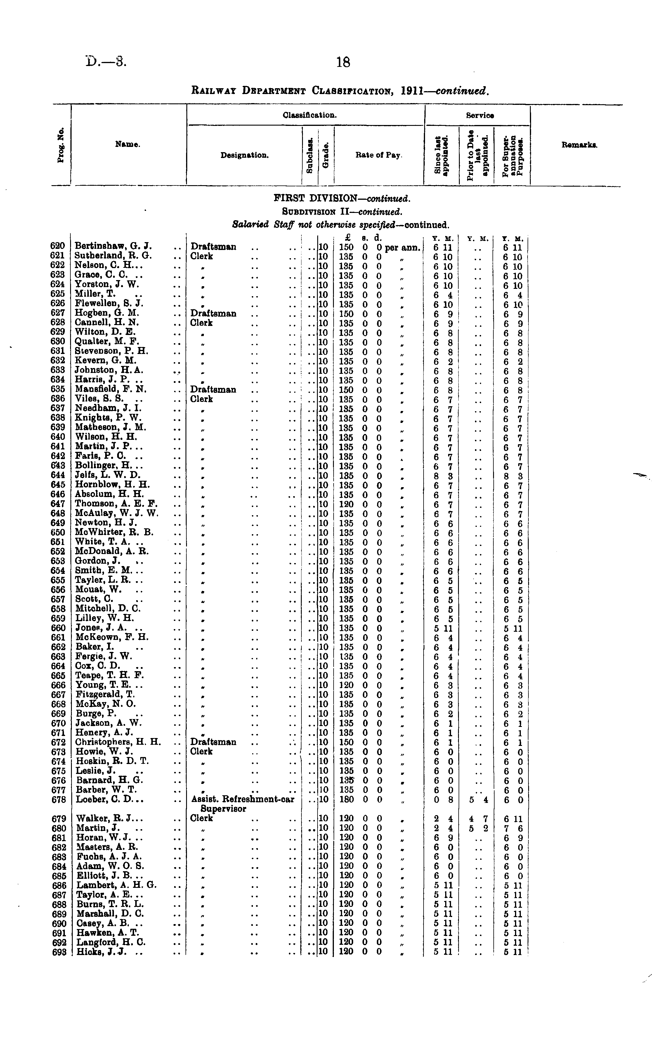 Clasi sificatioi Service & Name. ! 5 i Ss 0 2 8,5 5 3 0 ■" « o so o 0. jja § a s§s "S , g 2 g.d. Remarks. Designation. Rate of Pay FIRS' ! d: [VI! 1I0N— continued. Sub: IIVI! SION II— continued. 620 621 622 623 624 625 626 627 628 629 630 631 632 633 634 635 636 637 638 639 640 641 642 643 644 645 646 647 648 649 050 651 652 653 654 655 656 657 658 659 660 661 662 663 664 665 666 667 068 669 670 671 672 673 674 675 676 677 678 Bertinshaw, G. J. Sutherland, R. G. Nelson, C. H... Grace, C. C. Yorston, J. W. Miller, T. Flewellen, S. J. Hogben, G. M. Cannell, H. N. Wilton, D. E. Qualter, M. F. Stevenson, P. H. Kevern, G. M. Johnston, H. A. Harris, J. P. Mansfield, F. N. Viles, S. S. Needham, J. I. Knights, P. W. Matheson, J. M. Wilson, H. H. Martin, J. P. .. Faris, P. C. Bollinger, H. .. Jelfs, L. W. D. Hornblow, H. H. Absolum, H. H. Thomson, A. E. F. McAulay, W. J. W. Newton, H. J. MoWhirter, R. B. White, T. A. .. McDonald, A. R. Gordon, J. >. Smith, E. M... Tayler, L. R. Mouat, W. .. Scott, 0. Mitchell, D. C. Lilley, W. H. Jonee, J. A. McKeown, F. H. Baker, I. Fergie, J. W. Cox, CD. Teape, T. H. F. Young, T. E. Fitzgerald, T. McKay, N. O. Burge, P. Jackson, A. W. Henery, A. J. Christophers, H. H. Howie, W. J. Hoskin, R. D. T. Leslie, J. Barnard, H. G. Barber, W. T. Loeber, CD... Salaried Staff i Draftsman Clerk m ■ * • • Draftsman Clerk Draftsman Clerk „ . . • . ,ot c >the.: 10 10 10 10 10 10 10 10 10 10 10 10 10 10 10 10 10 10 10 10 10 10 10 10 10 10 10 10 10 10 10 10 10 10 10 10 10 10 10 10 10 10 10 10 10 10 10 10 10 10 10 10 10 10 10 10 10 10 10 ■wise specified— oonl £ e. d. 150 0 0 per ann. 135 0 0 135 0 0 135 0 0 135 0 0 135 0 0 135 0 0 150 0 0 135 0 0 135 0 0 135 0 0 135 0 0 135 0 0 135 0 0 135 0 0 150 0 0 135 0 0 135 0 0 135 0 0 135 0 0 135 0 0 135 0 0 135 0 0 135 0 0 135 0 0 135 0 0 135 0 0 120 0 0 135 0 0 135 0 0 135 0 0 135 0 0 135 0 0 135 0 0 135 0 0 135 0 0 135 0 0 135 0 0 135 0 0 135 0 0 135 0 0 135 0 0 135 0 0 135 0 0 135 0 0 135 0 0 120 0 0 135 0 0 135 0 0 135 0 0 135 0 0 135 0 0 150 0 0 135 0 0 135 0 0 135 0 0 135 0 0 135 0 0 180 0 0 ;inued. I Y. M. 6 11 i 6 10 ! 6 10 i 6 10 1 6 10 6 4 6 10 6 9 6 9 6 8 6 8 6 8 6 2 6 8 6 8 6 8 6 7 6 7 6 7 6 7 6 7 6 7 6 7 6 7 8 3 6 7 6 7 6 7 6 7 6 6 6 6 6 6 6 6 6 6 6 6 6 5 6 5 6 5 6 5 6 5 5 11 6 4 6 4 6 4 6 4 6 4 6 3 6 3 6 3 6 2 6 1 6 1 6 1 6 0 6 0 6 0 6 0 6 0 0 8 Y. M. T. M. 6 11 6 10 6 10 6 10 6 10 6 4 6 10 6 9 6 9 6 8 6 8 6 8 6 2 6 8 6 8 6 8 6 7 6 7 6 7 6 7 6 7 6 7 6 7 6 7 8 3 6 7 6 7 6 7 6 7 6 6 6 6 6 6 6 6 6 6 6 6 6 5 6 5 6 5 6 5 6 5 5 11 6 4 6 4 6 4 6 4 6 4 6 3 6 3 6 3 6 2 6 1 6 1 6 1 6 0 6 0 6 0 6 0 6 0 6 0 * < * . • * • • • * • • • . • 0 - • ■ • Draftsman Clerk Assist. Refreshment-oar Supervisor Clerk 5 4 679 680 681 682 683 684 685 686 687 688 689 690 691 692 693 Walker, R.J... Martin, J. Horan.W.J. .. Masters, A. R. Puchs, A. J. A. Adam, W. O. S. Elliott, J. B. .. Lambert, A. H. G. Taylor, A. E. .. Burns, T. R. L. Marshall, D. C. Casey, A. B. Hawken, A. T. Langford, H. C. Hicks, J.J. .. 10 10 10 10 10 10 10 10 10 10 10 10 10 10 10 120 0 0 120 0 0 120 0 0 120 0 0 120 0 0 120 0 0 120 0 0 120 0 0 120 0 0 120 0 0 120 0 0 120 0 0 120 0 0 120 0 0 120 0 0 2 4 2 4 6 9 6 0 6 0 6 0 6 0 5 11 5 11 5 11 5 11 5 11 5 11 5 11 5 11 4 7 5 2 6 11 7 6 6 9 6 0 6 0 6 0 6 0 5 11 5 11 5 11 5 11 5 11 5 11 5 11 5 11